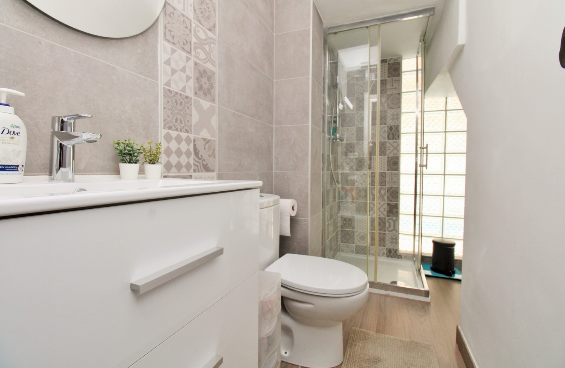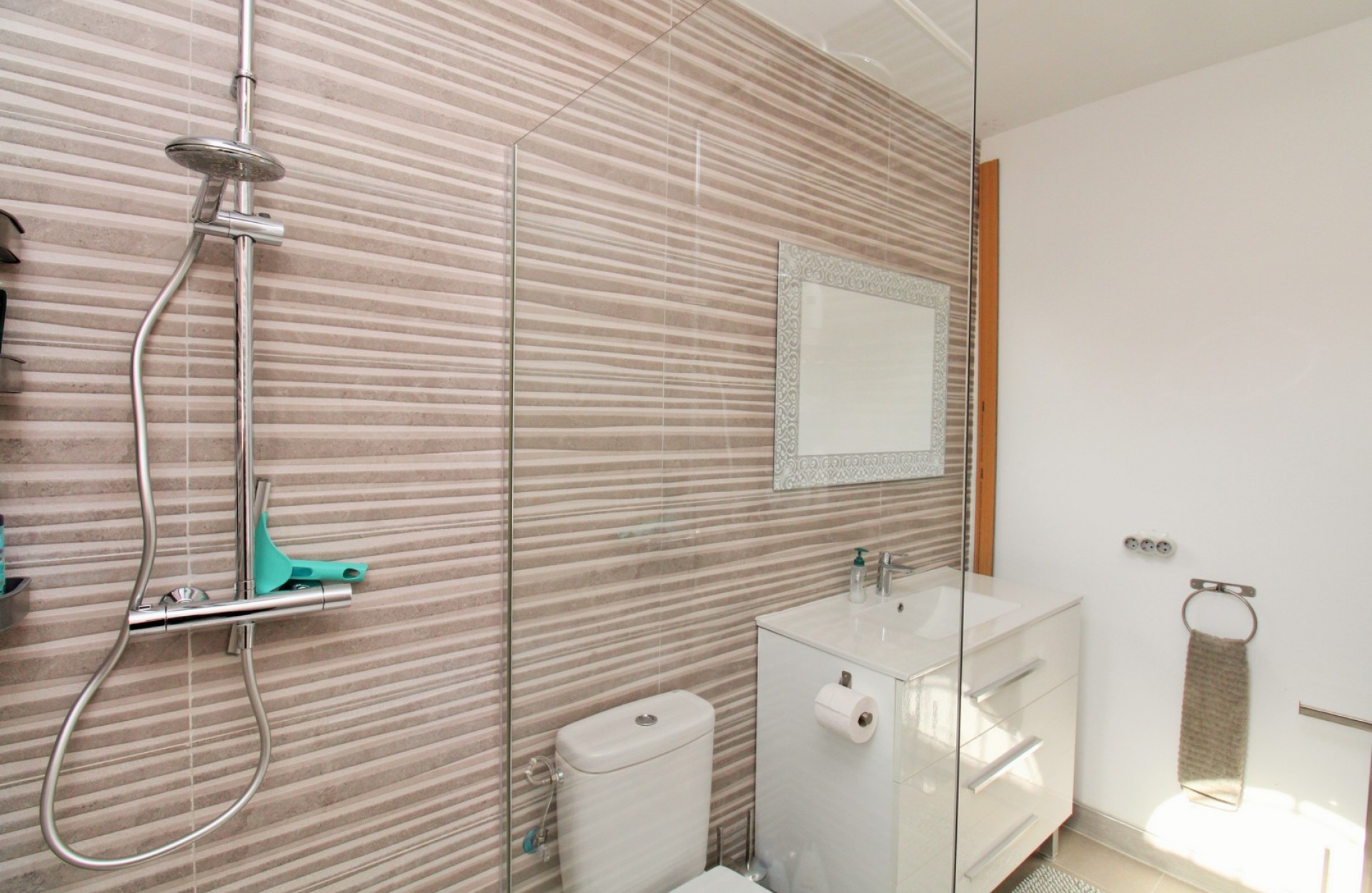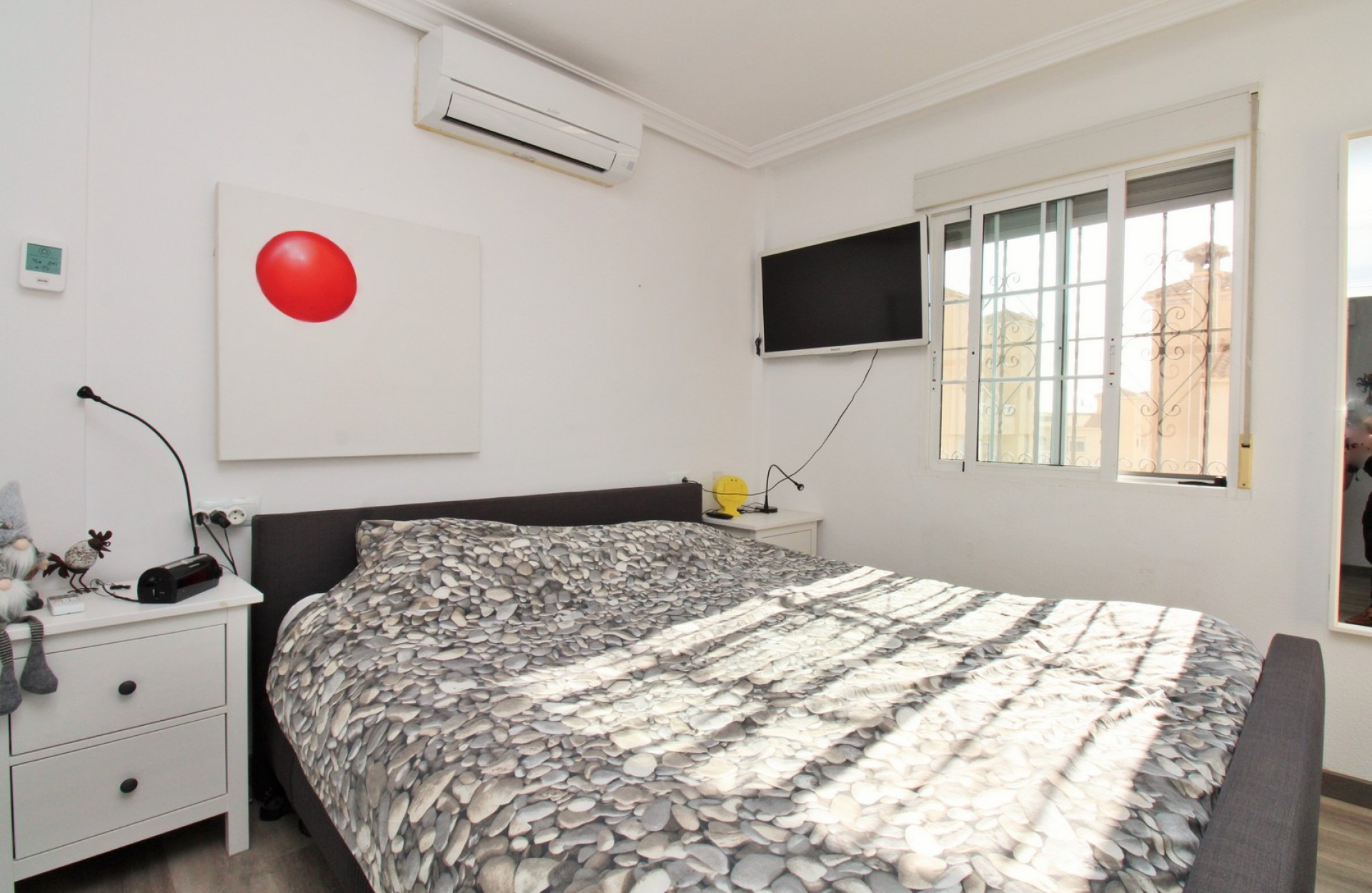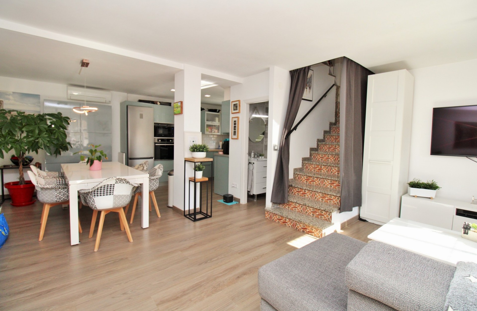 Este impresionante chalet adosado estilo Zodiaco se encuentra en la codiciada comunidad residencial Zodiaco V en Villamartin y ha sido completamente reformado con un alto nivel de calidad. Las mejoras incluyen nuevos suelos, cocina, baños, instalaciones eléctricas, enlucido y alumbrado, creando un hogar moderno y listo para disfrutar. La vivienda se asienta sobre una amplia parcela privada con gran terraza embaldosada y piscina privada con zona de jacuzzi que también puede calentarse, ideal para todo el año. Hay mucho espacio para comer al aire libre, tomar el sol o recibir invitados, y los residentes también disfrutan del uso de una piscina comunitaria situada muy cerca. En el interior, la planta baja ofrece un luminoso salón-comedor, moderna cocina al fondo y un baño contemporáneo con ducha a ras de suelo y zona de lavandería. En la planta superior hay dos dormitorios dobles con armarios empotrados y un baño familiar reformado, también con ducha. El dormitorio principal dispone de su propio balcón privado. Desde el rellano, unas escaleras conducen al solárium, un espacio encantador con césped artificial, perfecto para relajarse o entretenerse, con un práctico trastero bajo la escalera. En el nivel del solárium hay una habitación adicional con aire acondicionado que puede usarse como tercer dormitorio, oficina o espacio de almacenaje. La propiedad se vende parcialmente amueblada, con electrodomésticos y aire acondicionado. Zodiaco V goza de una ubicación privilegiada, a solo 500 metros de tiendas, bares, restaurantes y parada de autobús. El popular centro comercial La Fuente y la Plaza Villamartin están a unos 20 minutos a pie, mientras que las playas, cuatro campos de golf y el centro comercial Zenia Boulevard se encuentran a pocos minutos en coche. Un hogar Zodiaco único y bellamente renovado — se recomienda su visita.