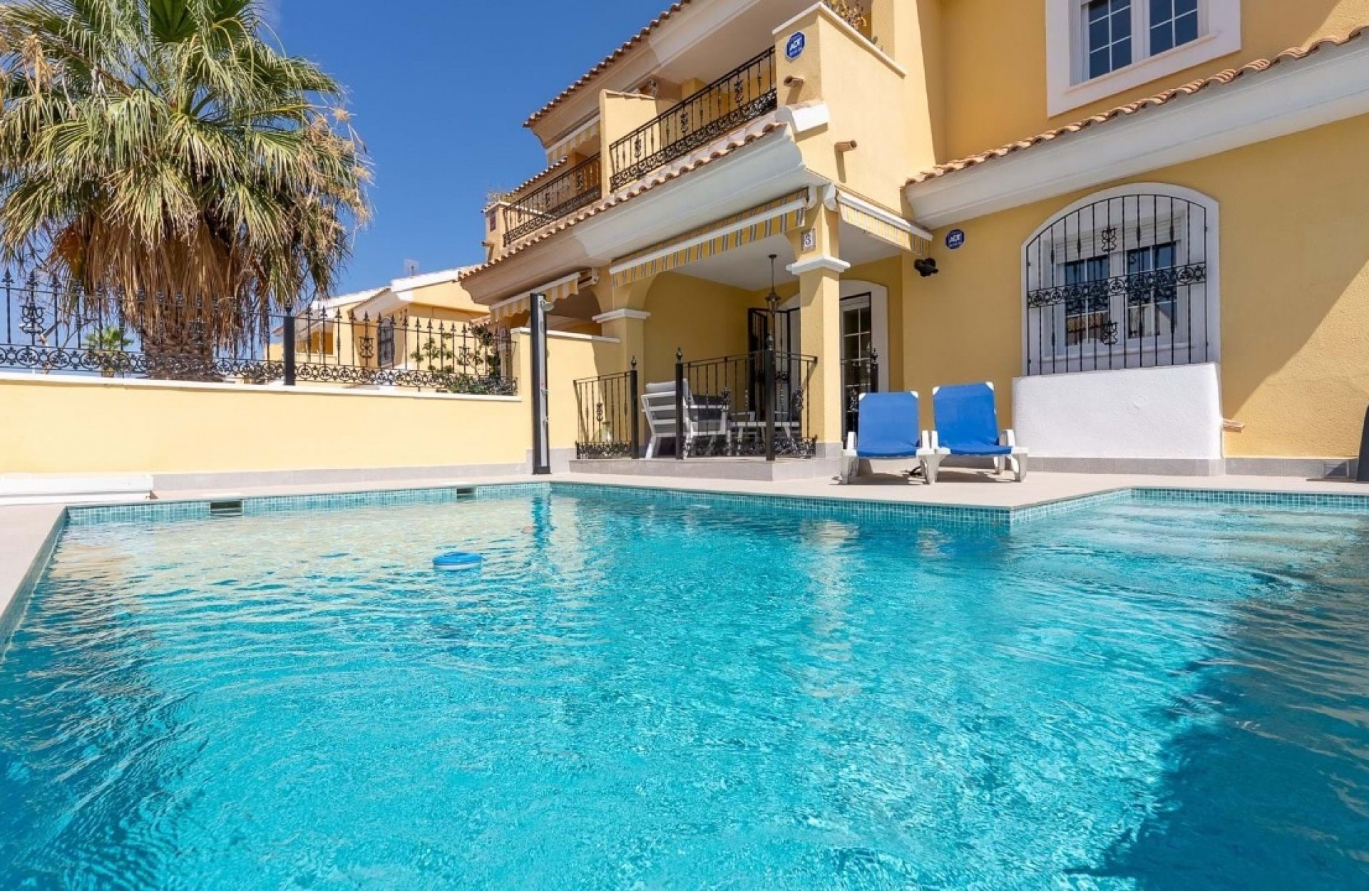 Ubicada en la conocida comunidad residencial de Costa Flamenca Golf en Los Dolses, esta villa pareada de 3 dormitorios y 2 baños ofrece un equilibrio ideal entre comodidad, estilo y espacios exteriores. Situada a poca distancia a pie del centro comercial La Zenia Boulevard, bares y restaurantes, y a solo unos minutos en coche de las playas galardonadas de Orihuela Costa, es perfecta tanto como residencia permanente como para escapadas vacacionales. La propiedad ha sido renovada con buen gusto en los últimos años, incluyendo nuevas ventanas y puertas exteriores, un baño principal reformado y la incorporación de una piscina privada. El interior es luminoso, acogedor y listo para entrar a vivir, con muebles negociables. La planta baja cuenta con un dormitorio doble, un baño con ducha moderna y un amplio salón de planta abierta muy luminoso. Una estufa de pellets aporta calidez en los meses más fríos, y la cocina moderna se abre a una terraza trasera usada como zona de lavandería y almacenamiento. En la planta superior se encuentran dos amplios dormitorios dobles, incluido el dormitorio principal con su propia terraza privada con vistas a la piscina, un lugar ideal para relajarse. El baño principal en este nivel ha sido renovado con un elegante plato de ducha. Entre sus extras se incluyen aire acondicionado en toda la vivienda, espacios exteriores cuidados y aparcamiento privado. Con su ubicación privilegiada y sus mejoras de calidad, esta es una casa lista para disfrutar desde el primer día.