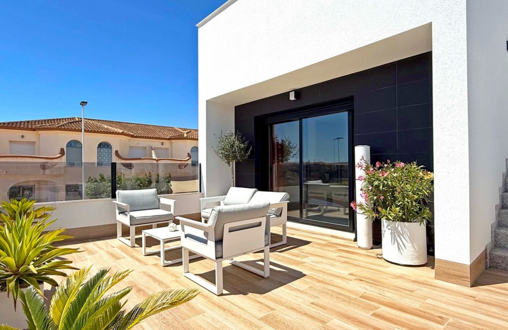 Descubre esta elegante villa independiente orientada al sur, construida en 2024 y en estado impecable. Situada en el corazón de San Pedro del Pinatar, esta vivienda de dos dormitorios y dos baños destaca por sus acabados de alta calidad y numerosos extras. La vivienda ofrece un salón ampliado y luminoso con acceso directo a las zonas exteriores. Disfruta de un balcón privado y un gran solárium con cocina exterior totalmente equipada, iluminación, y una moderna pérgola, ideal para relajarse o recibir invitados. Características adicionales: Garaje privado con armarios a medida. Posibilidad de convertirlo en un tercer dormitorio con baño. Escalera exterior al solárium Reguladores de intensidad de luz Enchufes adicionales por toda la casa Puertas correderas adicionales en el salón para mayor luminosidad y accesibilidad. Una opción perfecta como vivienda habitual o casa de vacaciones moderna y cómoda.