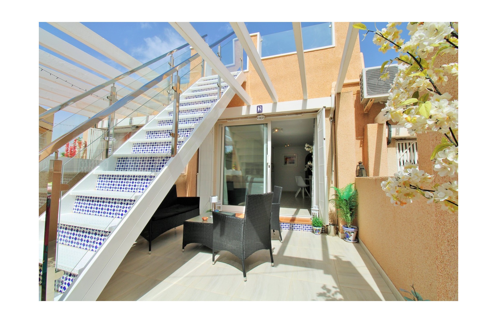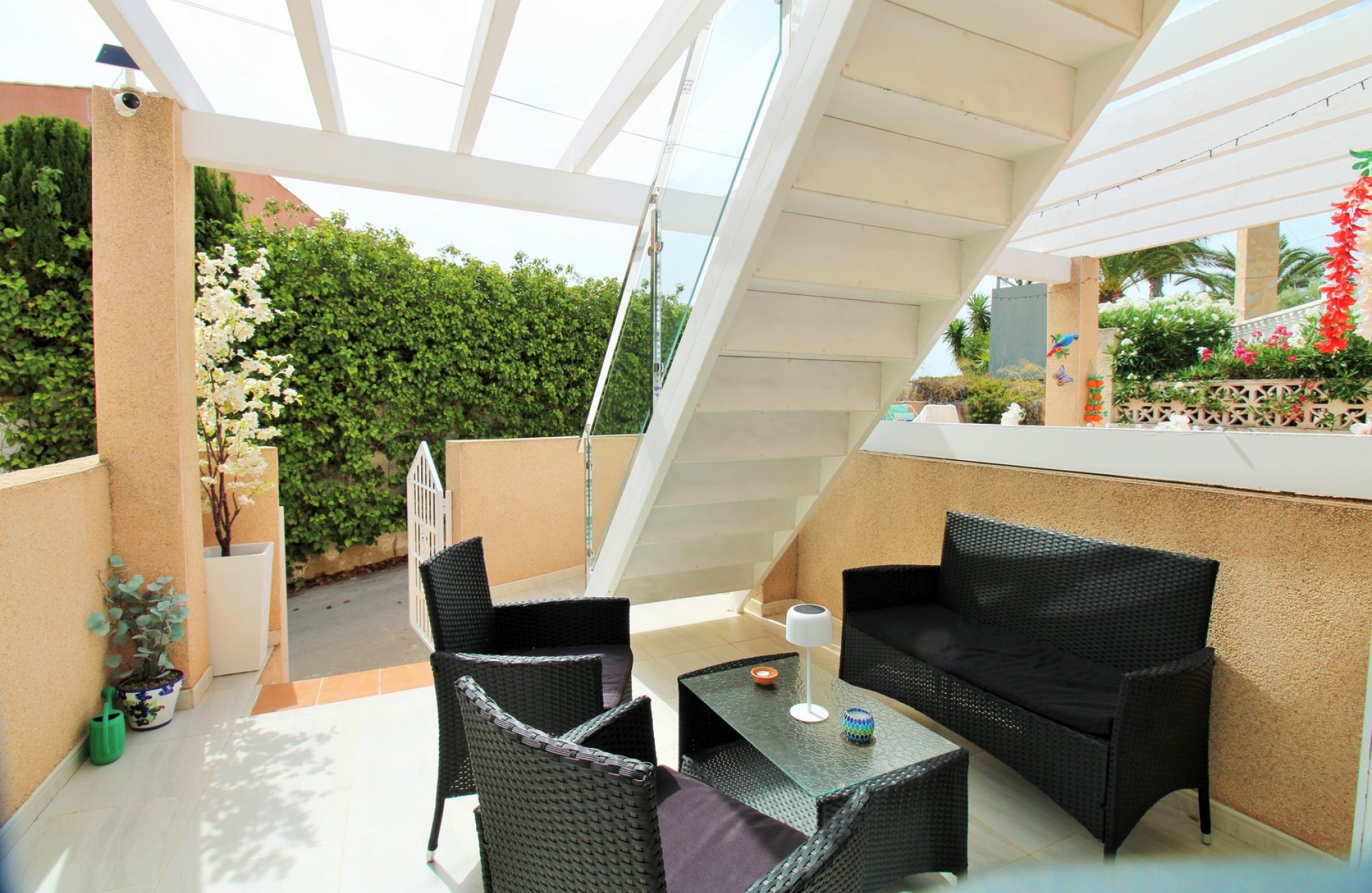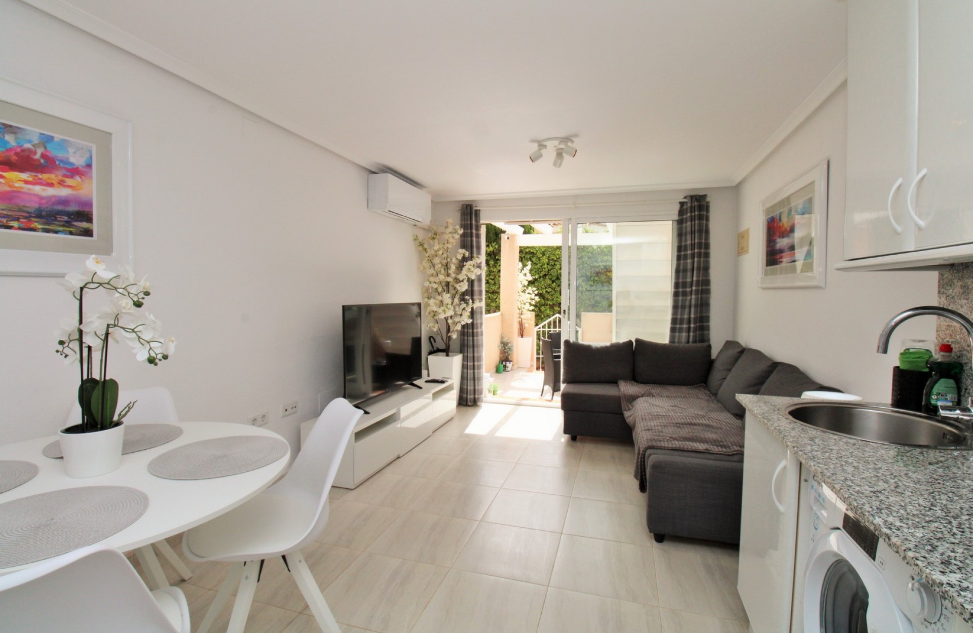 Este encantador bungalow de una sola planta se encuentra en una zona tranquila y muy solicitada de Villamartín, a pocos minutos a pie de bares, restaurantes, tiendas y transporte público. Luminoso, acogedor y muy bien presentado, la propiedad se vende parcialmente amueblada e incluye electrodomésticos, lista para disfrutar desde el primer día. La vivienda dispone de un amplio salón-comedor de concepto abierto con cocina moderna totalmente equipada, creando un espacio cómodo y funcional. Cuenta con un dormitorio doble con armarios empotrados y un elegante baño completamente equipado. Las grandes ventanas permiten la entrada de abundante luz natural, proporcionando un ambiente luminoso y agradable. En la parte frontal se encuentra una terraza privada con suelo de baldosa, ideal para disfrutar del clima mediterráneo. Una escalera exterior conduce al amplio solárium privado en la azotea, desde donde se pueden disfrutar vistas abiertas al mar y al entorno, perfecto para relajarse o reunirse con amigos. La propiedad está situada en una tranquila calle privada sin tráfico, ofreciendo un entorno relajado pero cerca de todos los servicios. También dispone de internet de fibra óptica de alta velocidad (FTTH) y, al no contar con piscina comunitaria, los gastos de comunidad son bajos. A pocos minutos a pie se encuentra el nuevo Marimba Blue pool bar con gran piscina, así como un nuevo campo de mini golf, perfecto para pasar un día relajado. Las playas de Orihuela Costa, el centro comercial Zenia Boulevard y varios campos de golf se encuentran a menos de 10 minutos en coche, lo que convierte esta propiedad en una excelente vivienda vacacional, inversión o residencia permanente.