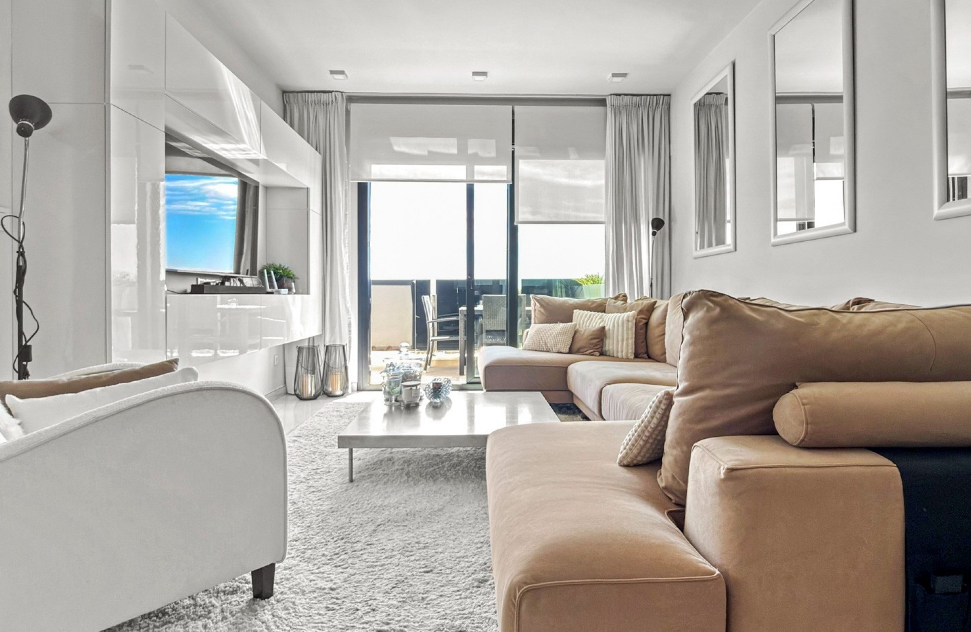 Descubra un estilo de vida costero refinado con este excepcional apartamento de 3 dormitorios y 2 baños, idealmente ubicado a pocos pasos del mar y cerca de bares, restaurantes, tiendas y supermercados. Perfecto como residencia vacacional, inversión de alquiler o vivienda habitual. Cuenta con una amplia terraza envolvente con acceso desde los tres dormitorios y vistas panorámicas al mar. El dormitorio principal dispone de baño en suite, mientras que los otros dos dormitorios ofrecen espacio para familia o invitados, junto a un segundo baño completo. Se vende completamente amueblado con mobiliario de diseño de alta calidad. Incluye aire acondicionado por conductos, persianas eléctricas, suelo radiante en los baños, plaza de aparcamiento doble y trastero. La urbanización cerrada ofrece piscina, jardines, iluminación ambiental nocturna, gimnasio, sauna, jacuzzi y vestuarios. Una oportunidad única de adquirir una vivienda lista para entrar a vivir en una ubicación privilegiada.