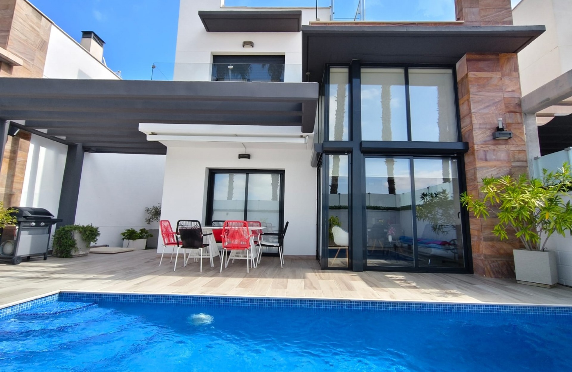 Modern villa located in Lomas de Cabo Roig (Orihuela Costa) in a gated and secure residential complex. It comprises three spacious bedrooms and three bathrooms with underfloor heating. The modern, fully equipped kitchen opens onto a bright living room with large bay windows and high ceilings, creating a pleasant and convivial living space. This fully furnished property offers all the comforts necessary for year-round living, holidays or an excellent rental investment. Central air conditioning ensures optimal comfort in all seasons. Outside, you will enjoy a magnificent private swimming pool, several terraces, a solarium offering beautiful unobstructed views, and private parking. Ideally located, the villa is less than five minutes from shops, bars and restaurants, and only ten minutes from the beaches and La Zenia Boulevard shopping centre. A turnkey villa, elegant and comfortable, in the heart of a peaceful and sunny environment on the Costa Blanca.