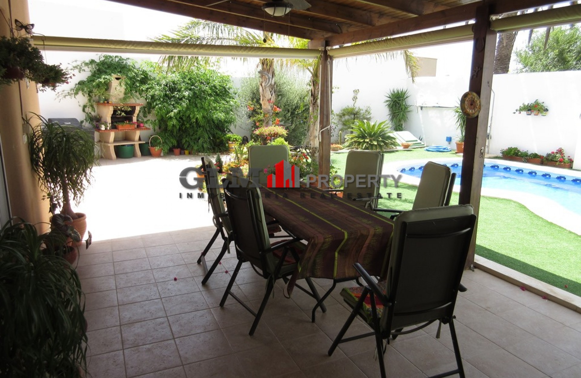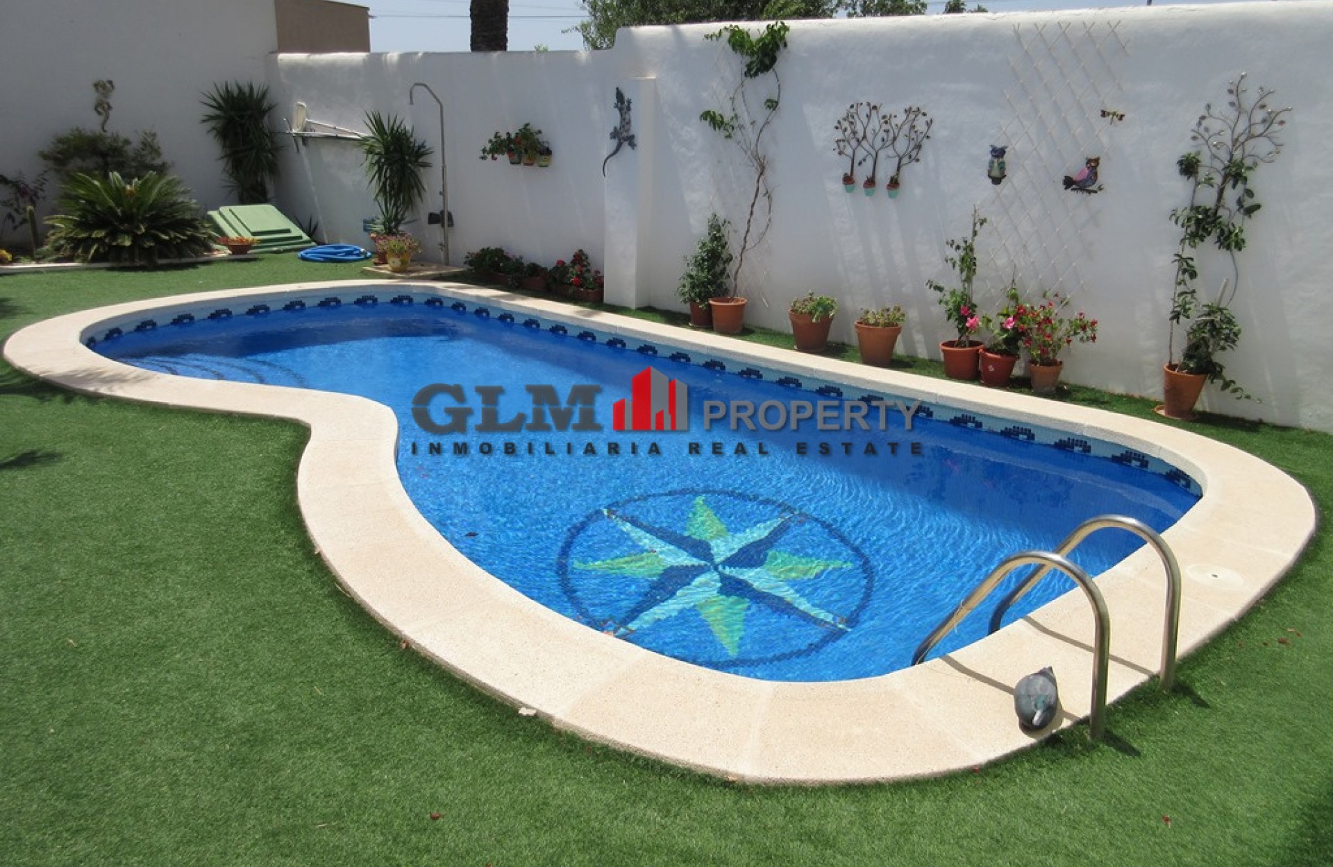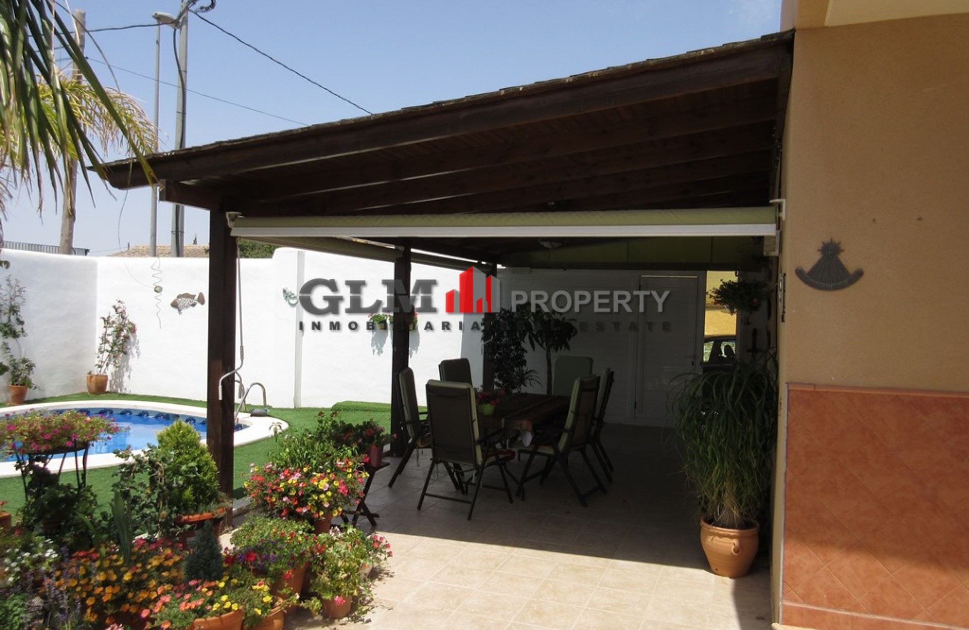 Beautiful semi-detached villa located in a rural setting on the outskirts of the small village of Dolores de Pacheco between Los Alcazares and San Javier. The property comprises on the ground floor, of a large living room with log burner, separate dining area, modern fully fitted kitchen, two bedrooms and one bathroom. On the first floor is the third bedroom with another bathroom and access to two terraces. Both from the kitchen and the living room there is access to the garden with barbecue and private pool.
