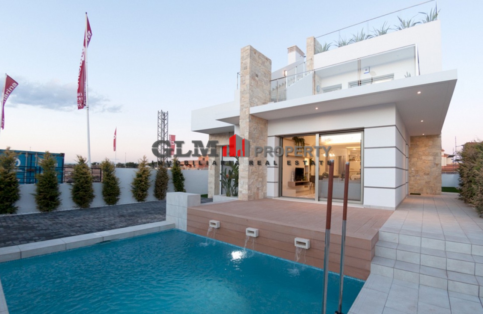 Luxurious detached villas, only 10 minutes walk from the Mar Menor beaches and bars, restaurants, shops,etc. There are 2 different models available. Villa Agata is a new design with straight lines and mix the White bone in the facade with the effect of the Stone. This property contains 3 bedrooms, one of them own suite, located in ground floor. The villa is composed by 2 floors and private solárium. To access to the solárium it contains a turret fully covered with stairs in it’s inside. It’s location in Costa Calida is excellent: only 10 minutes walking distance to the sea and close to all kind of services, commercial centers, airports, hospitals, leisure areas, etc.