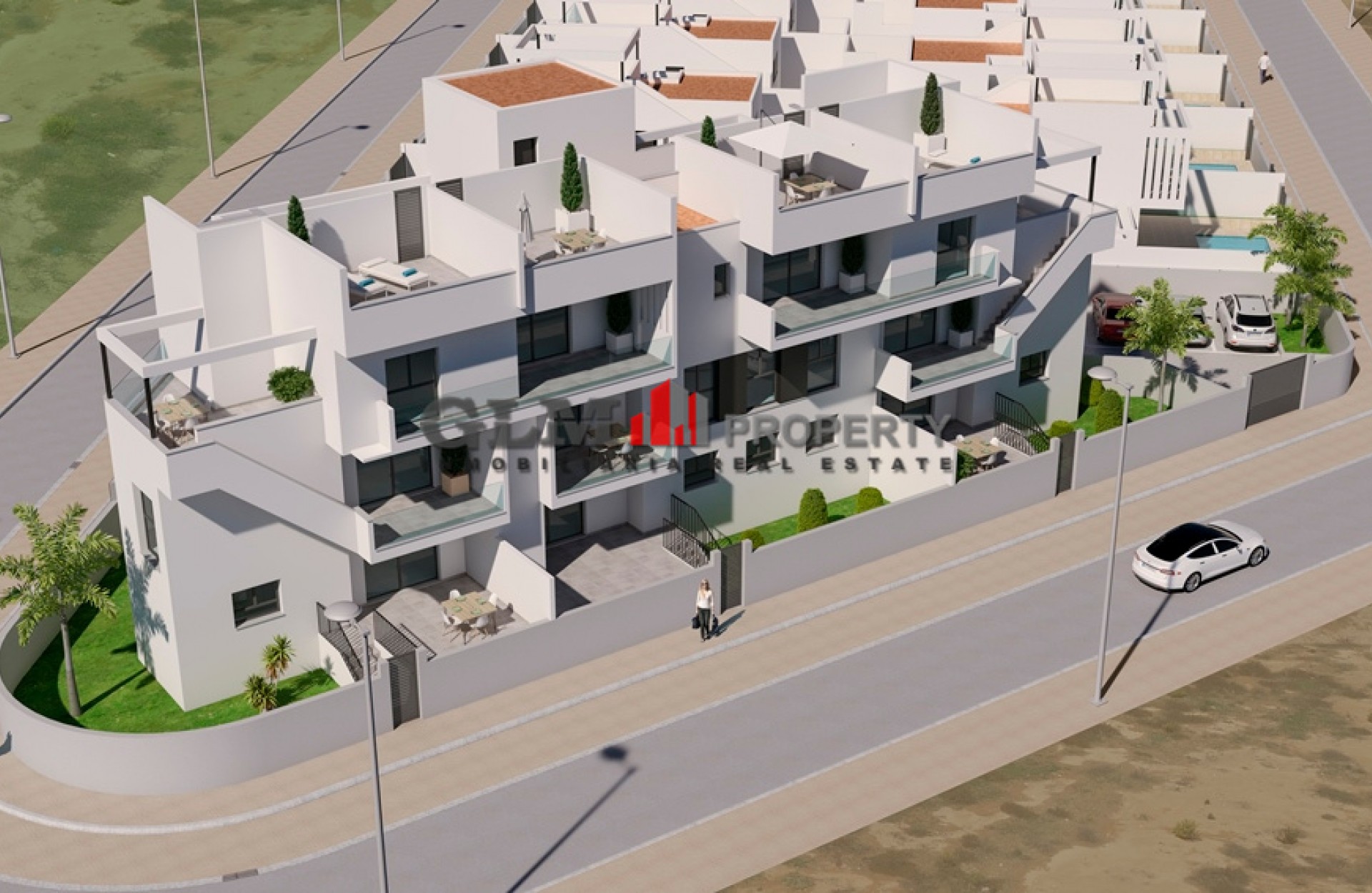 Two modern design apartment blocks. The properties offer 3 bedrooms, 2 bathrooms, kitchen, garden on ground floor and terrace on other floors, communal pool and off road parking. The urbanisation offers a 18 hole golf course with club house and 24hrs security. Located a few minutes drive from the beaches in Los Alcázares and supermarkets, shops, restaurants, etc. Prices from 155.000€.