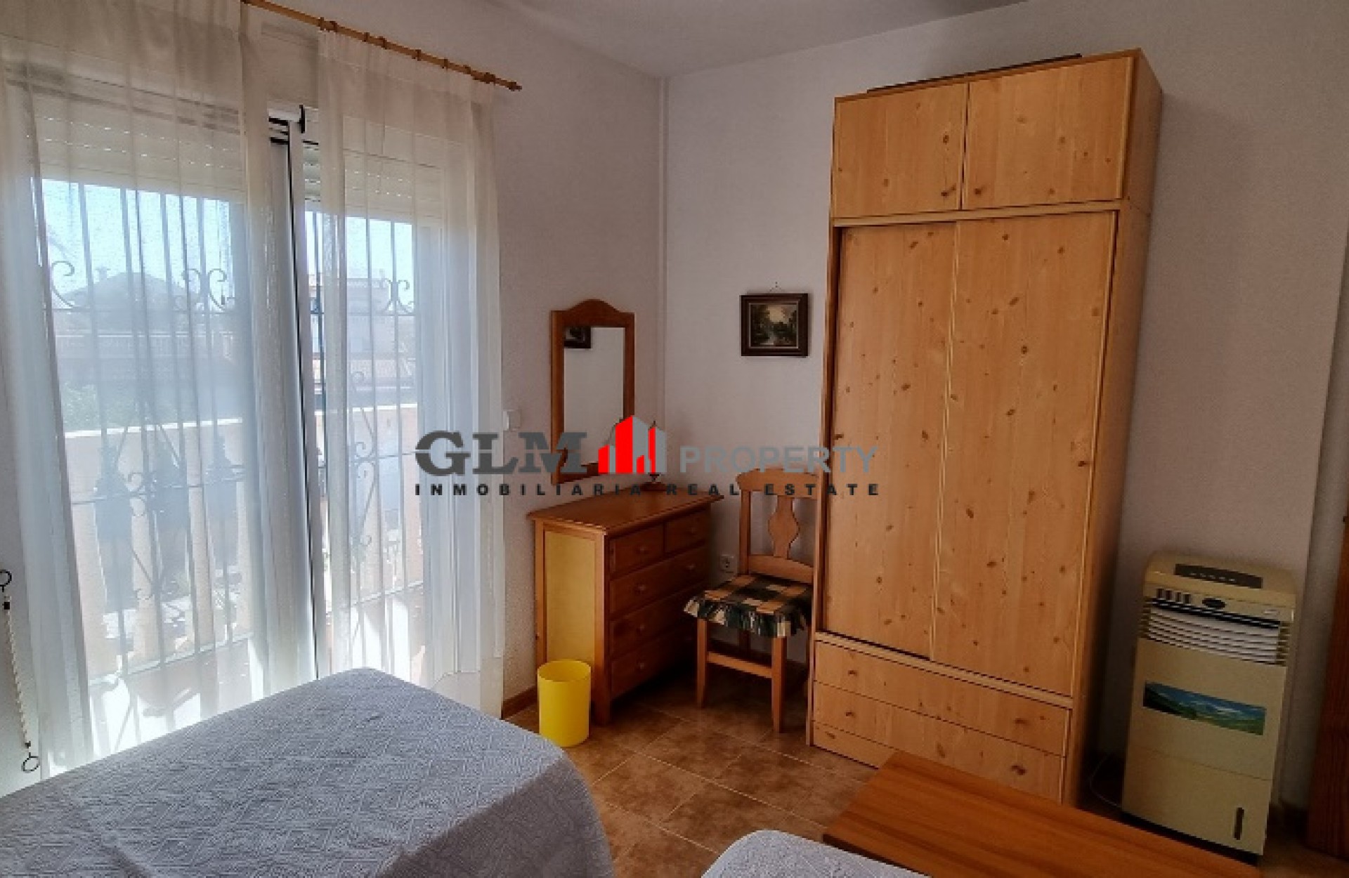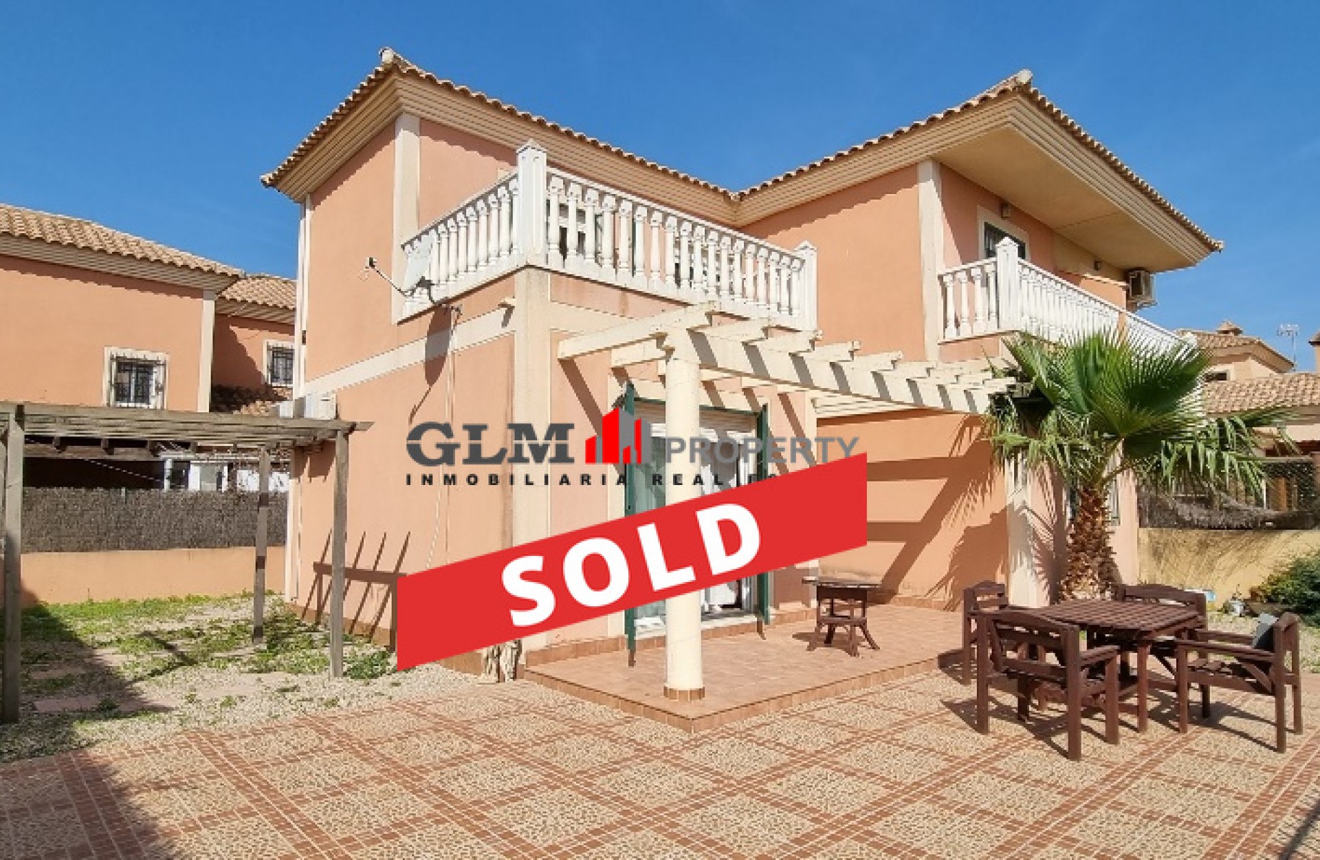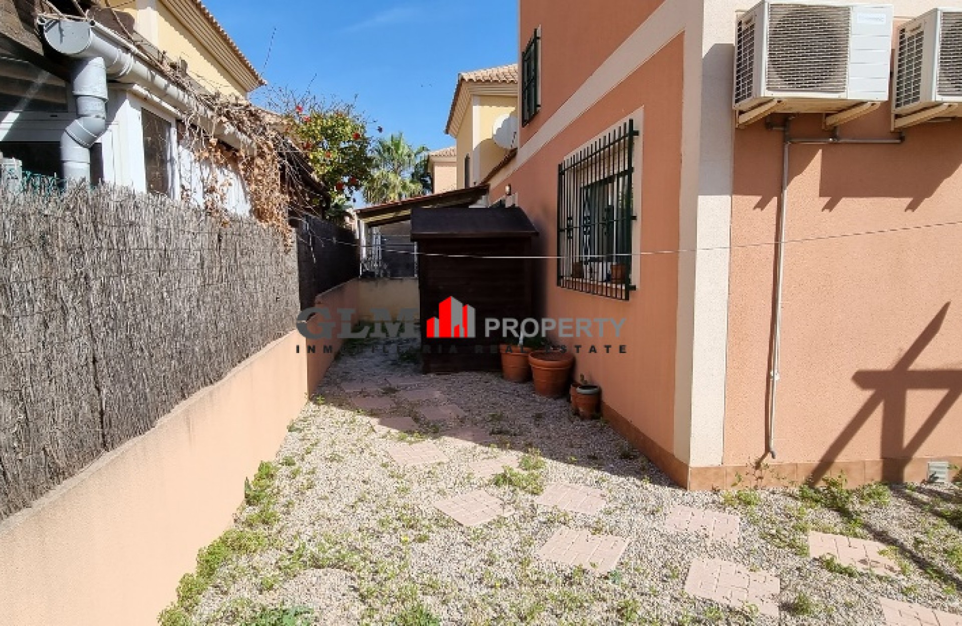 Semidetached Villa with front and side garden comprise on the ground floor as you come in the front door nice living dining room, fully fitted kitchen. 1 Bedroom on the ground floor and a bathroom. Upstairs there are 2 more bedrooms and another bathroom. The main bedroom has access to a large terrace. The Property is situated in Las Lomas del Rame, close to Serena Golf Course and only 5 minutes drive to Los Alcázares Town.