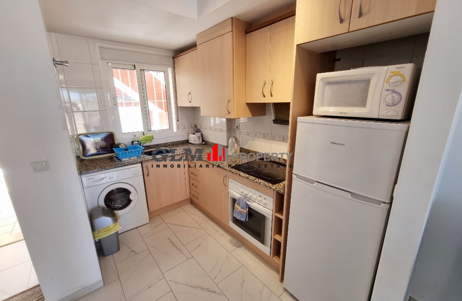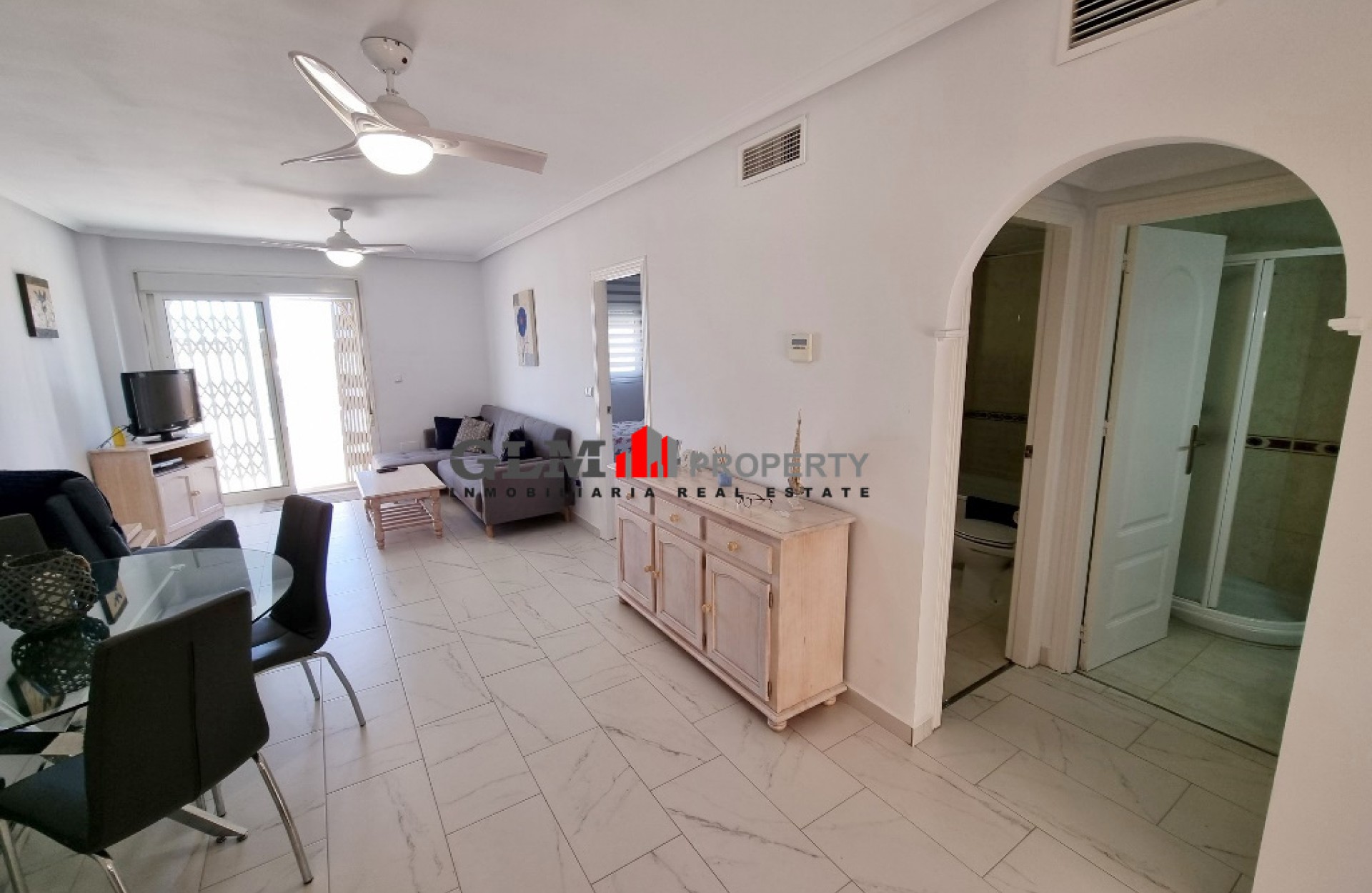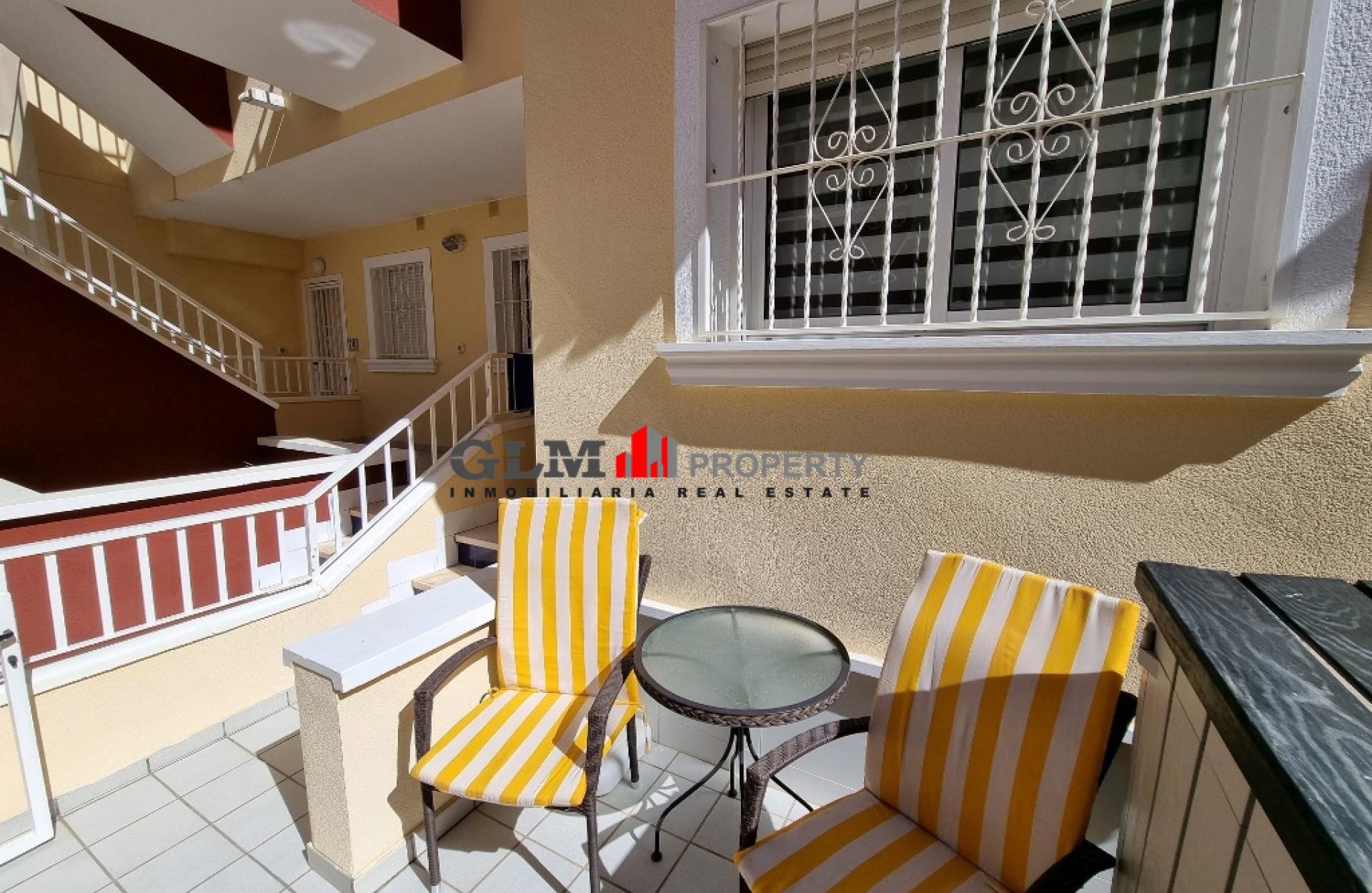 Lovely 2 bed room ground floor apartment with spacious front and back terrace situated on Puerto Marina complex. It has a open plan kitchen leading to the lounge. There are 2 bedrooms which have built in wardrobes and share a full family bathroom. The apartment has storage and is to be sold fully furnished. The complex is gates with 3 communal pools and a few minutes’ walk from the square, where there are shops, supermarket and many restaurants. Within walking distance to 5 km promenade of beautiful beaches with bars and water sports.
