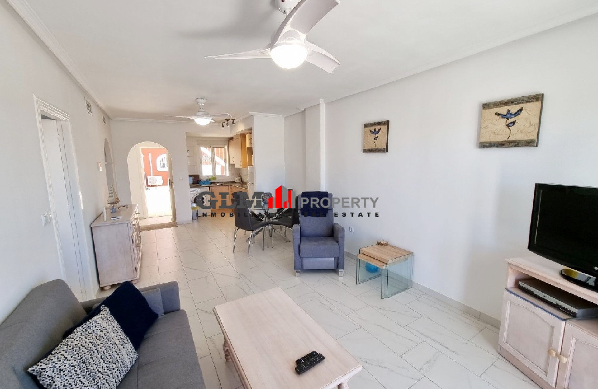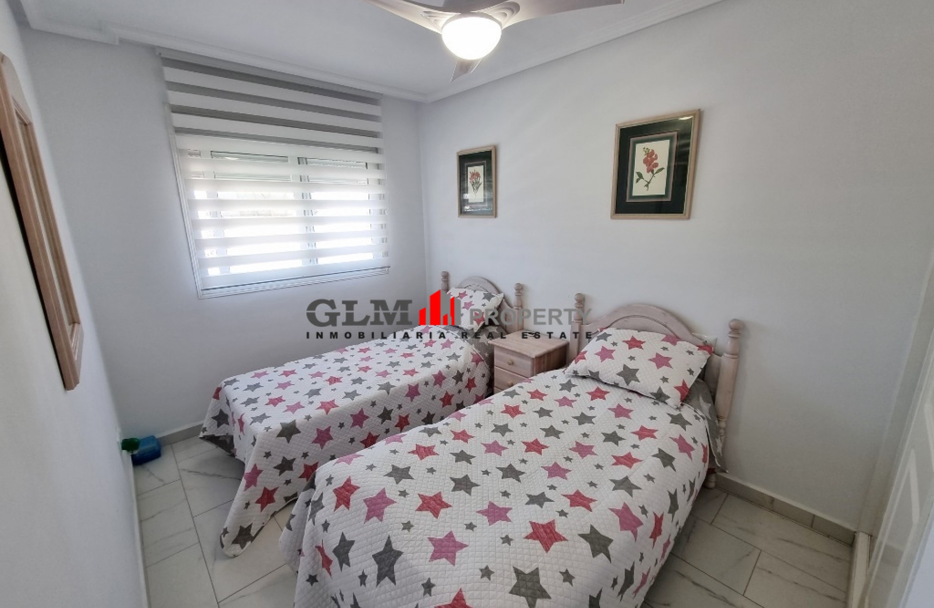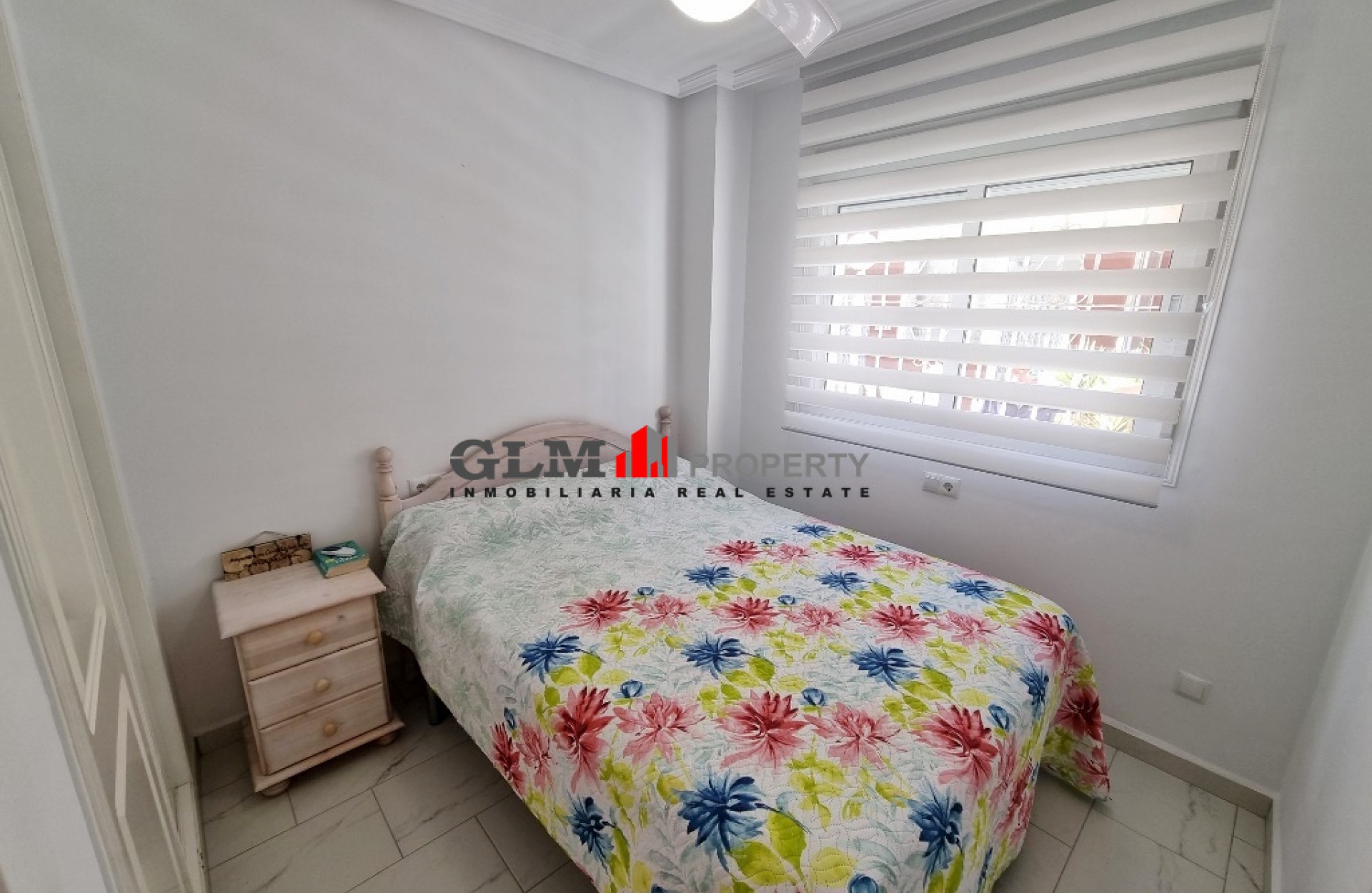 Lovely 2 bed room ground floor apartment with spacious front and back terrace situated on Puerto Marina complex. It has a open plan kitchen leading to the lounge. There are 2 bedrooms which have built in wardrobes and share a full family bathroom. The apartment has storage and is to be sold fully furnished. The complex is gates with 3 communal pools and a few minutes’ walk from the square, where there are shops, supermarket and many restaurants. Within walking distance to 5 km promenade of beautiful beaches with bars and water sports.