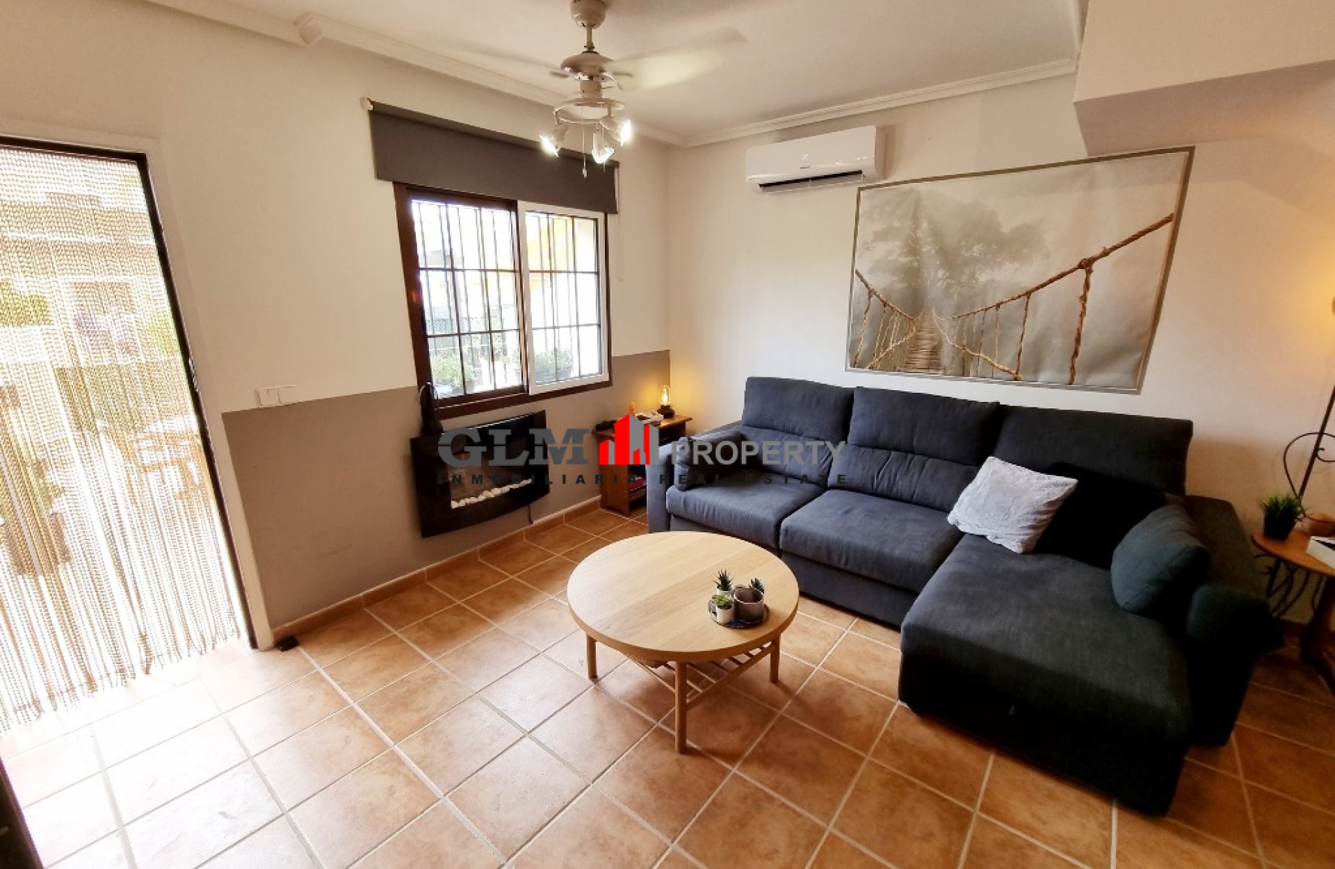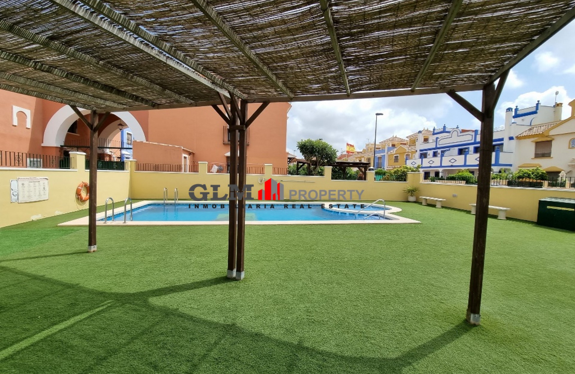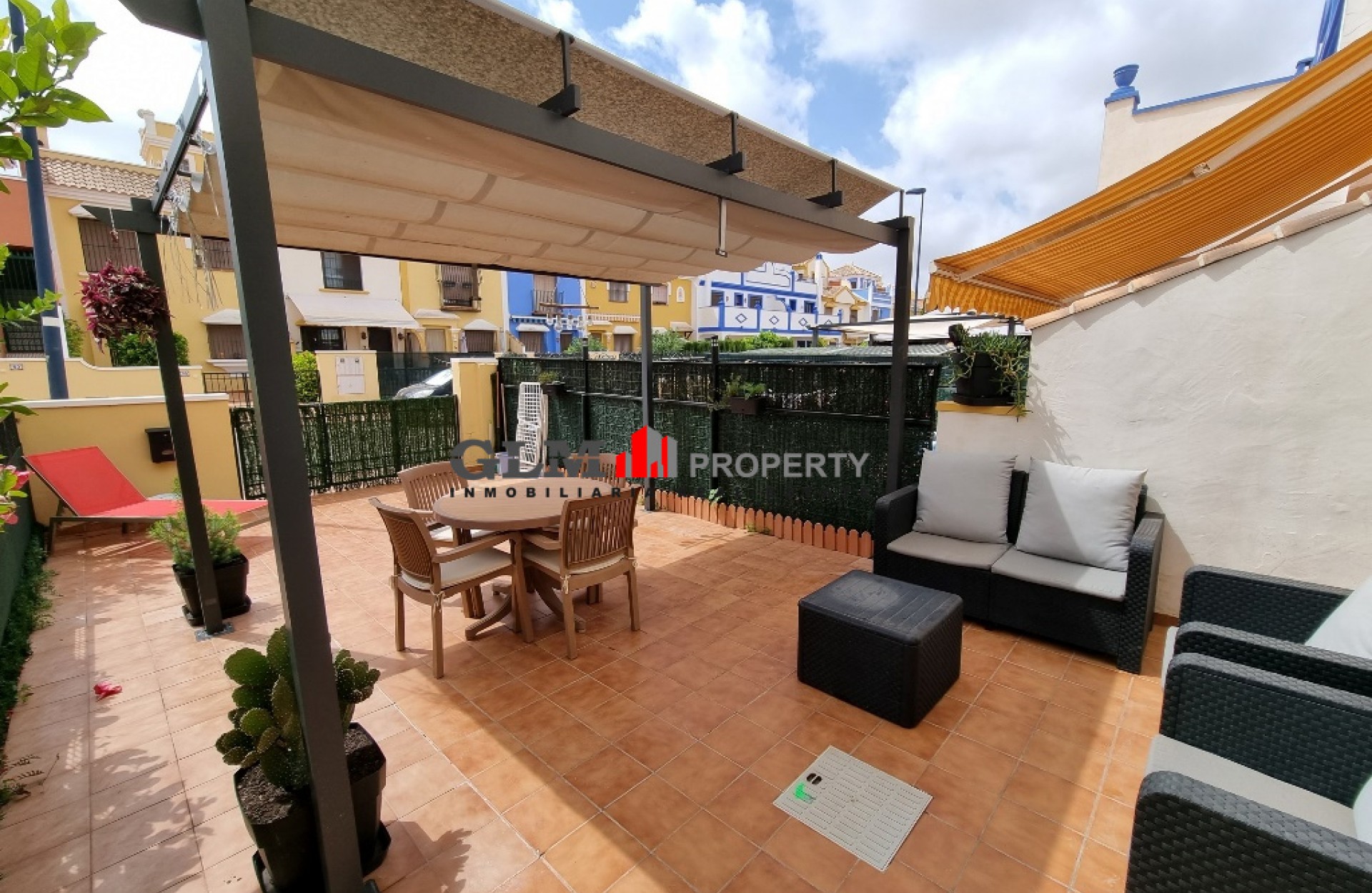 Stunning townhouse with access to a communal pool in the popular location of Señorio de Roda, only 1,5km from the seaside town of Los Alcázares. The large front terrace of 40 m2 offers different use and you can park the car when you are away. When entering the property, you find a large open plan lounge and dining area, kitchen area and a bathroom with a shower. In the 2nd floor there are 2 good sized bedrooms with a built-in wardrobe, a large fully renovated bathroom with a walk in shower. There is also a small terrace overlooking the internal communal area. On the top floor is a large private solarium. The property has been refurbished throughout. The back door leads out onto a beautiful Spanish style courtyard with fountains and planting. Only a few minutes’ walk from the Roda Golf Course.