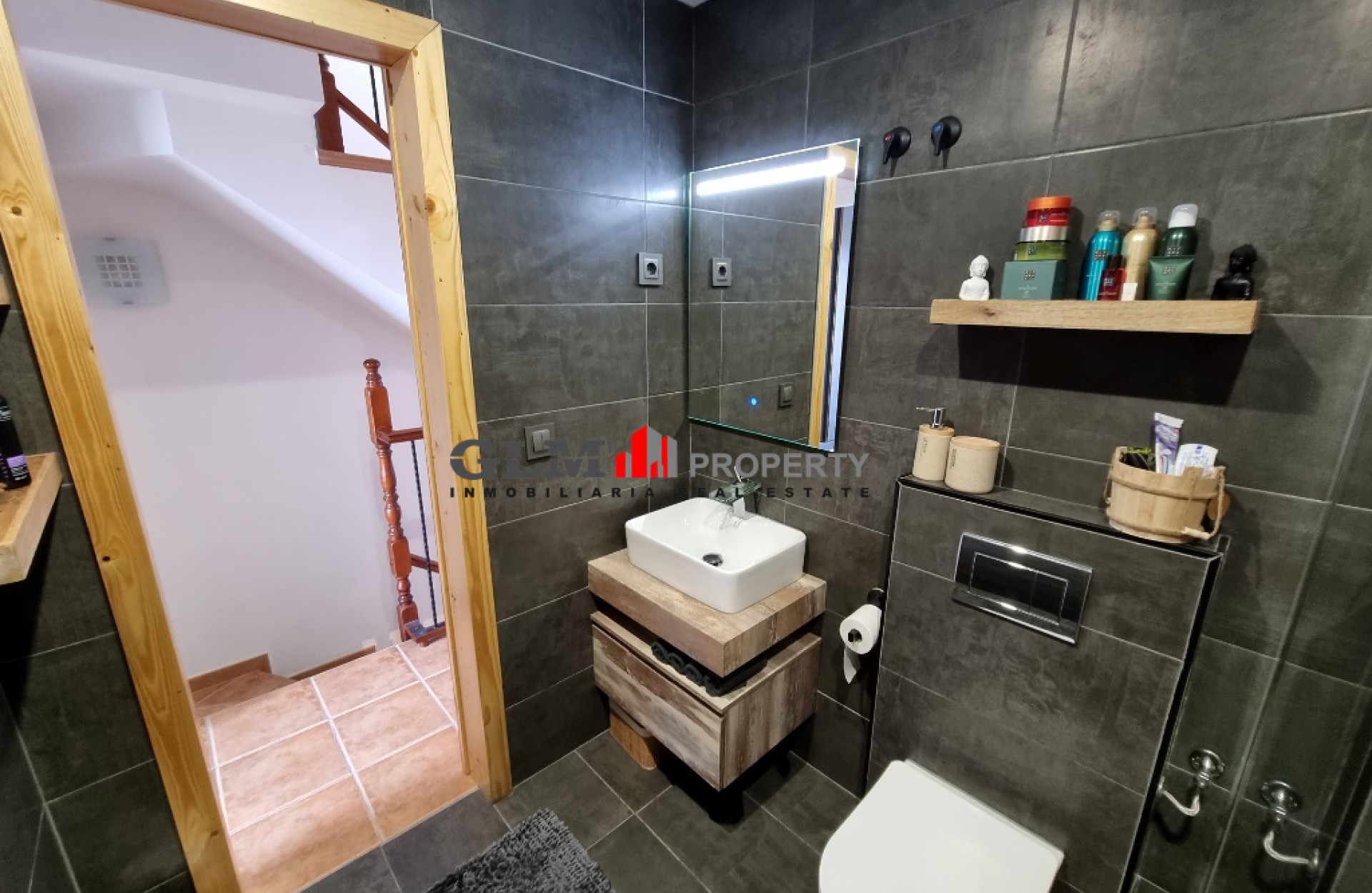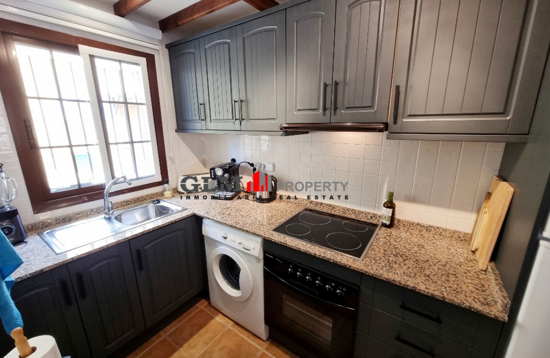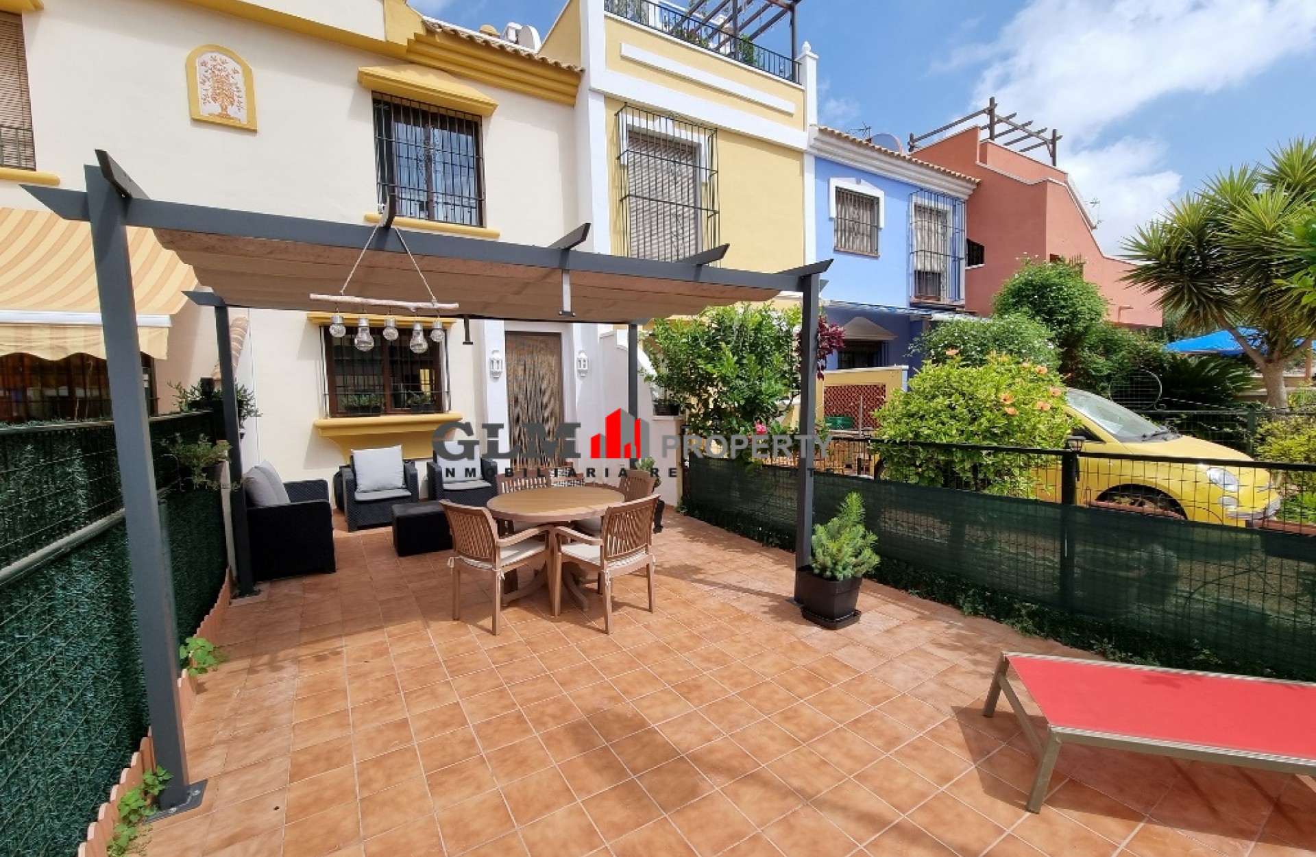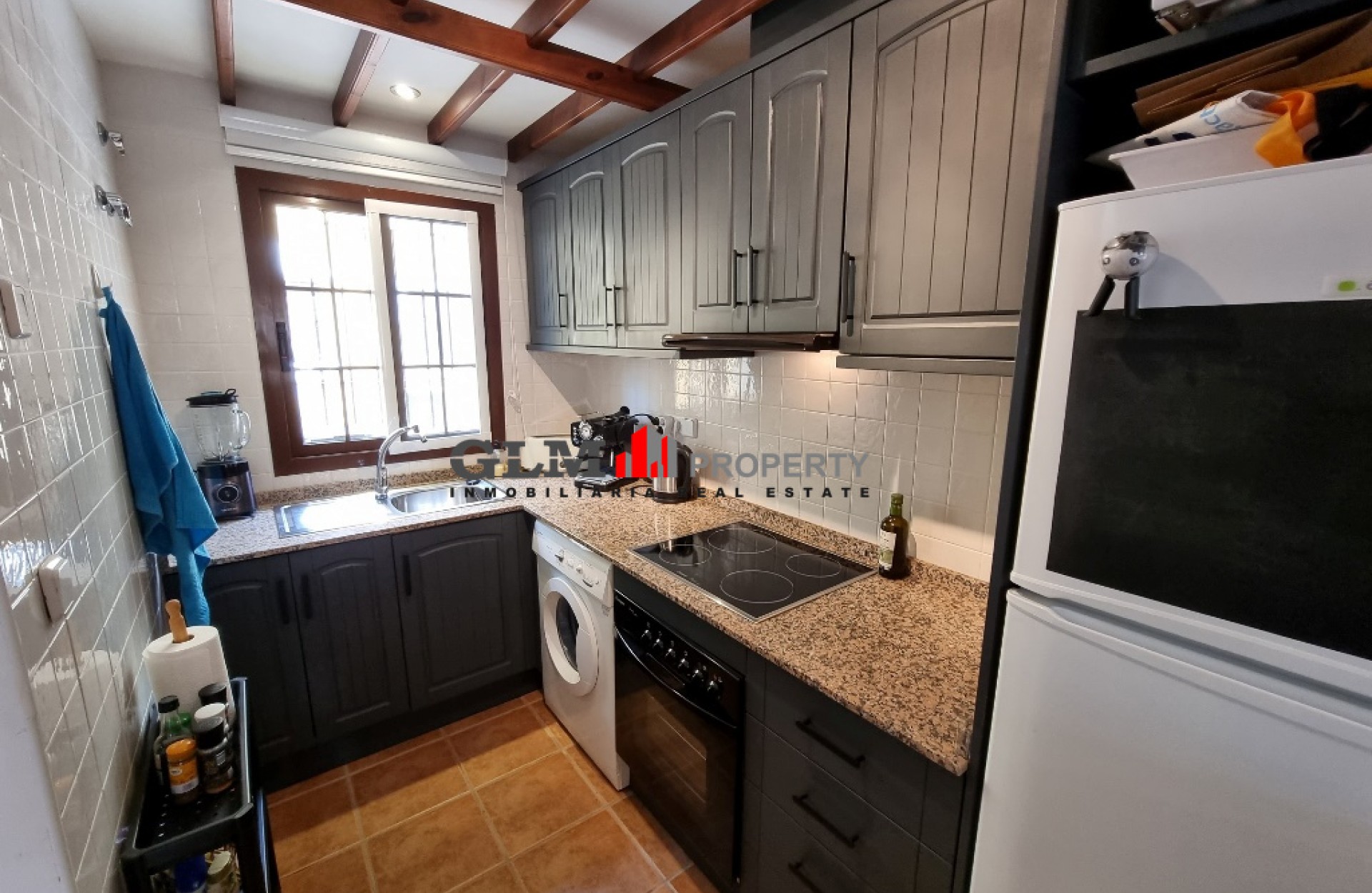 Stunning townhouse with access to a communal pool in the popular location of Señorio de Roda, only 1,5km from the seaside town of Los Alcázares. The large front terrace of 40 m2 offers different use and you can park the car when you are away. When entering the property, you find a large open plan lounge and dining area, kitchen area and a bathroom with a shower. In the 2nd floor there are 2 good sized bedrooms with a built-in wardrobe, a large fully renovated bathroom with a walk in shower. There is also a small terrace overlooking the internal communal area. On the top floor is a large private solarium. The property has been refurbished throughout. The back door leads out onto a beautiful Spanish style courtyard with fountains and planting. Only a few minutes’ walk from the Roda Golf Course.