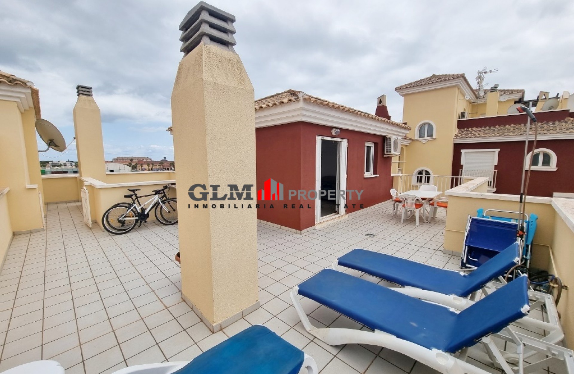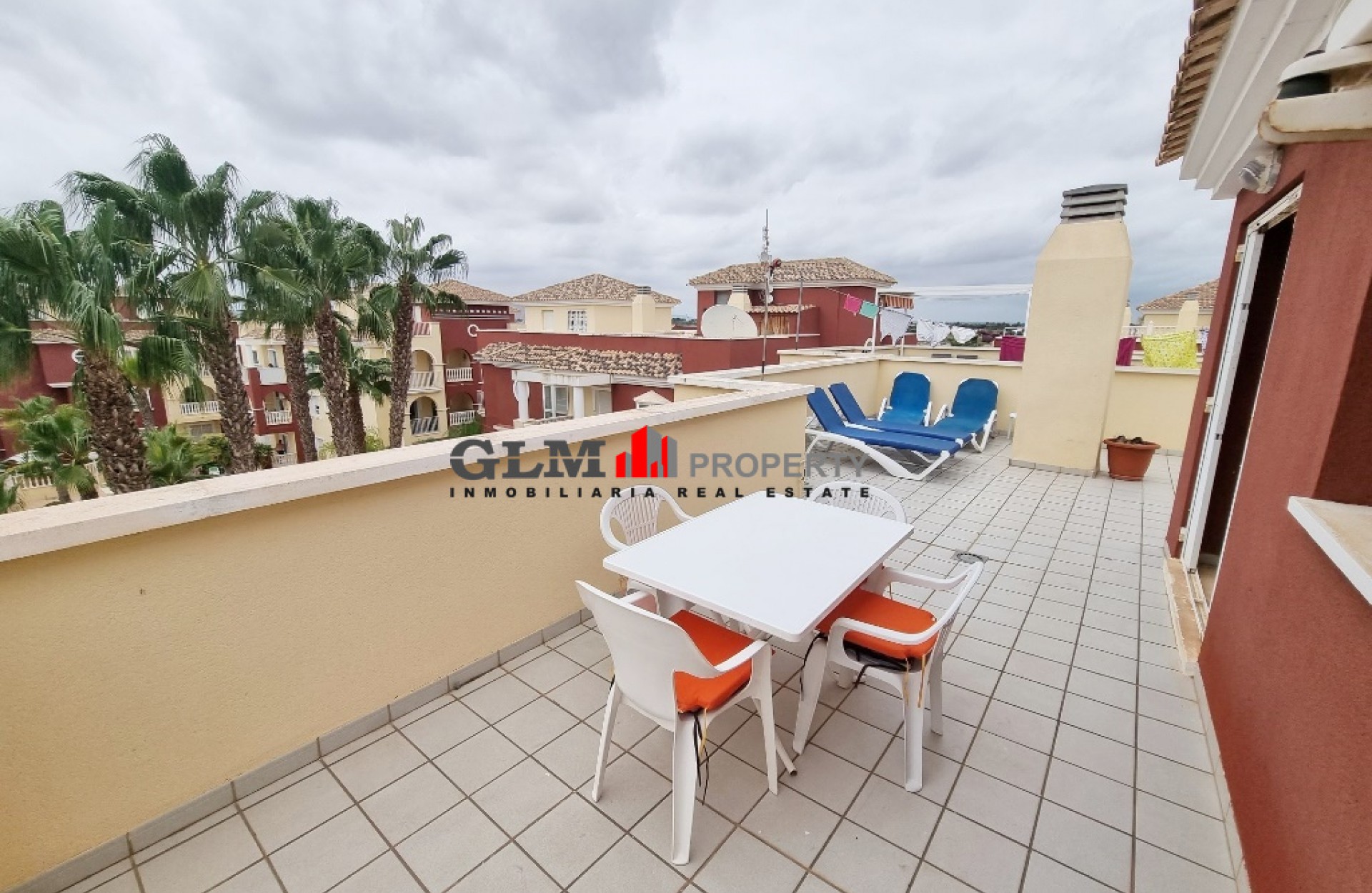 Penthouse apartment overlooking both communal pools on the Puerto Marina complex. The property comprises of lounge and dining area with patio doors leading to the balcony, open plan kitchen, 2 bed rooms with fitted wardrobes, 1 bathroom downstairs, 1 bedroom has also access to the balcony. As you head upstairs you will find a large private roof top solarium with pool views and also views over the surrounding area. There is a room on the solarium that comes with a bathroom. Viewings will be highly recommended! The Residential benefits from several communal pools and these are surrounded by well-maintained communal garden.