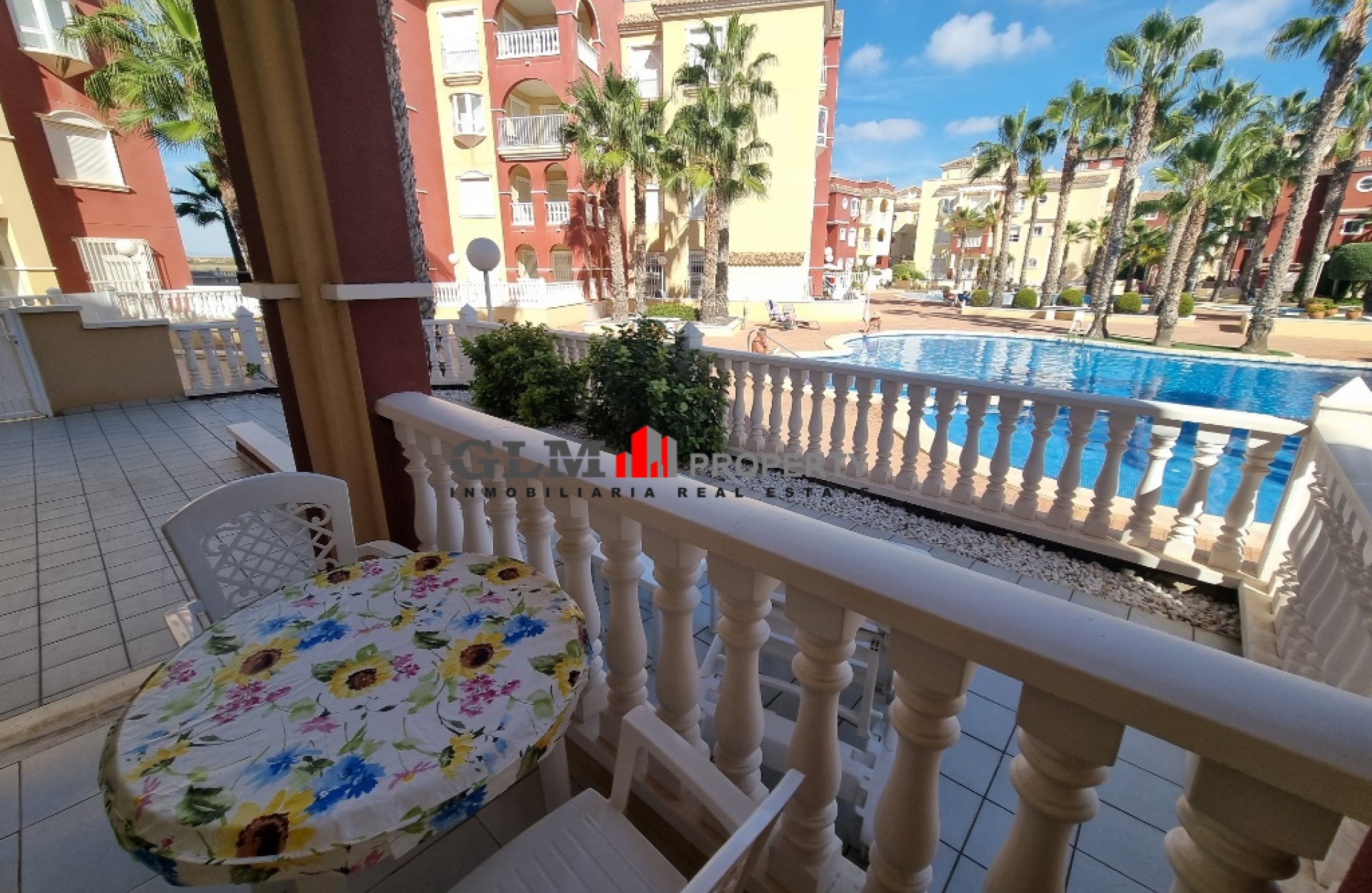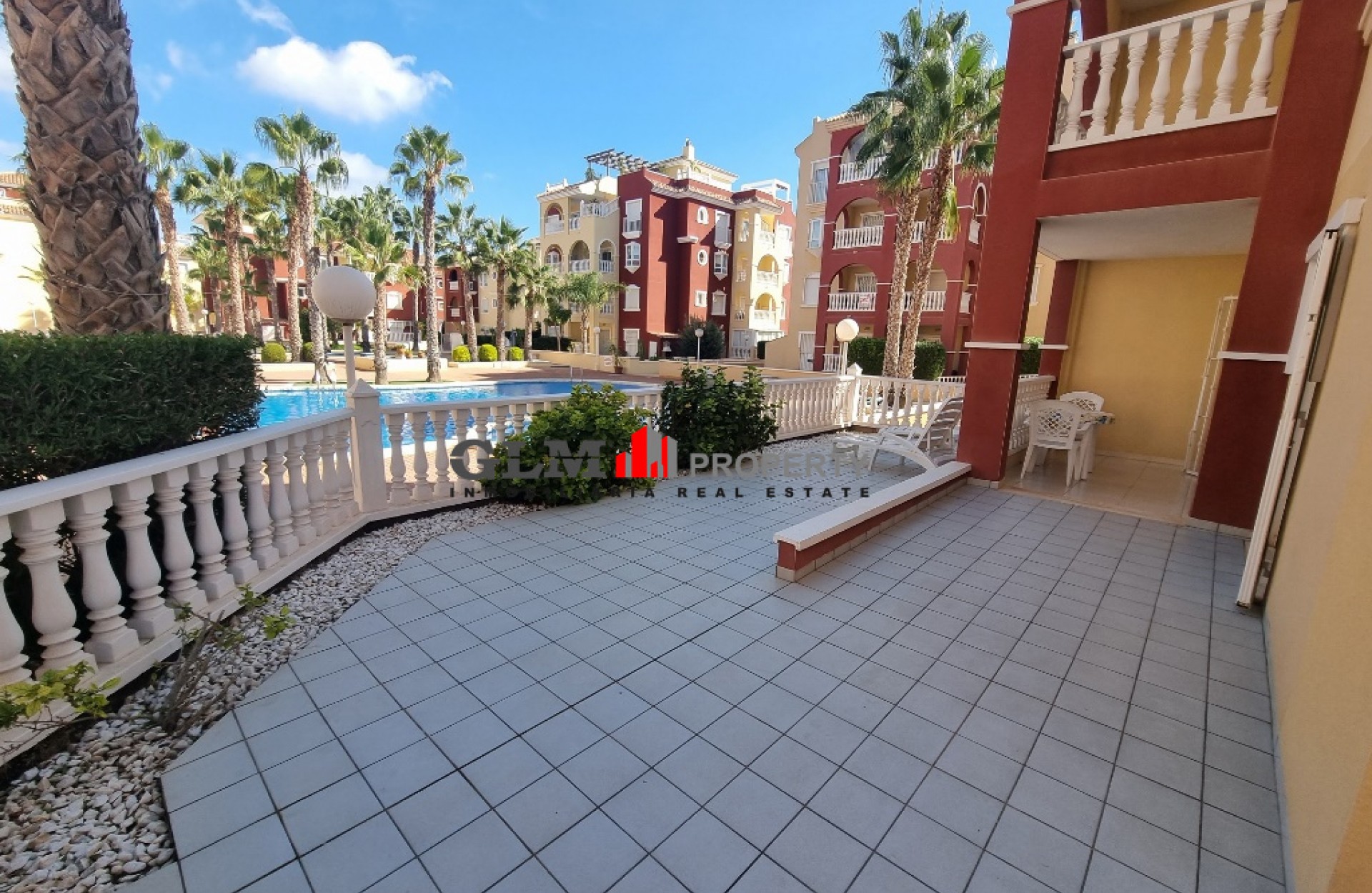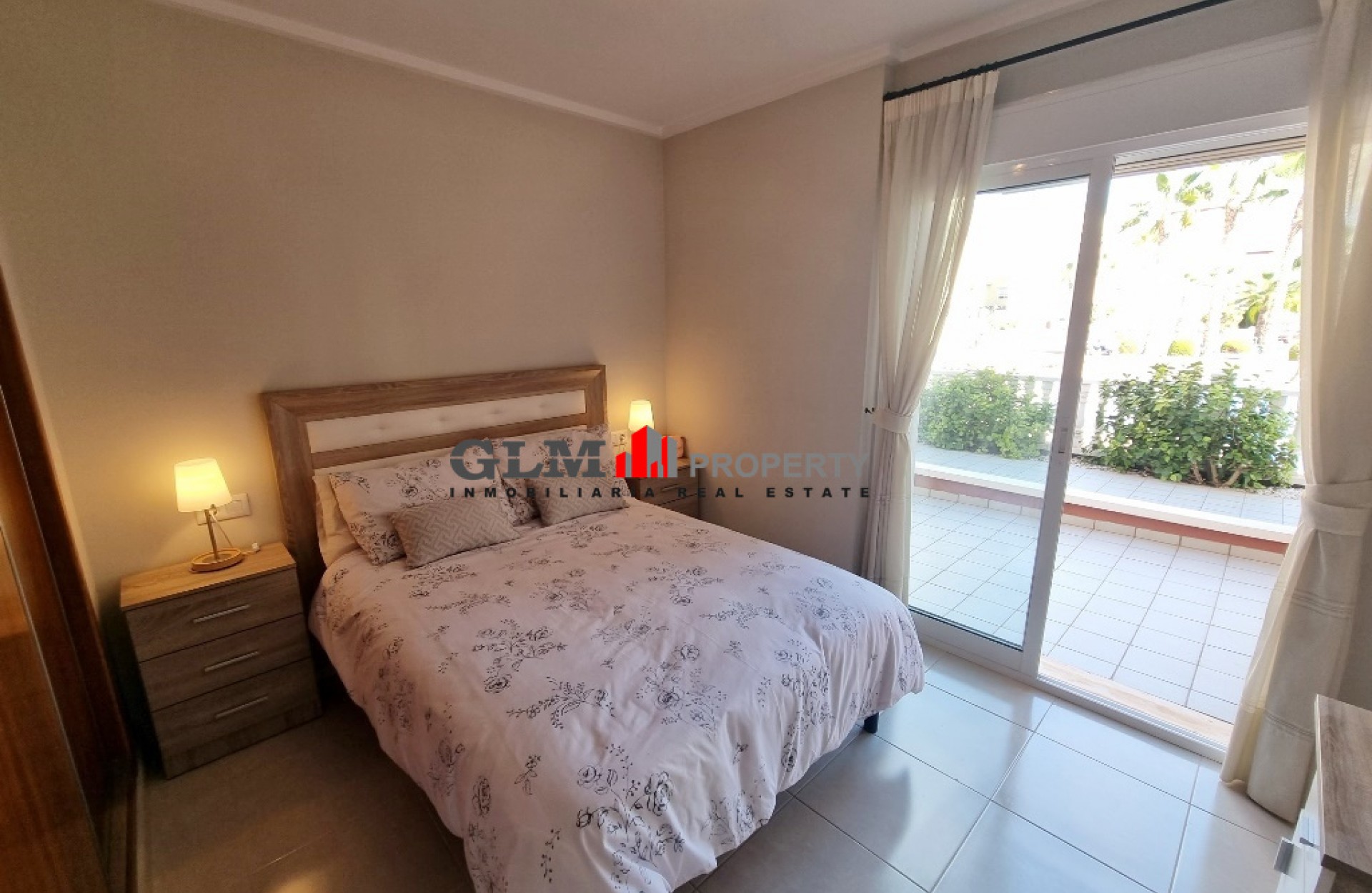 Unique ground floor apartment in the very popular Puerto Marina complex offering you an elevated terrace that not only allows you to look out over the 2 communal pools and gardens but at the same time offers privacy. A must view to see the difference! The inside of the property flows and is modern throughout lounge, dining and it has an open plan kitchen, bathroom with walkin shower and both bedrooms allowing for double beds with fitted wardrobes, but also being very bright as they have sliding doors allowing direct access to the terraced area. The complex a few minutes’ walk from the square, where there are shops, supermarket and many restaurants. Within walking distance to 5 km promenade of beautiful beaches with bars and water sports.
