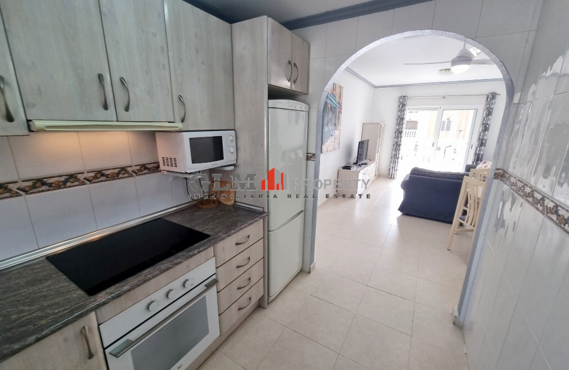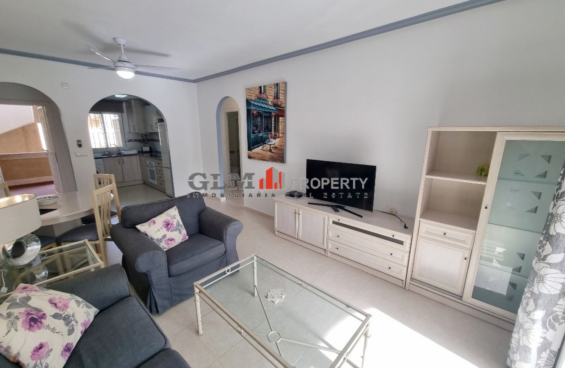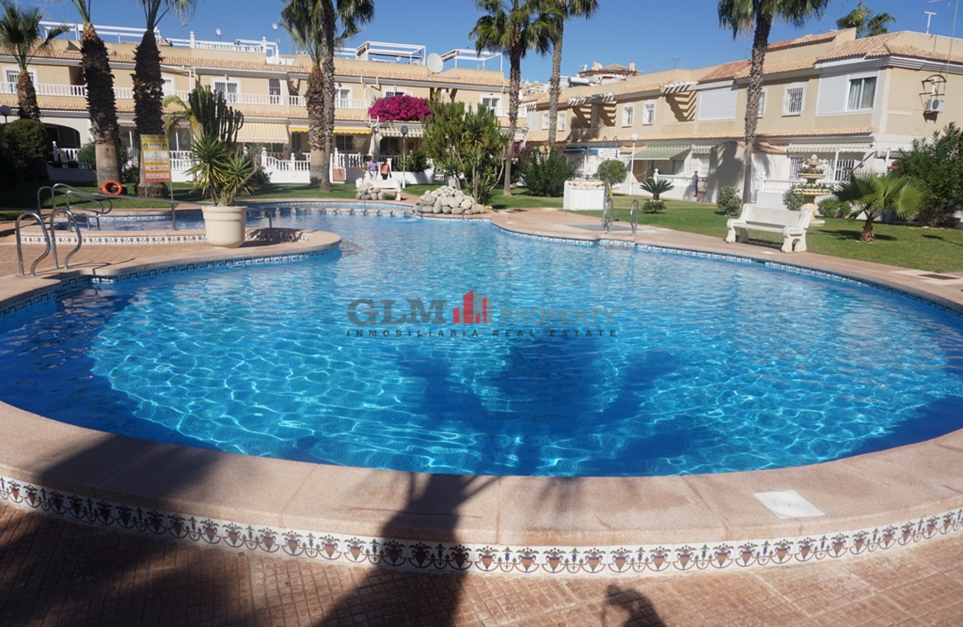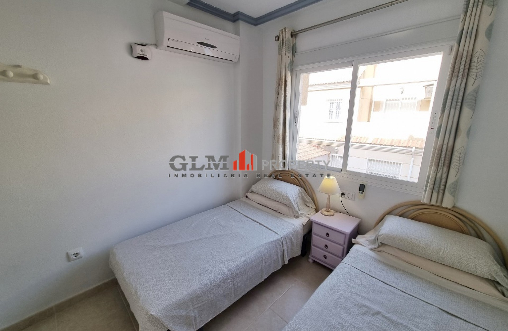 Lovely 1st floor South facing apartment on the very popular El Divino complex. This apartment is ready to go as it comes fully furnished and has been maintained to a very high standard. There are 2 large bedrooms, one with 2 single beds and the other one with double bed, both with fitted wardrobes as well as 2 bathrooms, 1 having a bath and the other a shower. Both bedrooms have air conditioning. The kitchen is open and leads to the dining area and lounge. As you come out from the lounge you have a decent sized terrace to enjoy the sunshine. The Residential El Divino comes with 2 communal pools and a toddlers pool and these are surrounded by well-maintained communal gardens nearest beach is within 7/8 minutes’ walk. There is a central square within 5 minutes’ walk of the apartment which has supermarkets, shops, cafes, restaurants and banks. The property has a Tourist license and is being sold fully furnished.