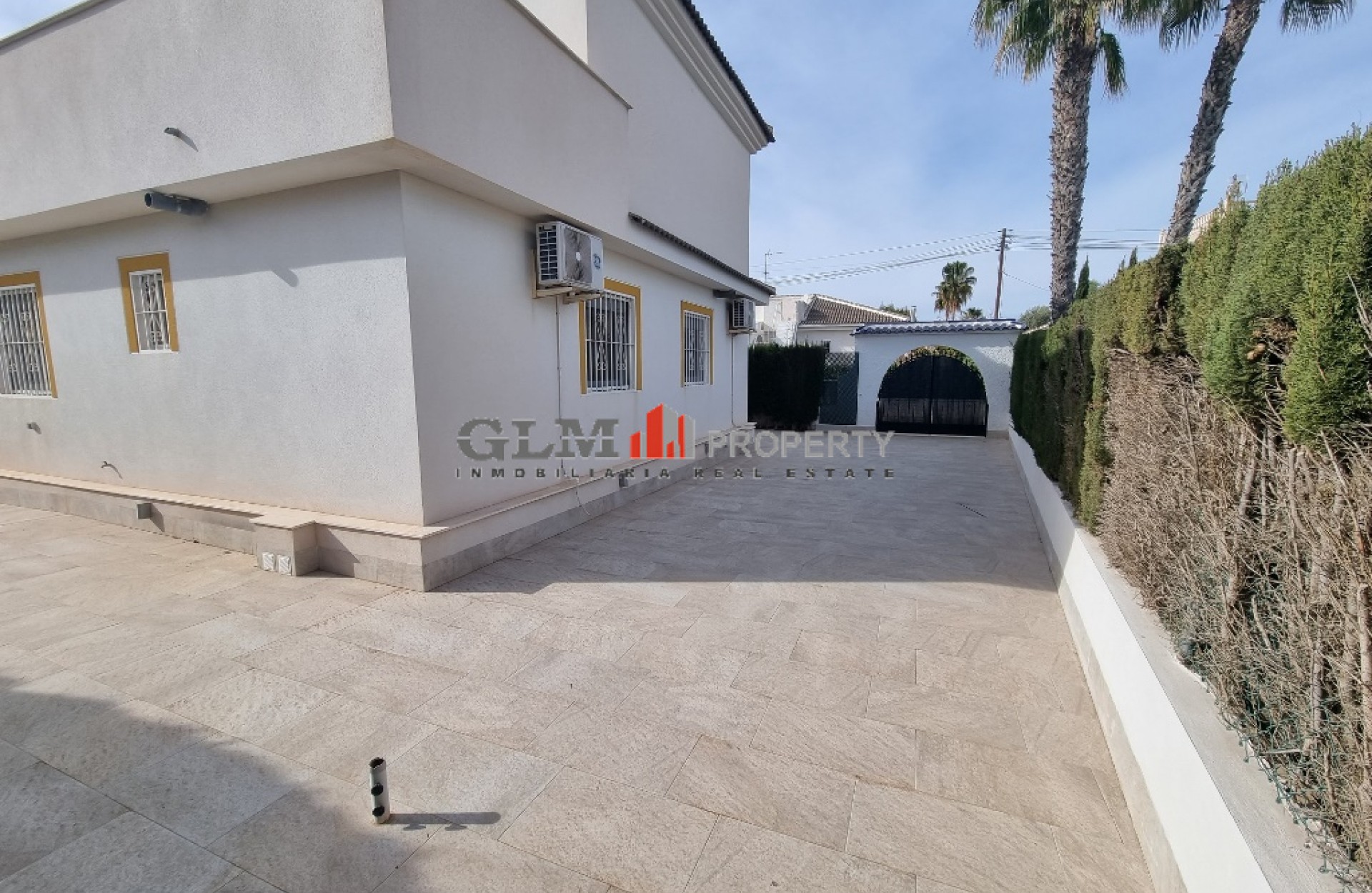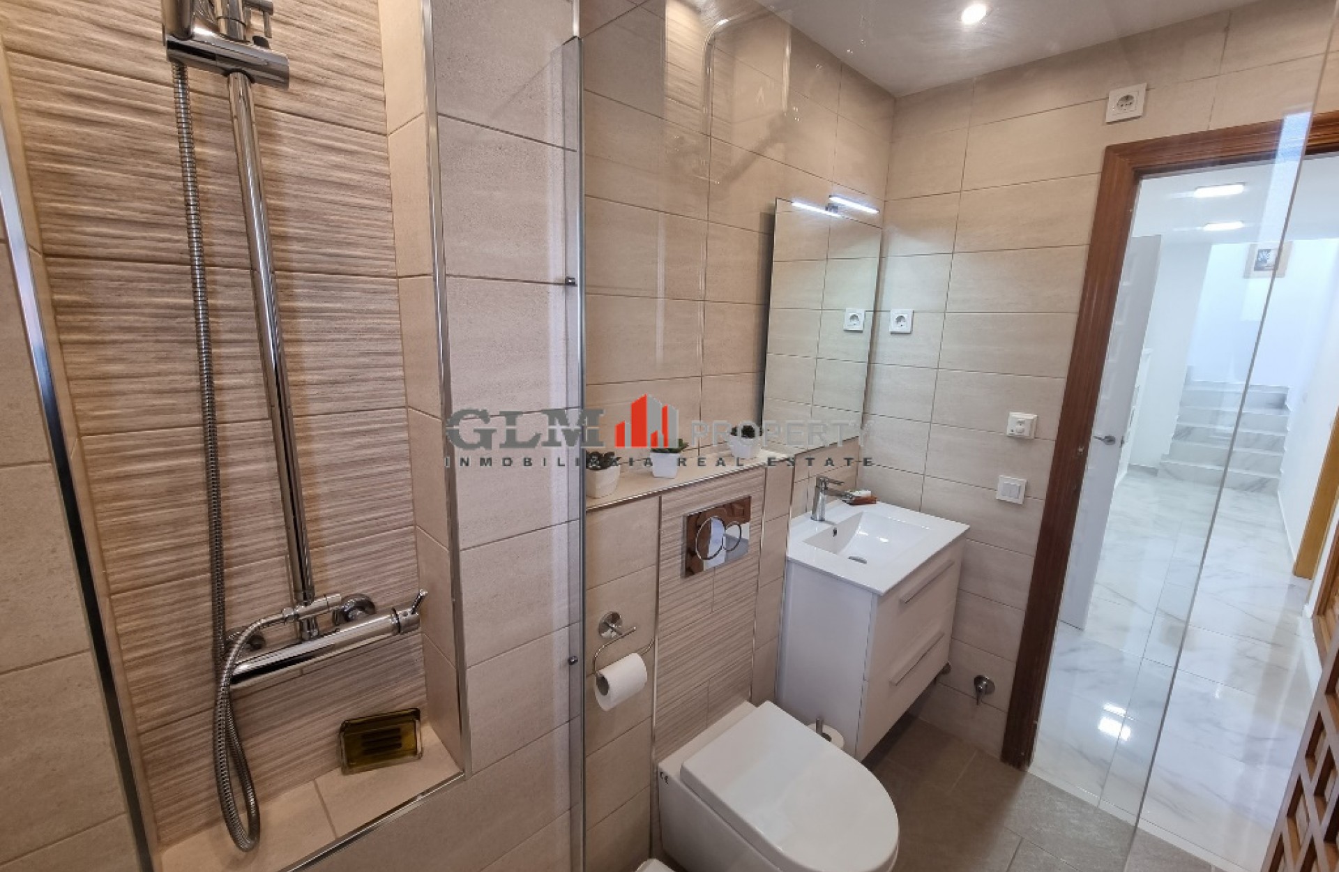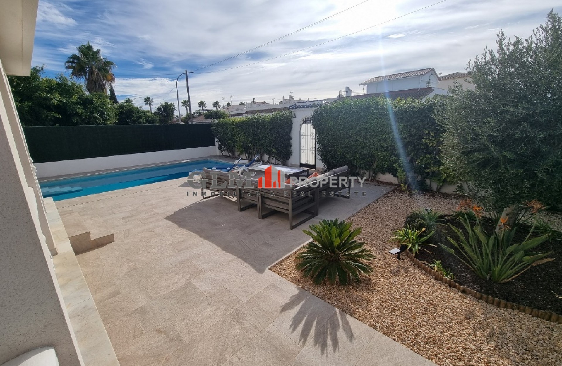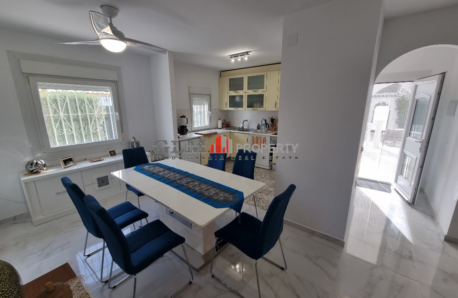Stunning completely reformed Villa over 2 floors on a plot of 475m2 plot size in the sough after area of Los Narejos. As you come through from the street to the garden you will see a large pool with ample area of sunbeds. The garden goes around the Property and there is space to park minimum 2 cars on the back area of the villa. The covered very spacious front terrace is outfacing and overlooking to the Pool and Garden area. On the ground floor you will find a dining room and lounge, good sized kitchen, 2 bedrooms and bathroom with walk-in shower. Upstairs there are 2 more bedrooms with fitted wardrobes and 2 more bathrooms. Both Bedrooms have access to huge terrace from where you can enjoy exquisite views of the surrounding. The property provides also a utility room. Walking distance to the promenade of Mar Menor and other services such Supermarket, banks, gas station, schools, restaurants and others.