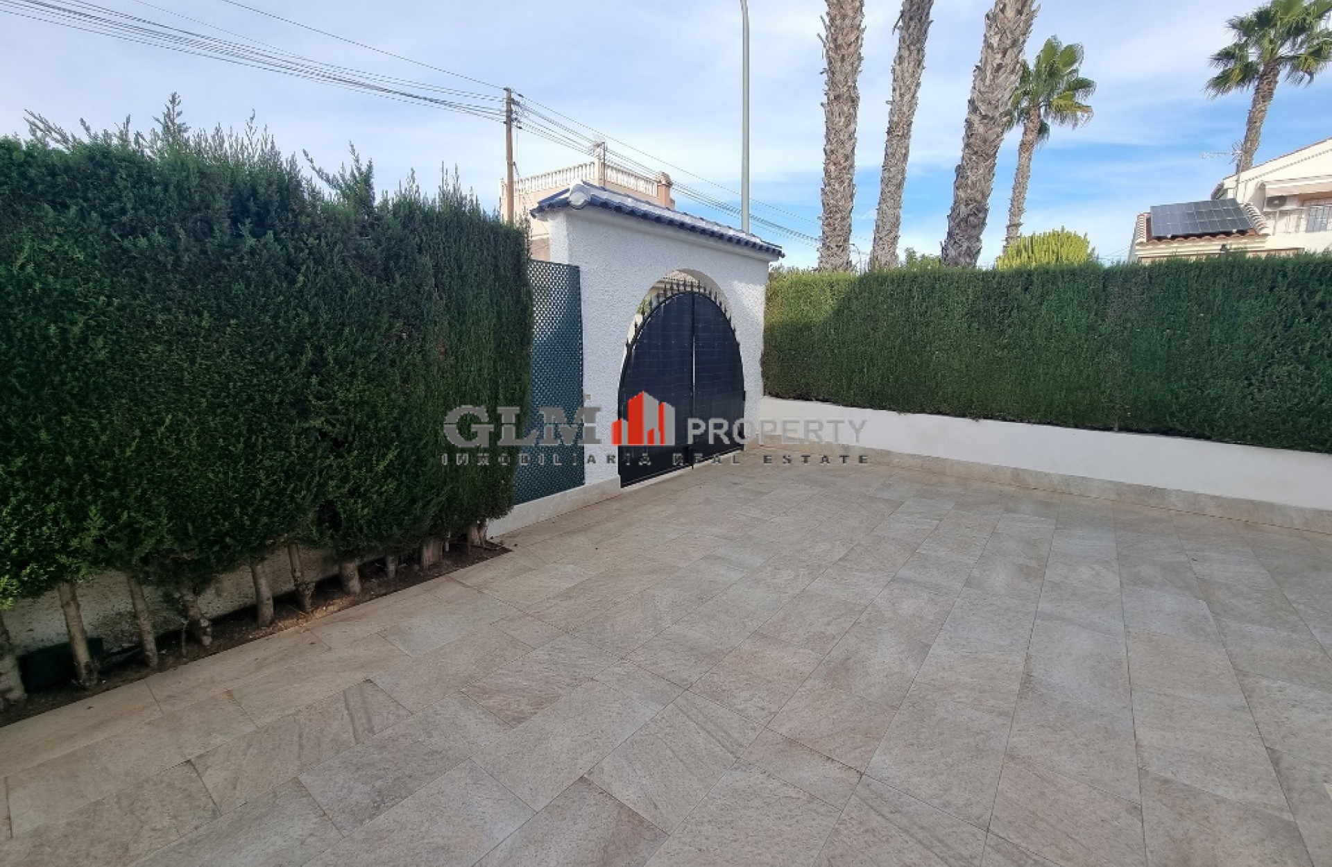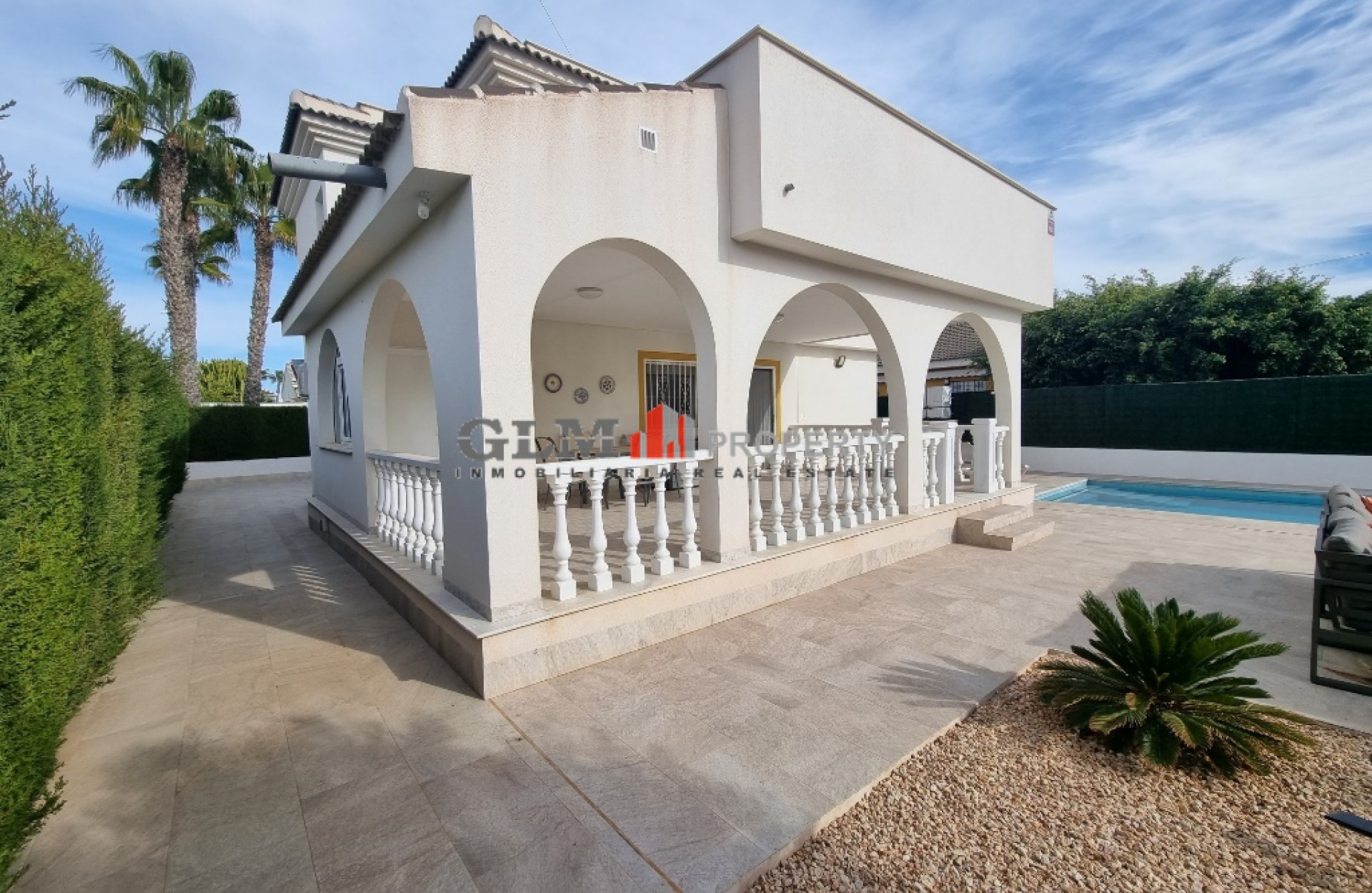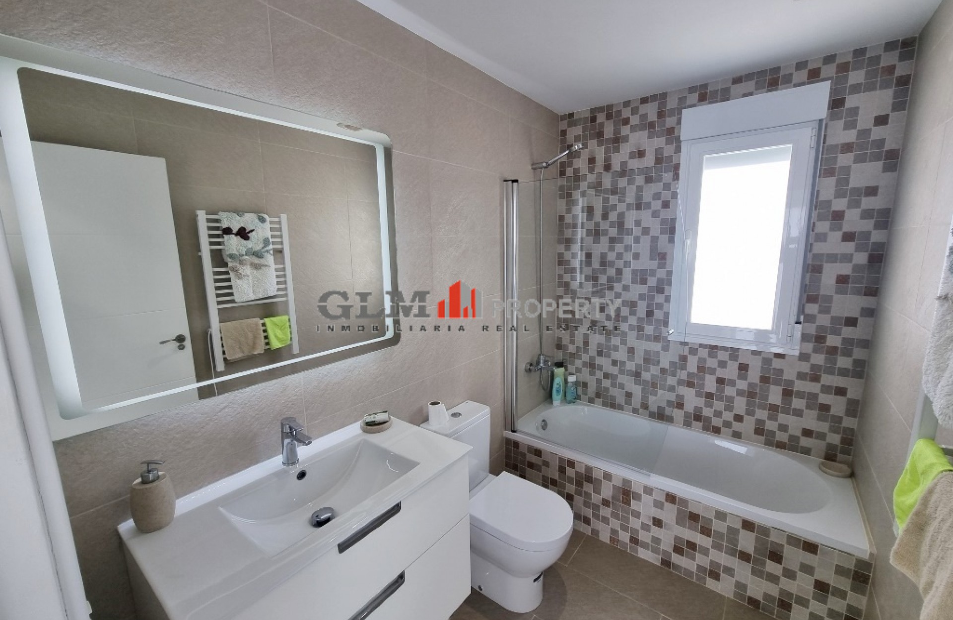 Stunning completely reformed Villa over 2 floors on a plot of 475m2 plot size in the sough after area of Los Narejos. As you come through from the street to the garden you will see a large pool with ample area of sunbeds. The garden goes around the Property and there is space to park minimum 2 cars on the back area of the villa. The covered very spacious front terrace is outfacing and overlooking to the Pool and Garden area. On the ground floor you will find a dining room and lounge, good sized kitchen, 2 bedrooms and bathroom with walk-in shower. Upstairs there are 2 more bedrooms with fitted wardrobes and 2 more bathrooms. Both Bedrooms have access to huge terrace from where you can enjoy exquisite views of the surrounding. The property provides also a utility room. Walking distance to the promenade of Mar Menor and other services such Supermarket, banks, gas station, schools, restaurants and others.