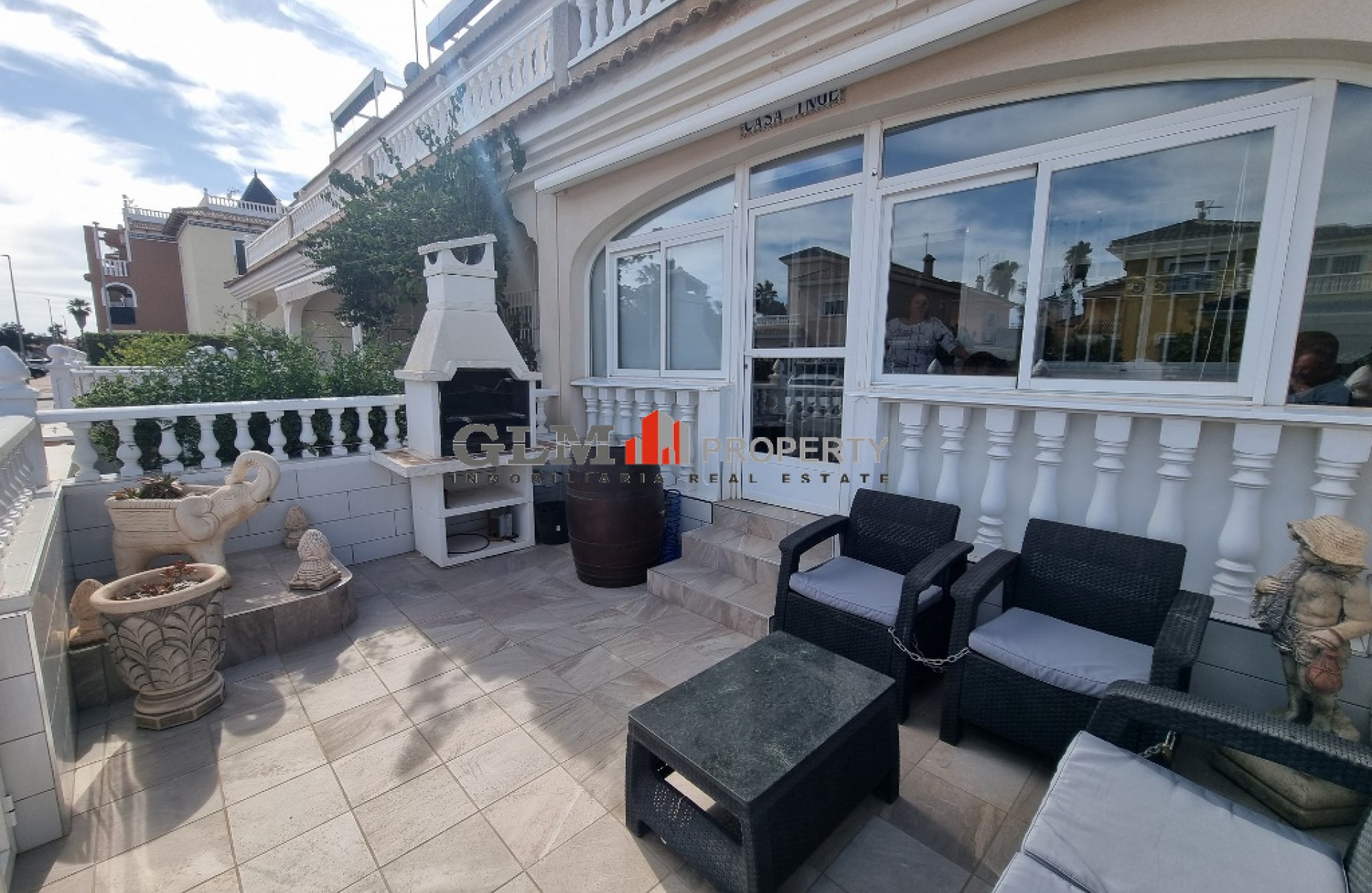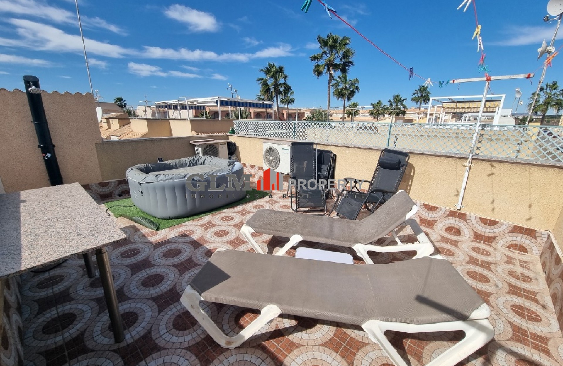 Fully renovated townhouse for sale on El Divino complex with 2 large community pools, surrounded by well maintained communal gardens. On the ground floor the property comprises of a bright and large living room, independent refurbished kitchen, dining room which can be used as well a a bedroom and bathroom with shower. The back door from the kitchen leads out to a back terrace and access to the communal Pool. Upstairs there is a spacious bathroom with underfloor heating and 2 double bedrooms, both with balcony and fitted wardrobes. There is a stairway from the main bedroom balcony to the large solarium with Jacuzzi, a perfect chill out area for sunbathing, barbecues etc. Property counts with many extras like Pellet oven, heating, front glazed terrace, etc.