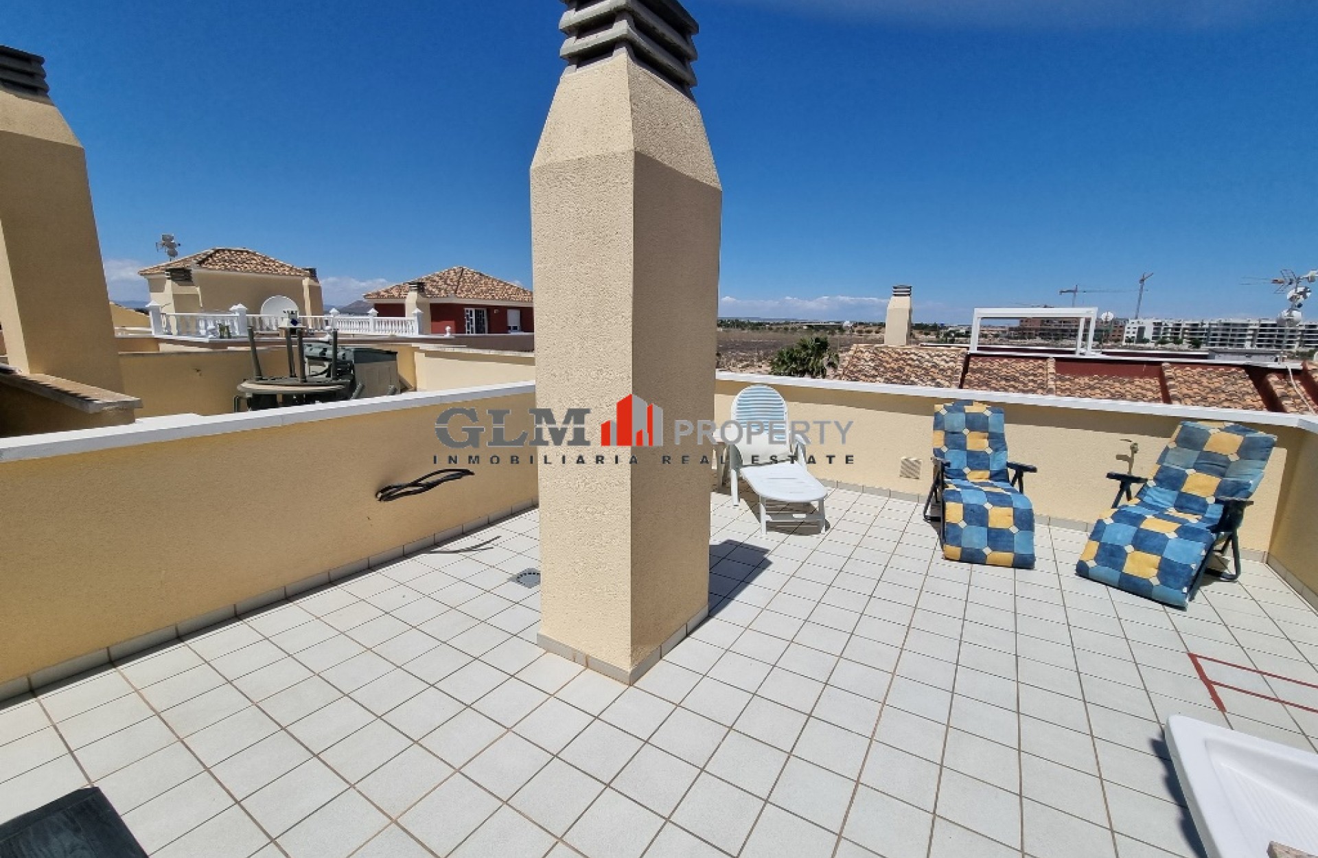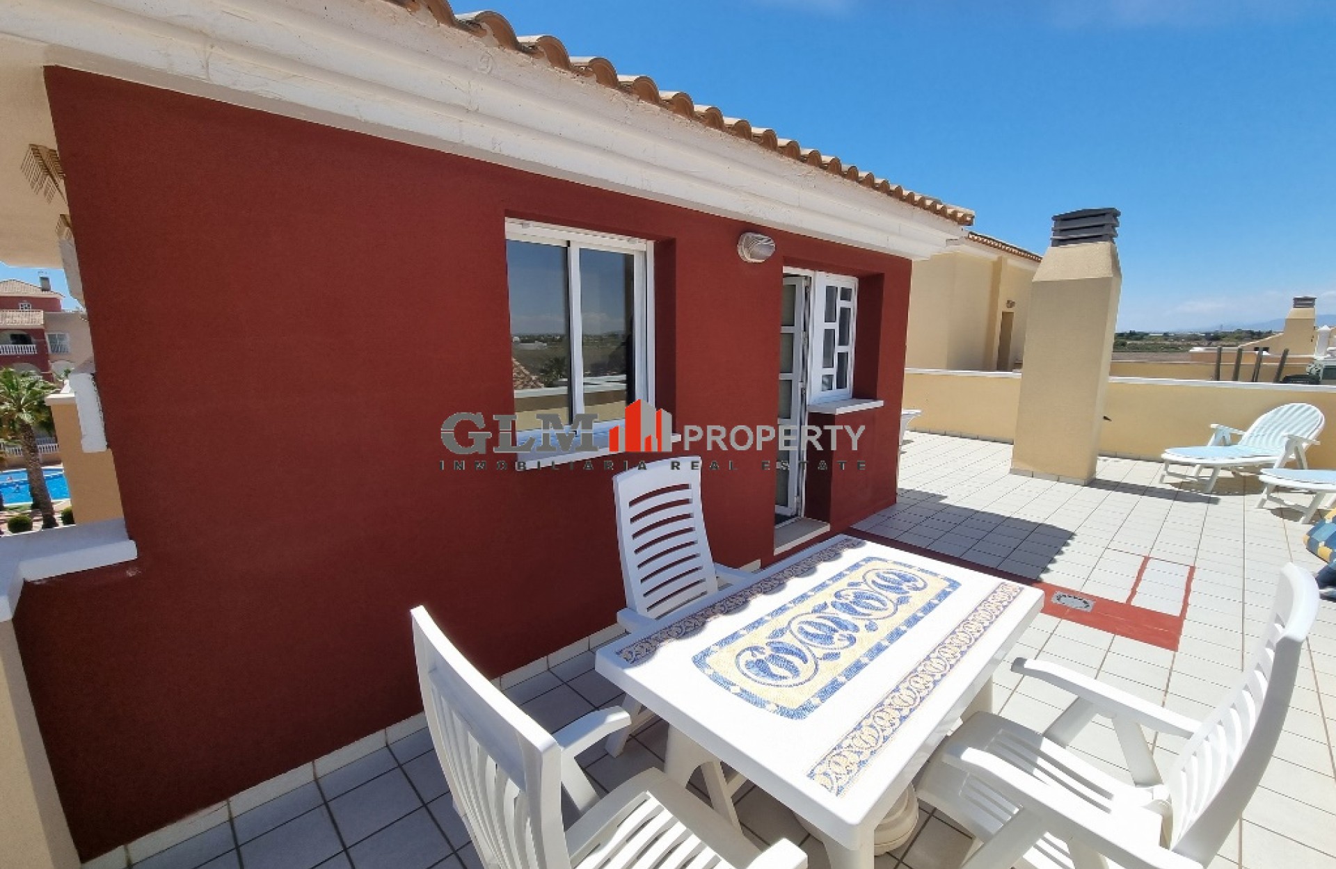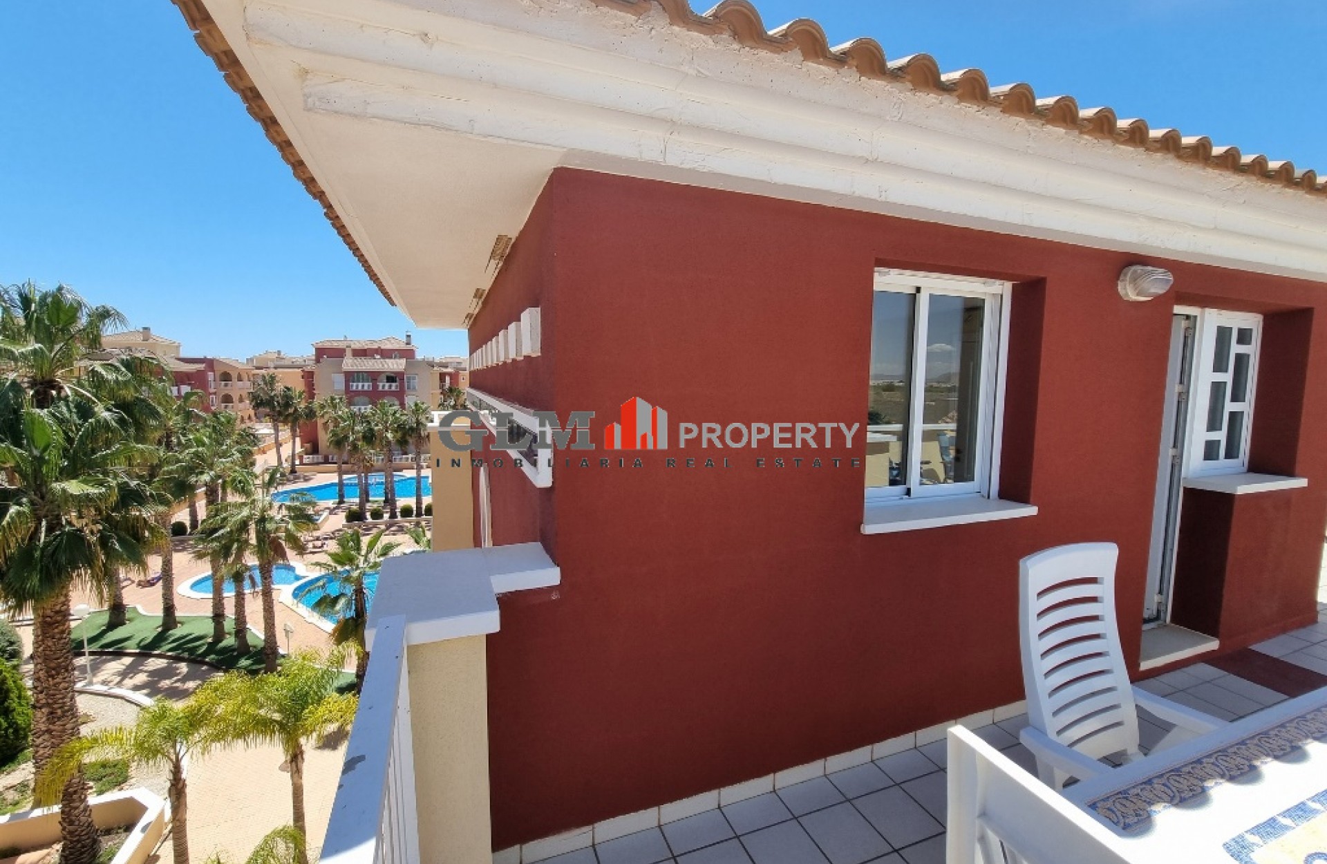 Lovely corner penthouse apartment on the ever popular Puerta Marina Complex! The property benefits from having an open plan kitchen, dining area and lounge all together. There is a large double balcony that you have access from the lounge and the main bedroom. Both bedroom are doubles and very light and airy due to the large windows. Inbetween the 2 bedrooms is the good sized bathroom with a bath. Upstairs there is a large solarium with views out over the town that also has a large room and its own bathroom. This could be used as a 3rd bedroom but also saves having to go downstairs when you are on the solarium for any length of time. Puerta Marina is a very popular complex as it has 3 large communal pool with lots of communal areas and is ever so close to the restaurants, Bars , supermarkets and also the Beach and promenade.