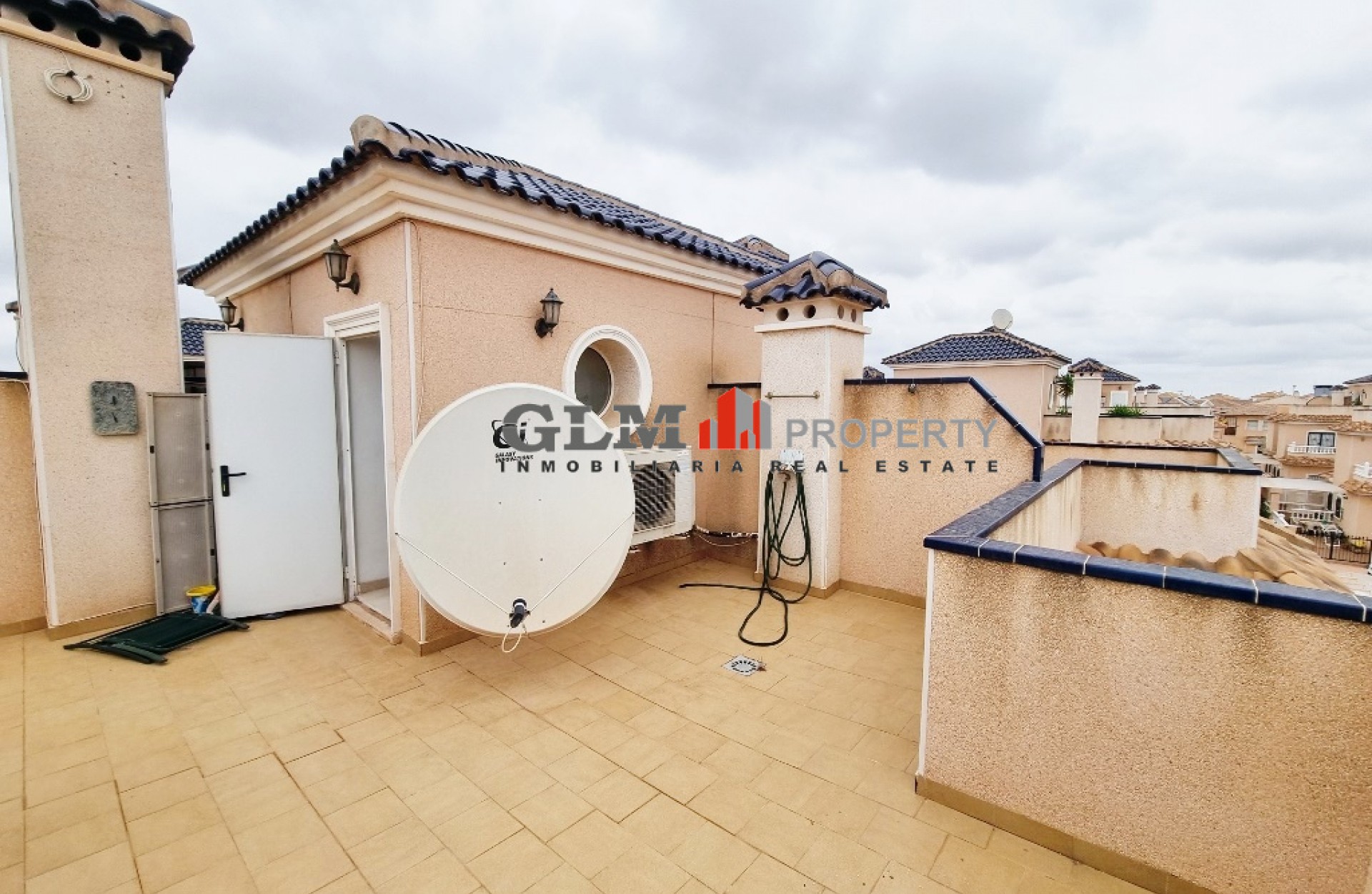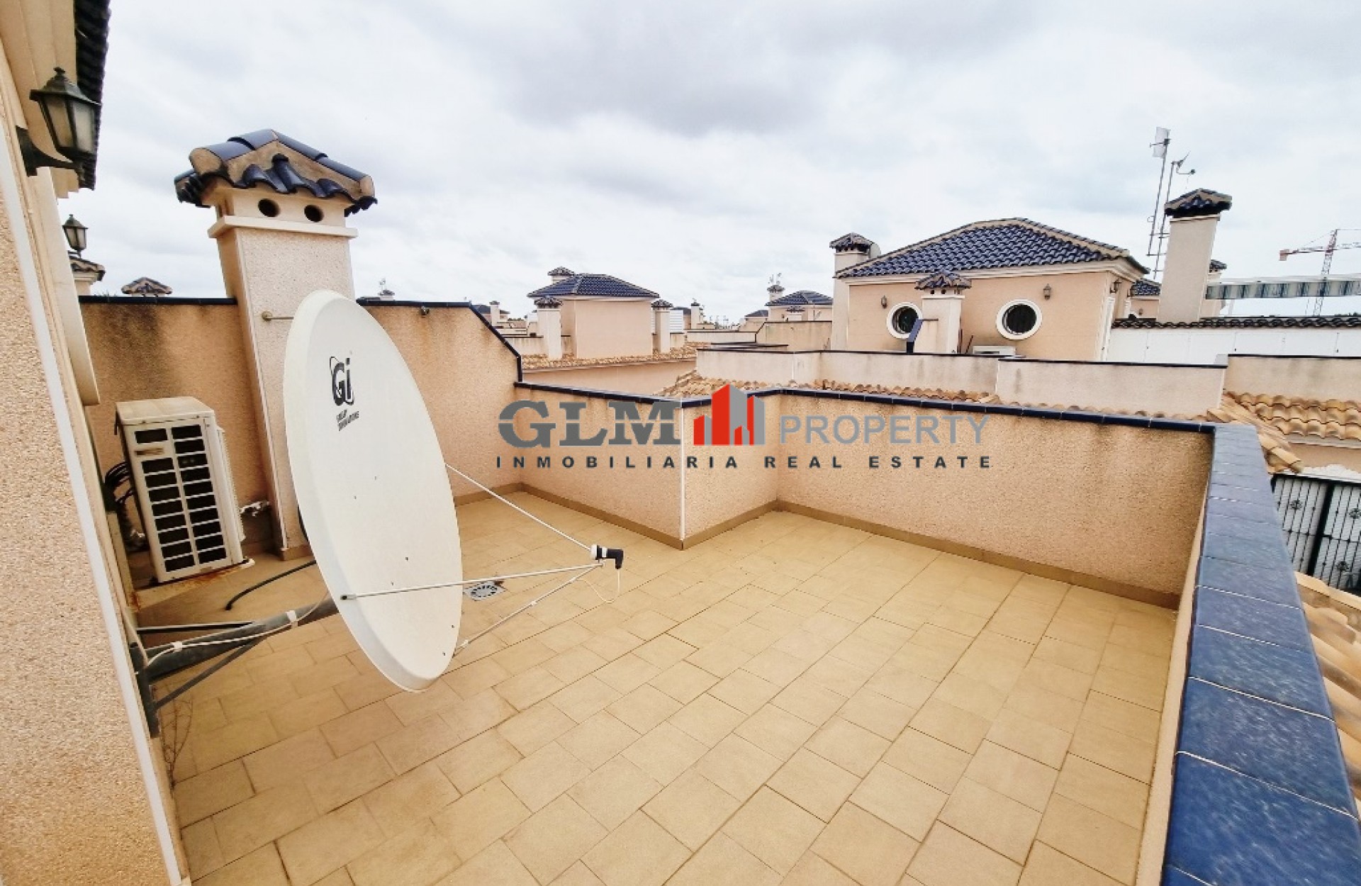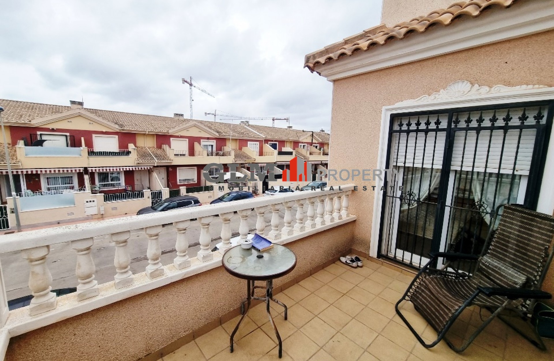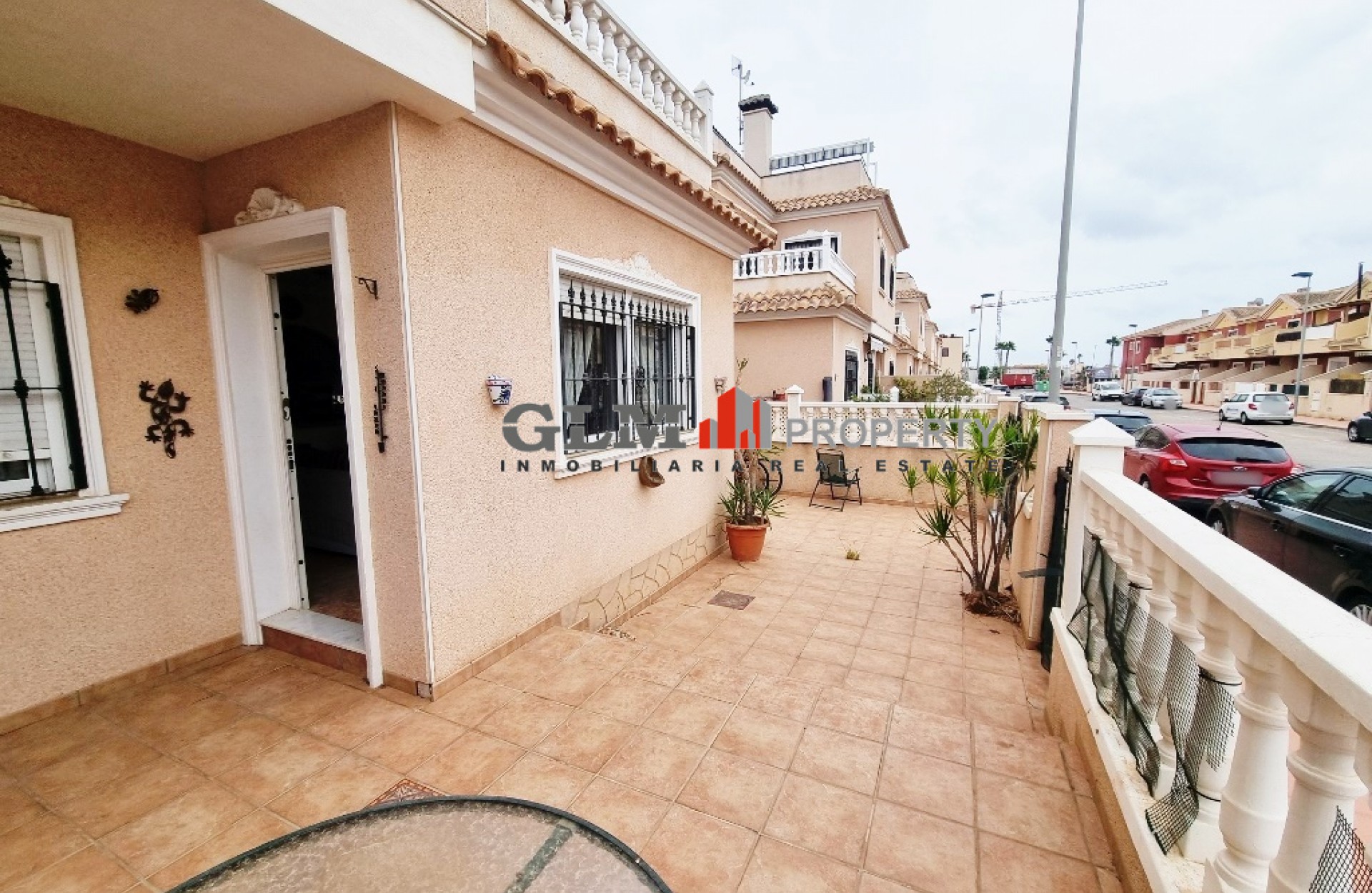 Quad townhouse with off road parking and spacious front terrace. The communal pool is around the corner. The living room/ lounge has a chimney and an open kitchen. There are two bathrooms - one with walk-in shower and the other one with a tub. Two bedrooms with fitted wardrobes and air conditioning, and both with access to the same terrace/balcony on the first floor. The top floor has got a roof top solarium. The property is sold fully furnished and with an equipped kitchen. Located in excellent location Euro Roda, San Javier. Walking distance to supermarkets, shops, restaurants, bars, banks.