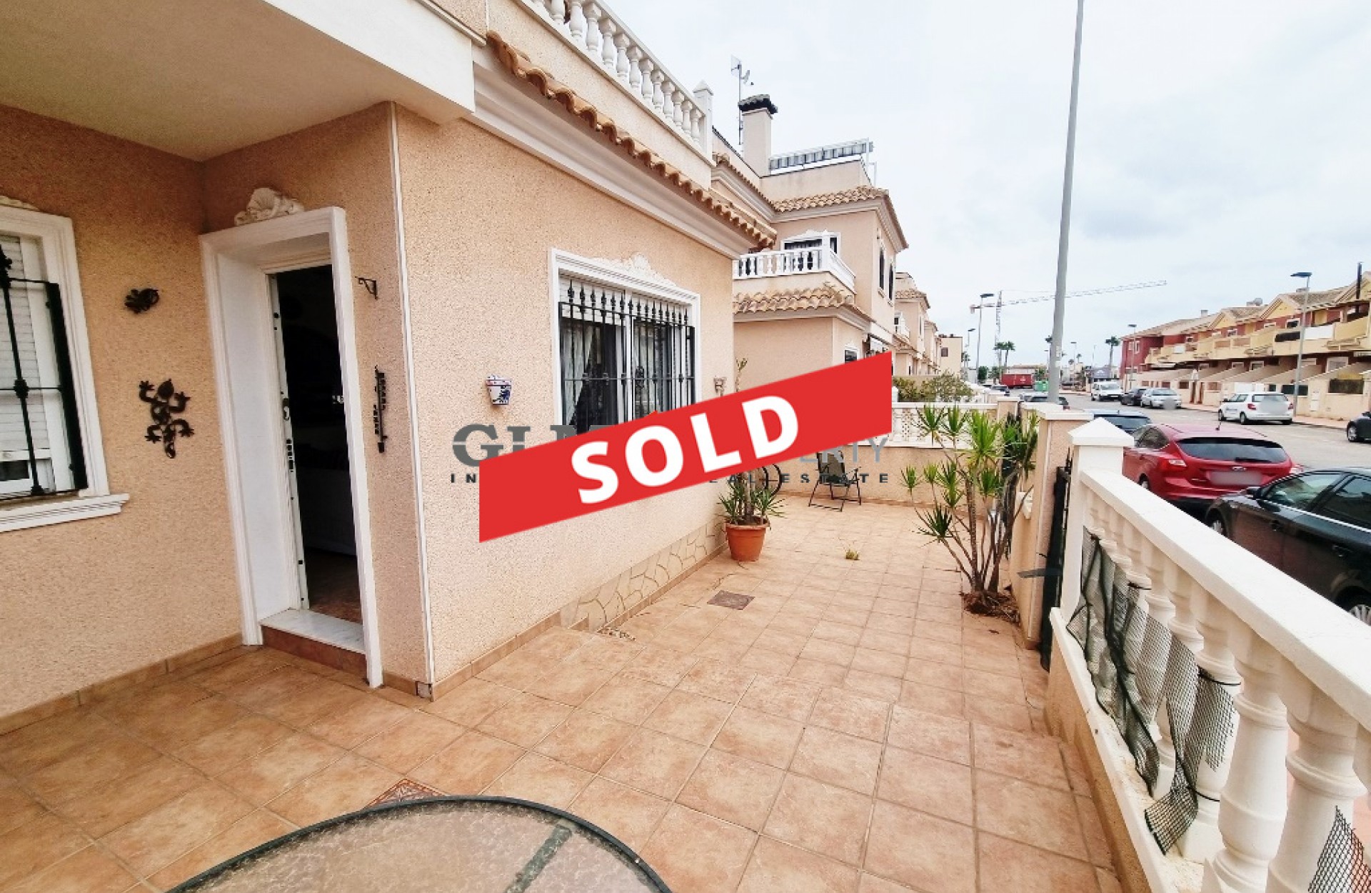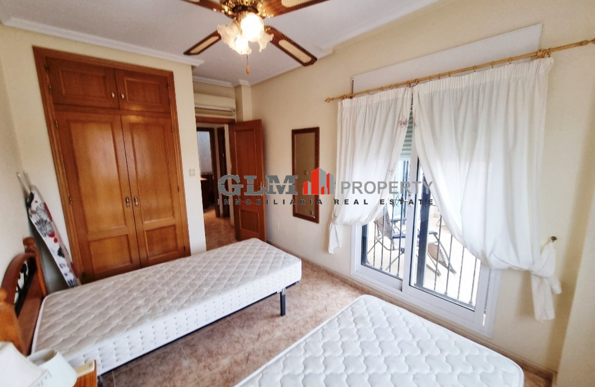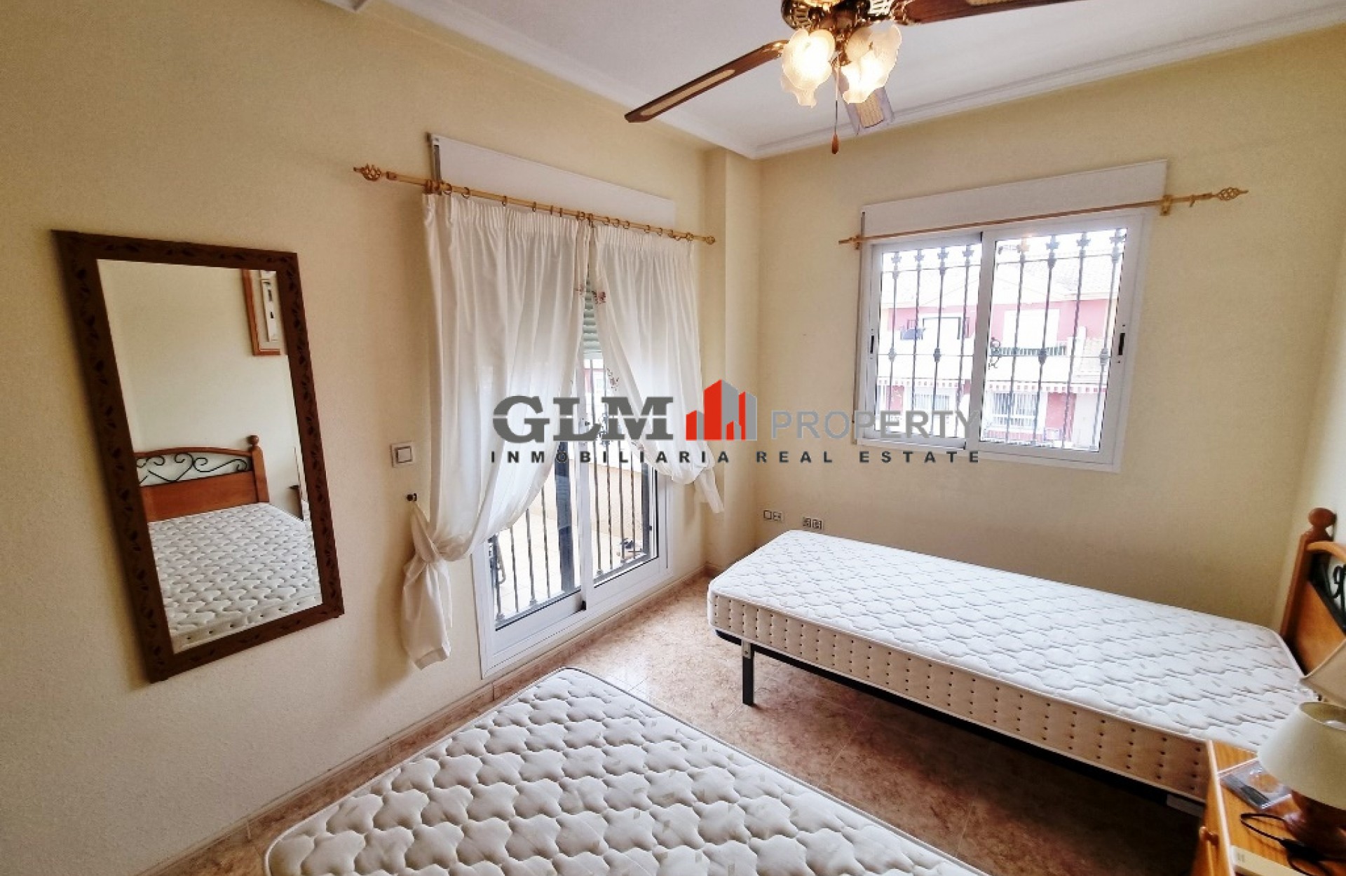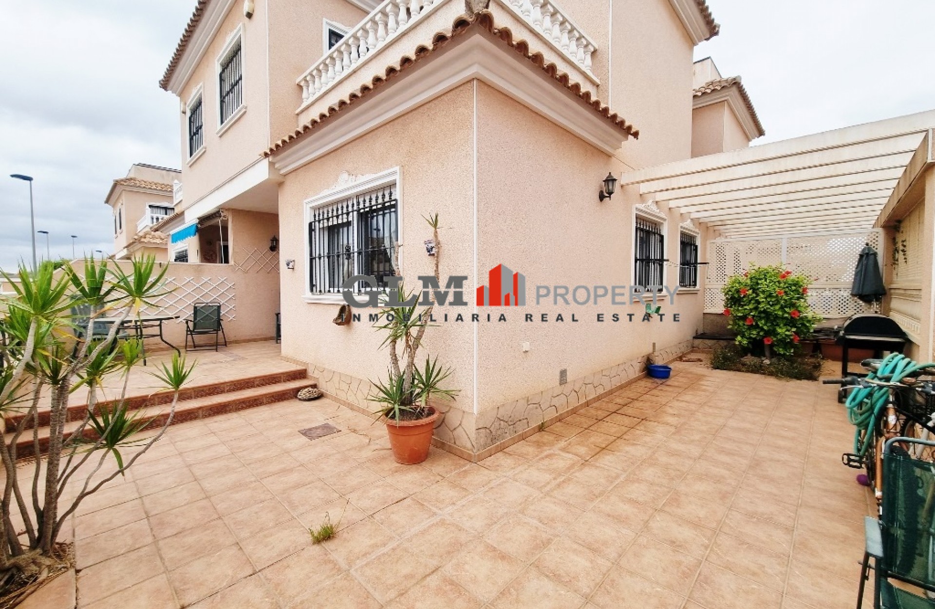 Quad townhouse with off road parking and spacious front terrace. The communal pool is around the corner. The living room/ lounge has a chimney and an open kitchen. There are two bathrooms - one with walk-in shower and the other one with a tub. Two bedrooms with fitted wardrobes and air conditioning, and both with access to the same terrace/balcony on the first floor. The top floor has got a roof top solarium. The property is sold fully furnished and with an equipped kitchen. Located in excellent location Euro Roda, San Javier. Walking distance to supermarkets, shops, restaurants, bars, banks.
