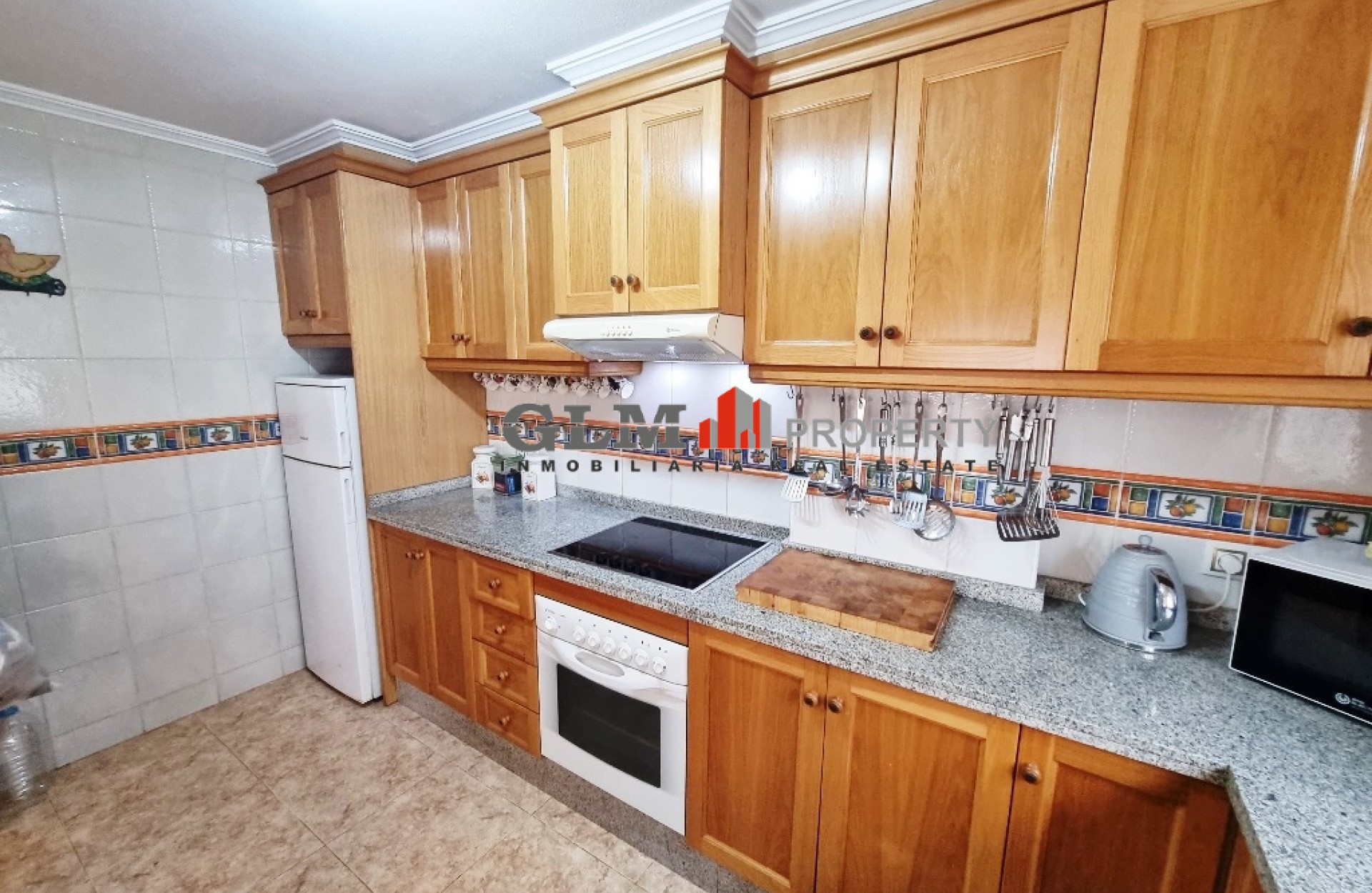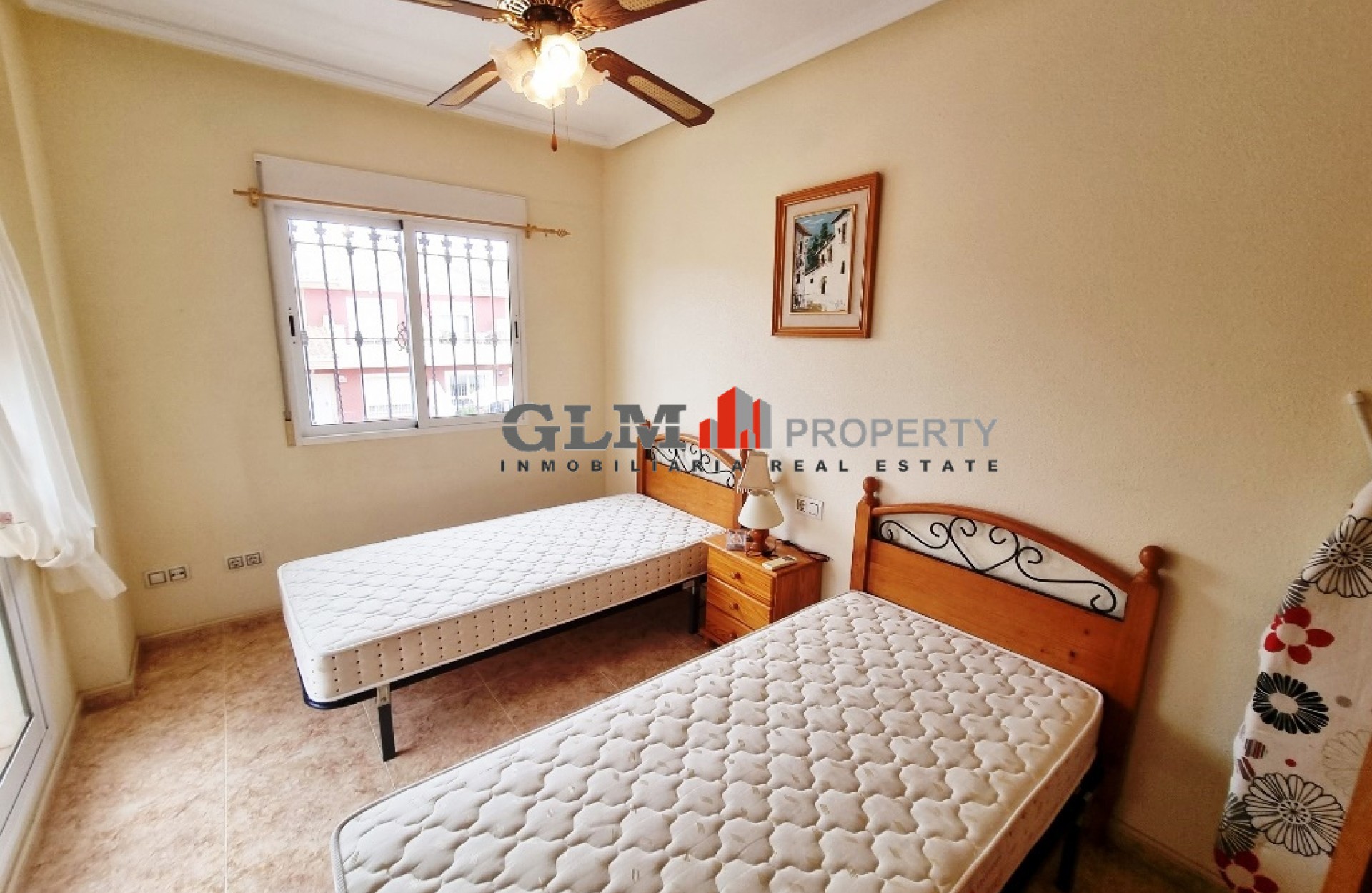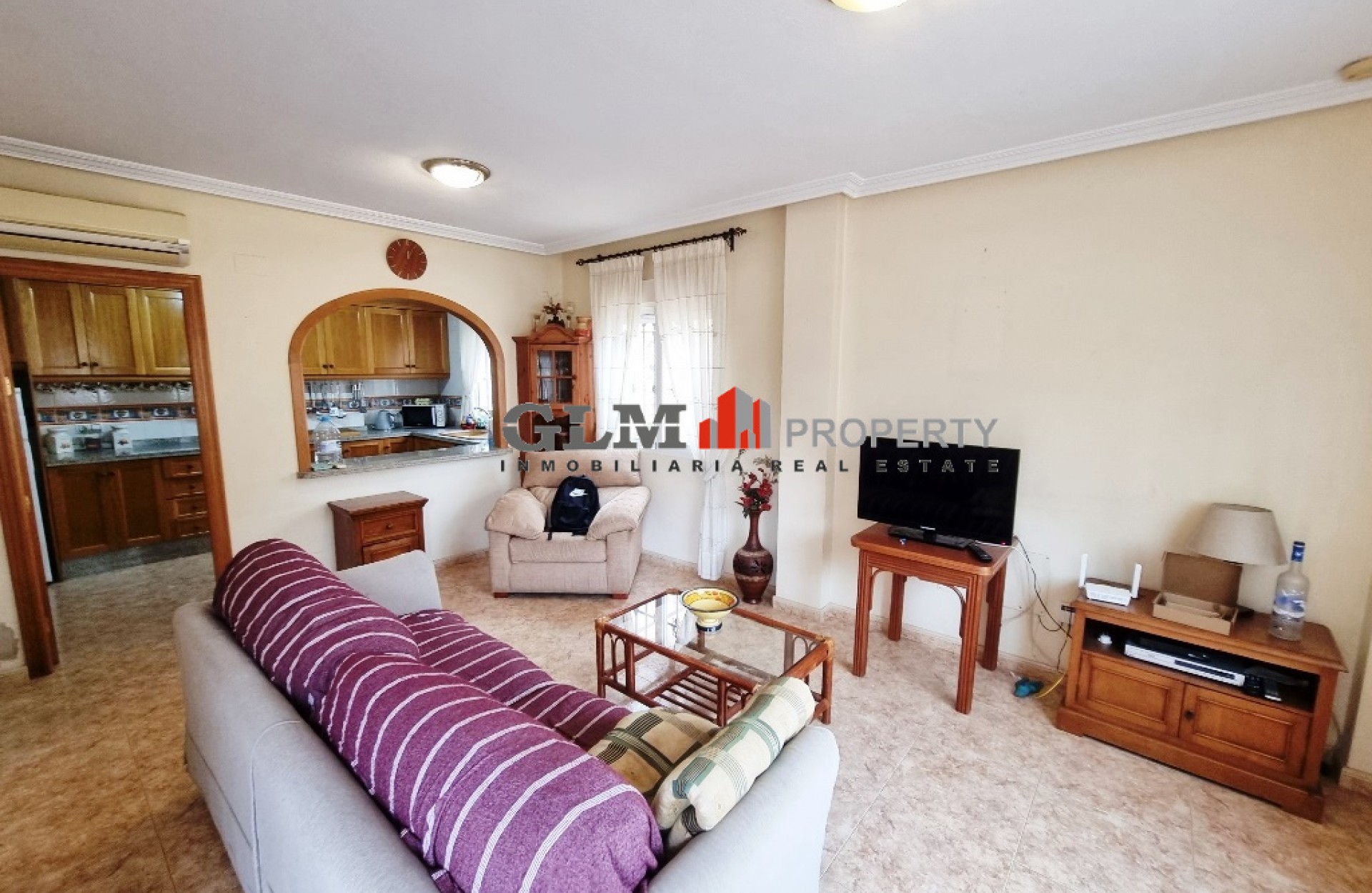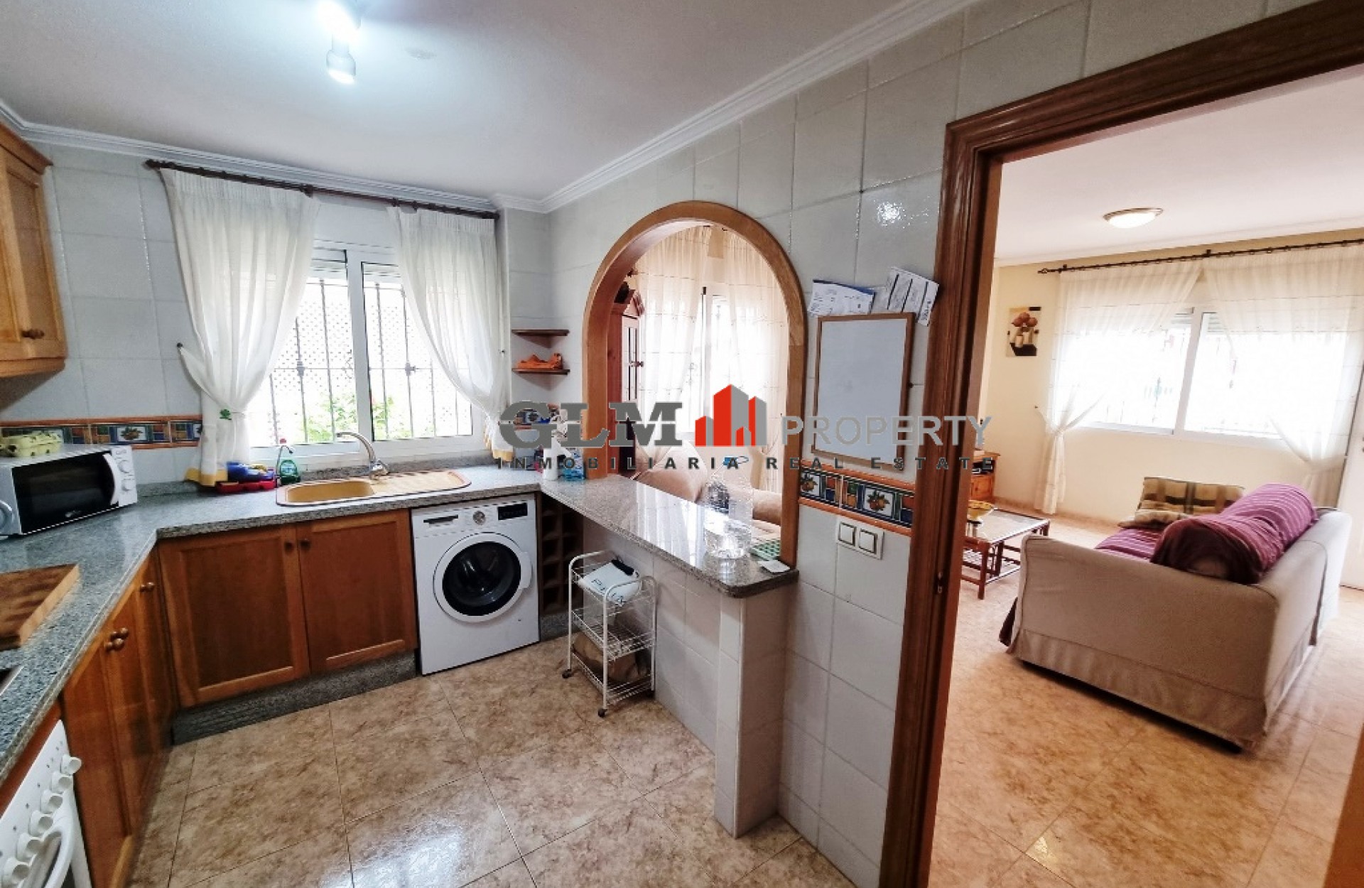 Quad townhouse with off road parking and spacious front terrace. The communal pool is around the corner. The living room/ lounge has a chimney and an open kitchen. There are two bathrooms - one with walk-in shower and the other one with a tub. Two bedrooms with fitted wardrobes and air conditioning, and both with access to the same terrace/balcony on the first floor. The top floor has got a roof top solarium. The property is sold fully furnished and with an equipped kitchen. Located in excellent location Euro Roda, San Javier. Walking distance to supermarkets, shops, restaurants, bars, banks.