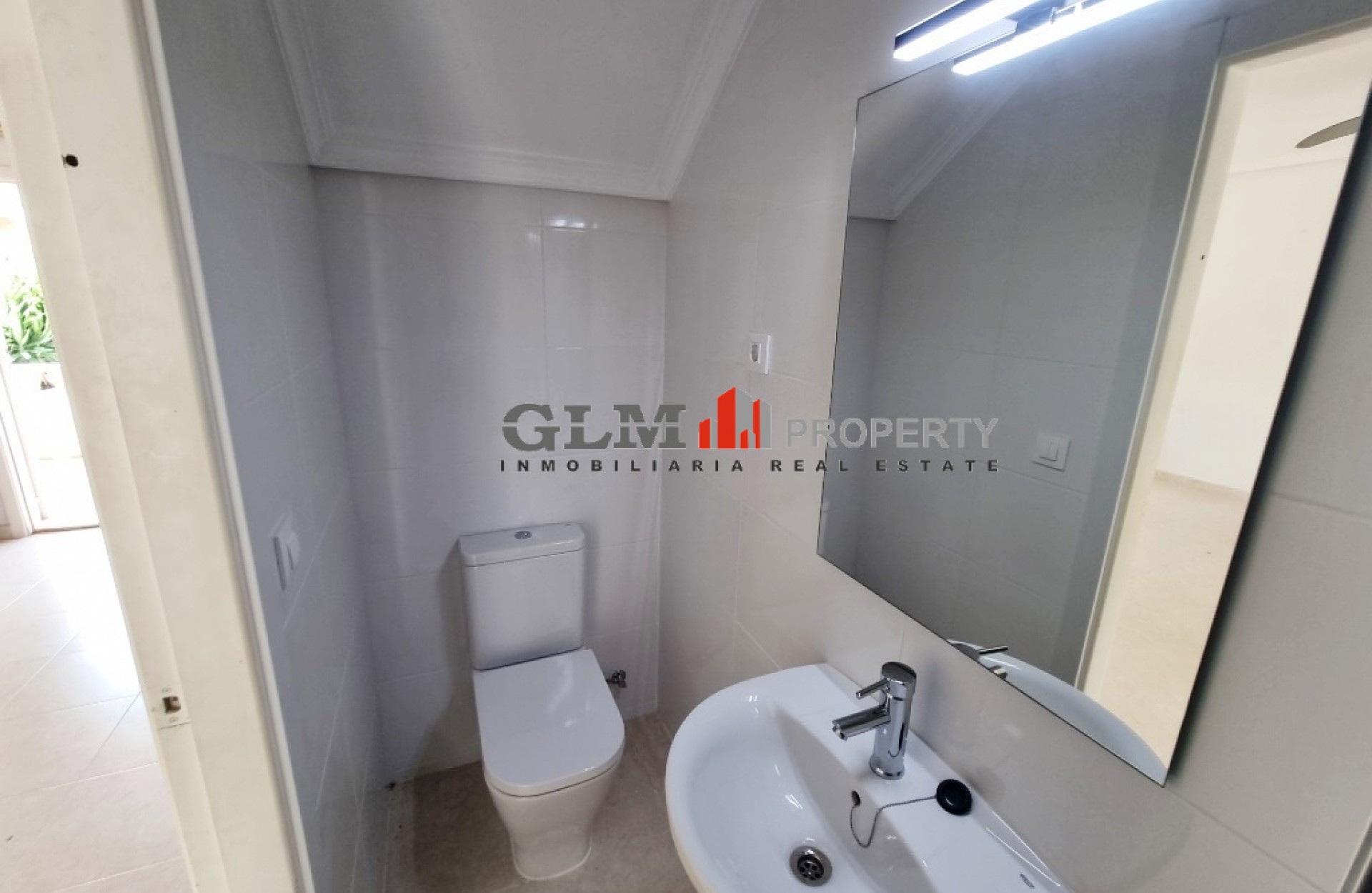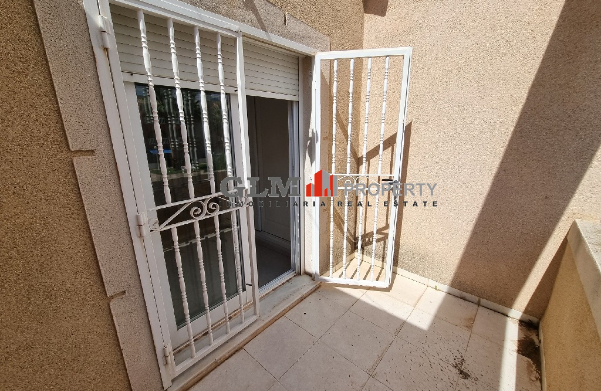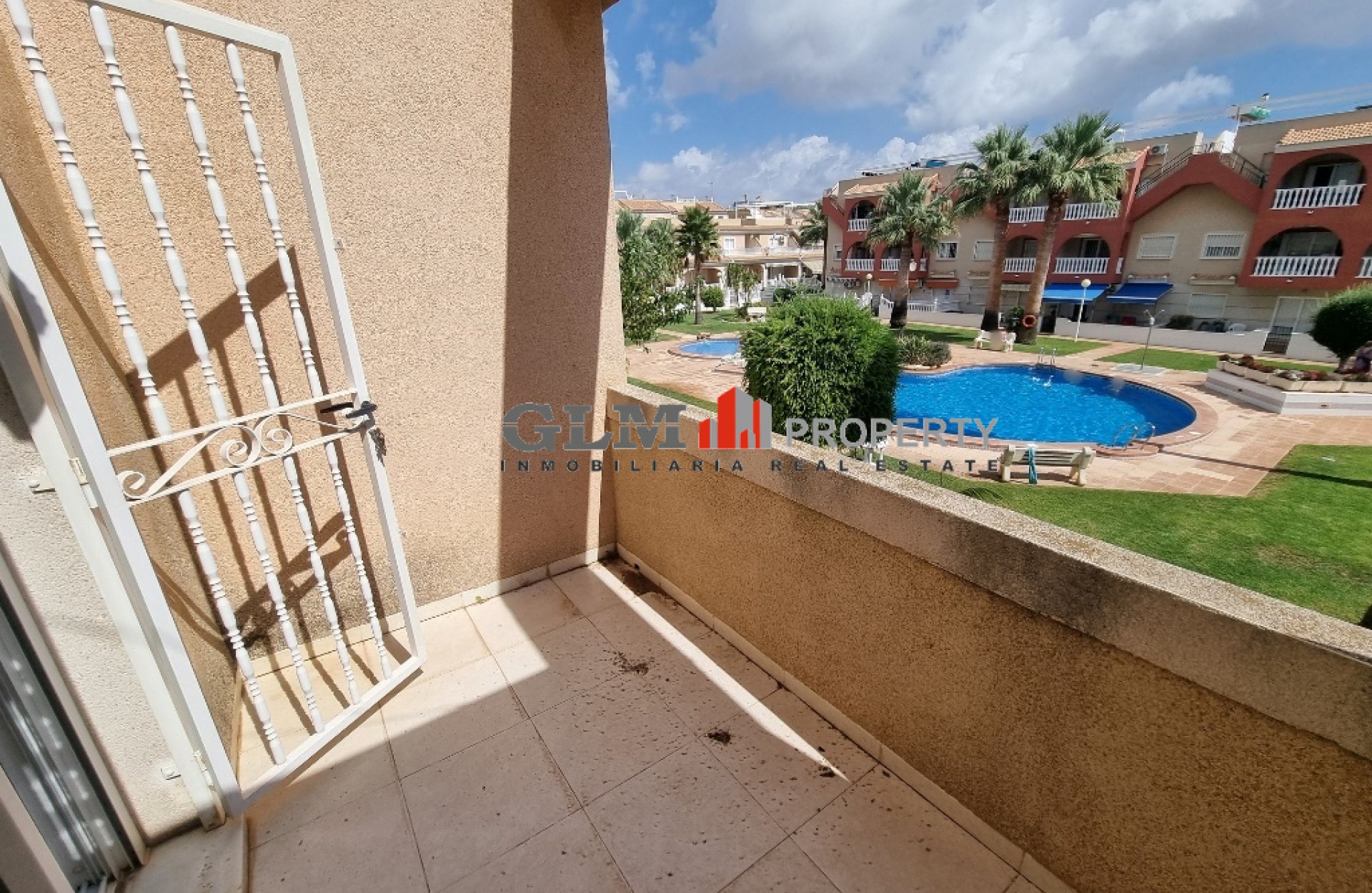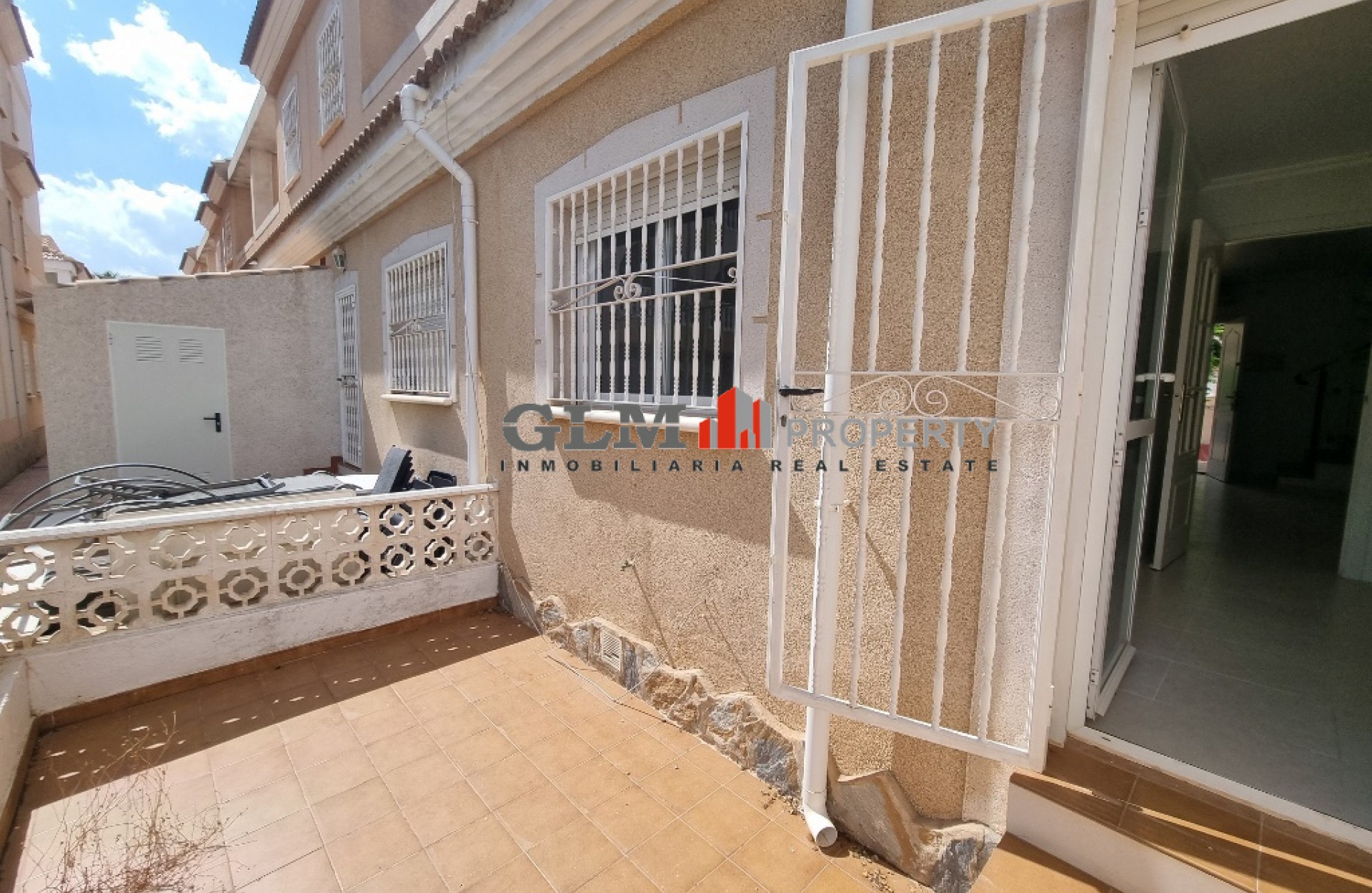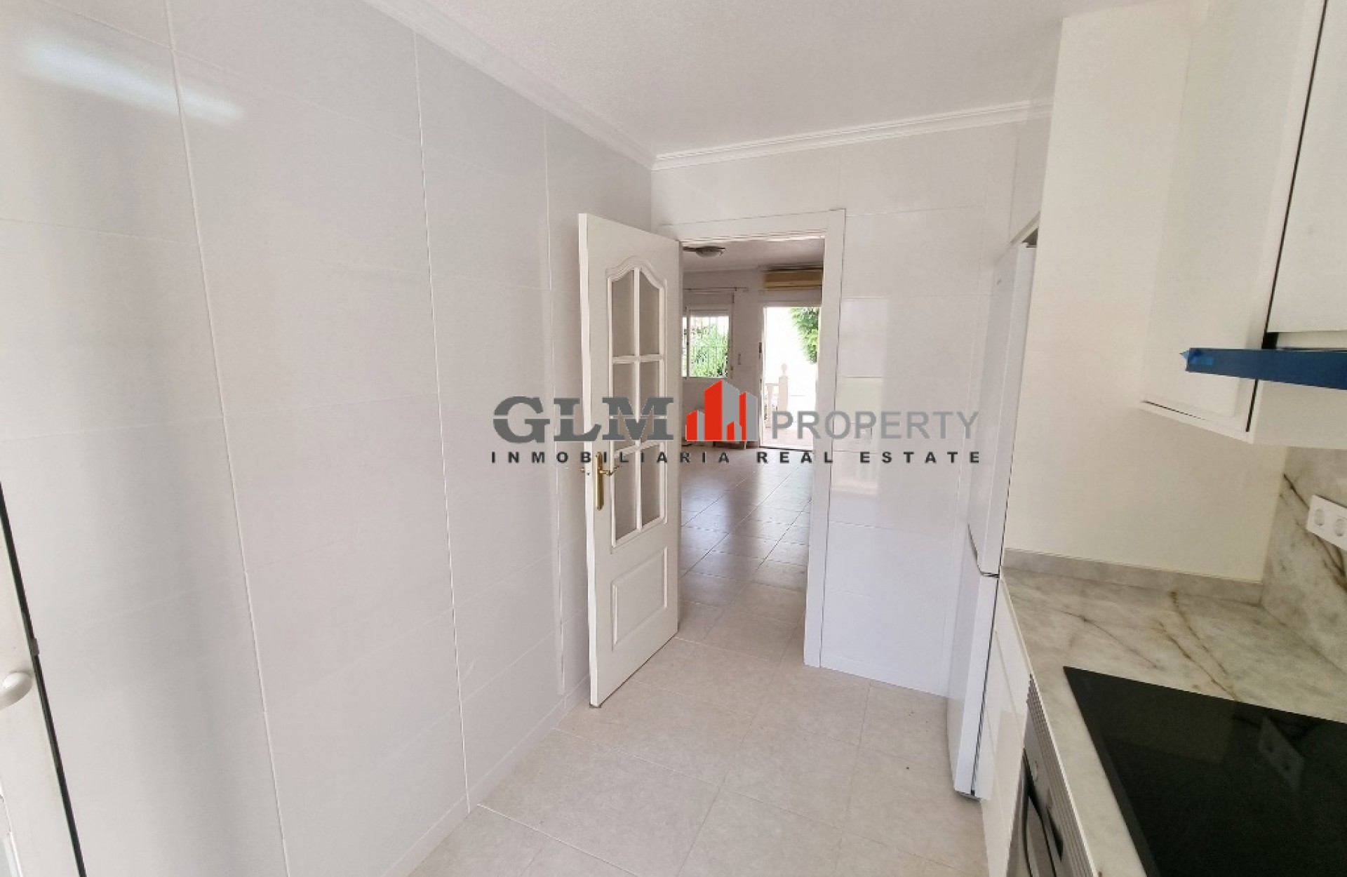 South-facing townhouse located in the El Divino complex with front garden and porch. This home features three spacious bedrooms and two bathrooms. The ground floor offers a large living/dining area, a double bedroom, and a bathroom with a shower. The independent kitchen opens onto a back terrace, complete with a storeroom and views of the communal pool. Upstairs, you'll find two more double bedrooms with fitted wardrobes and private balconies. The master bedroom's balcony provides access to a rooftop solarium, perfect for sunbathing. The large upstairs bathroom includes both a tub and a walk-in shower. The property also includes air conditioning. It is sold empty, ready for you to make it your own. Enjoy the beautifully maintained gardens and two large community pools within the El Divino complex. Located just a few minutes' walk from a lively square filled with shops, restaurants, and bars, and a short stroll to the beach.