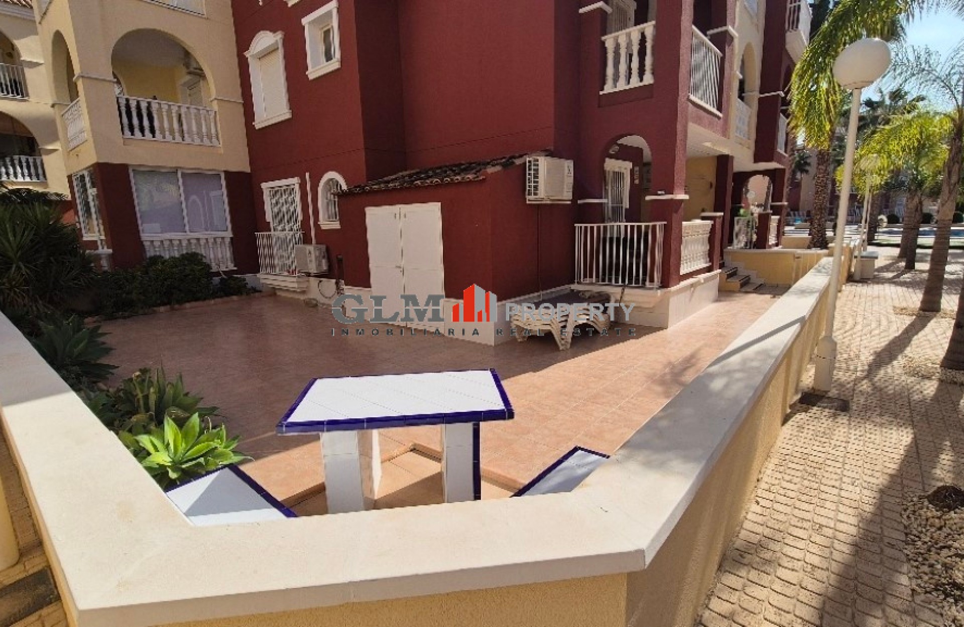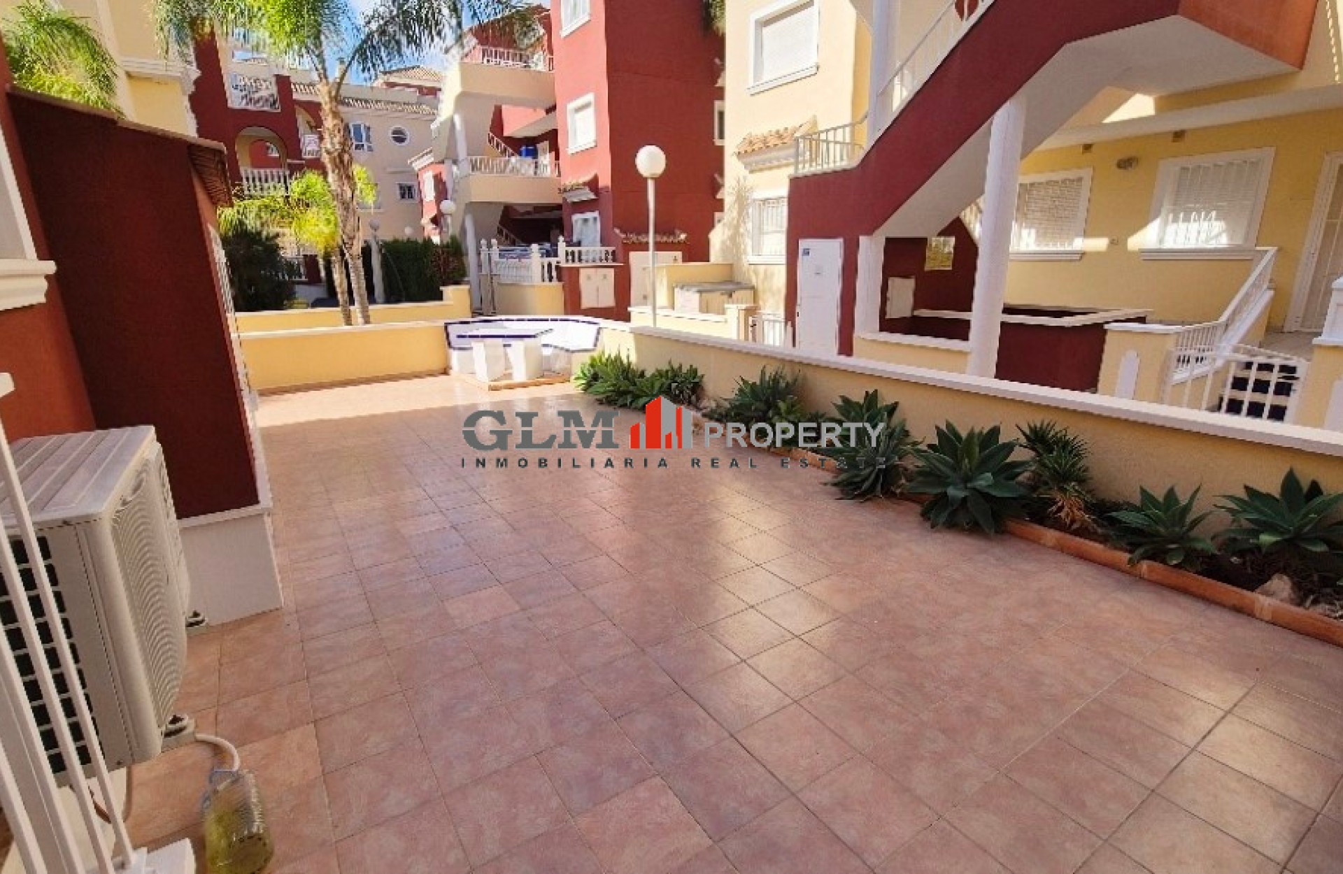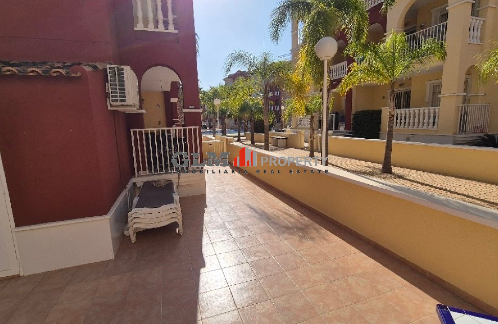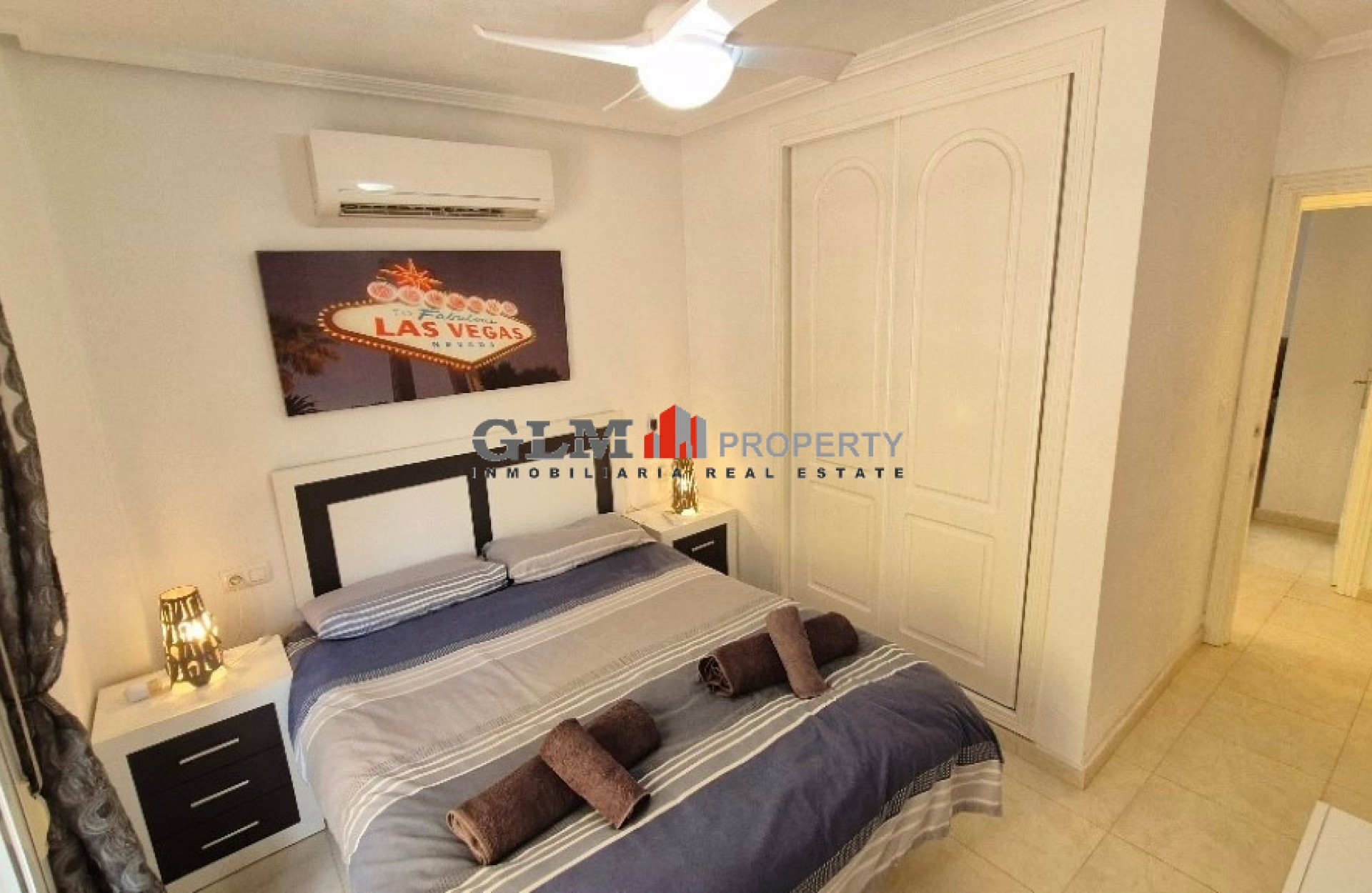 A ground floor corner apartment in the very popular Puerto Marina Complex. When entering you will find a spacious living/ dining room and a fully equipped kitchen. There are 2 large bedrooms with fitted wardrobes and a good sized bathroom with walk-in shower. The property is to be sold fully furnished, making it move-in ready. Right around the corner from the spacious terrace with storage you find the communal pools and well maintained gardens. The complex is at a walking distance to everything: bars, restaurants, supermarkets and also the beach and promenade.