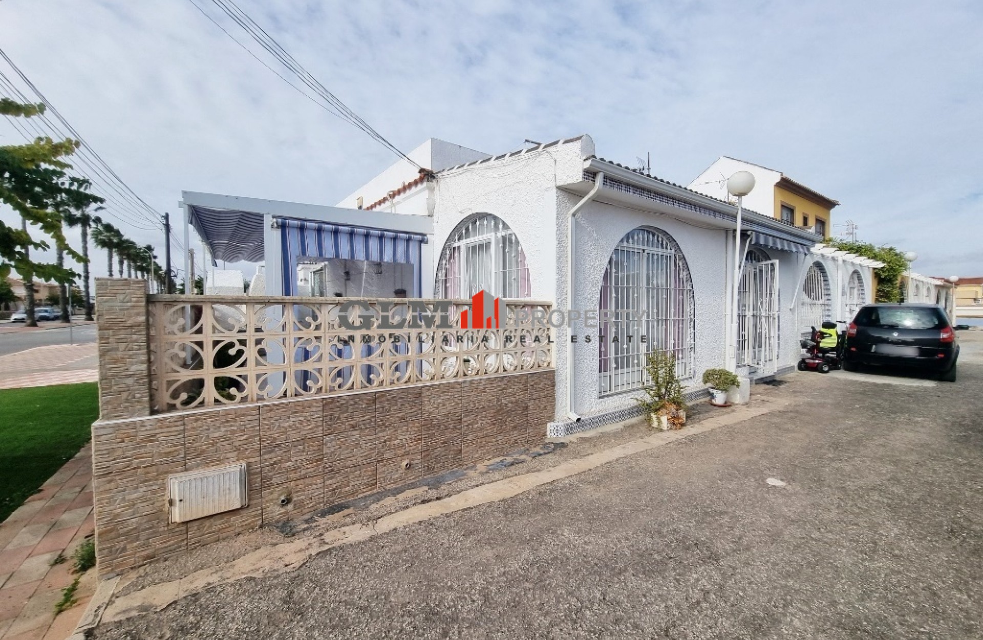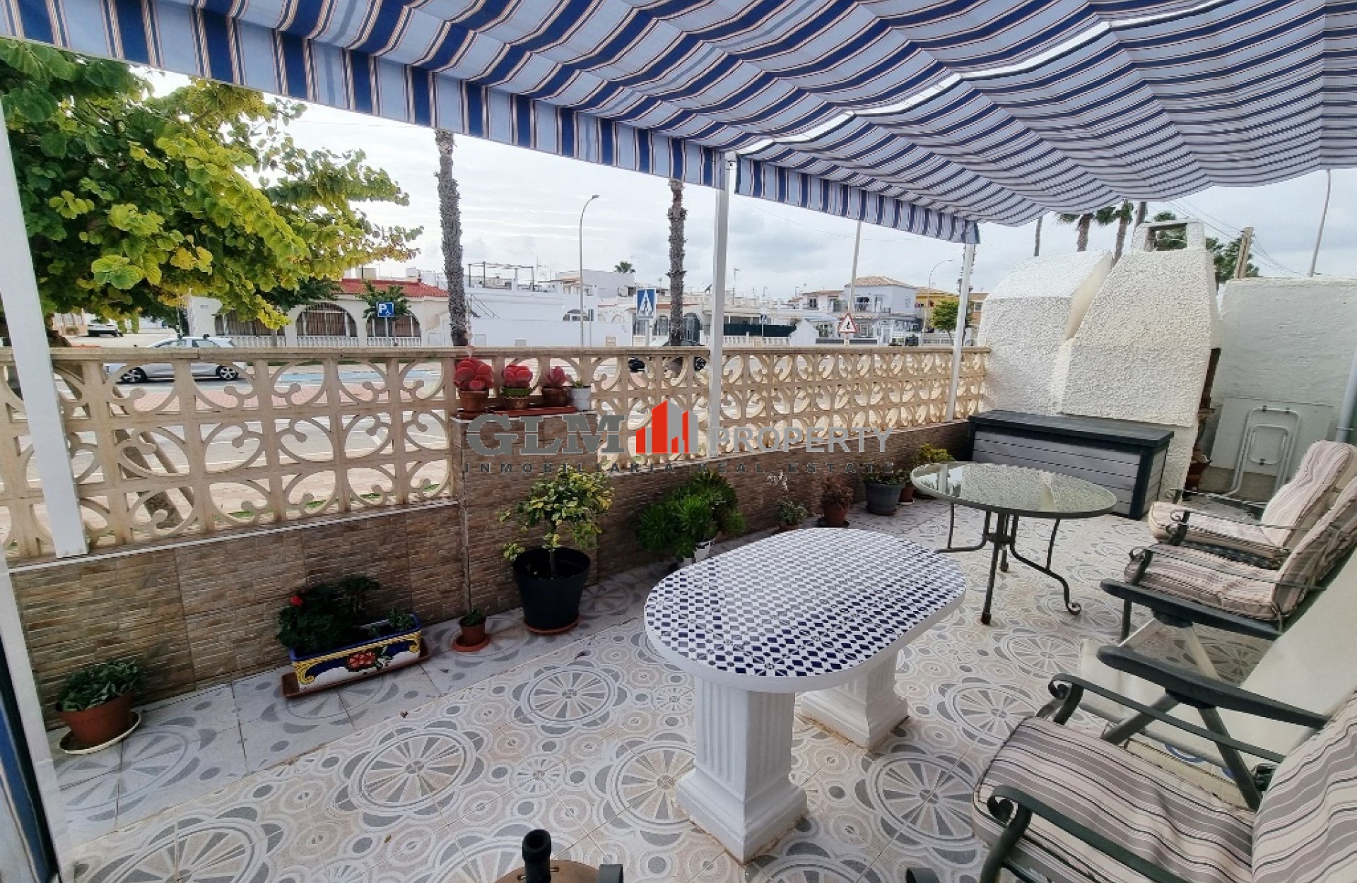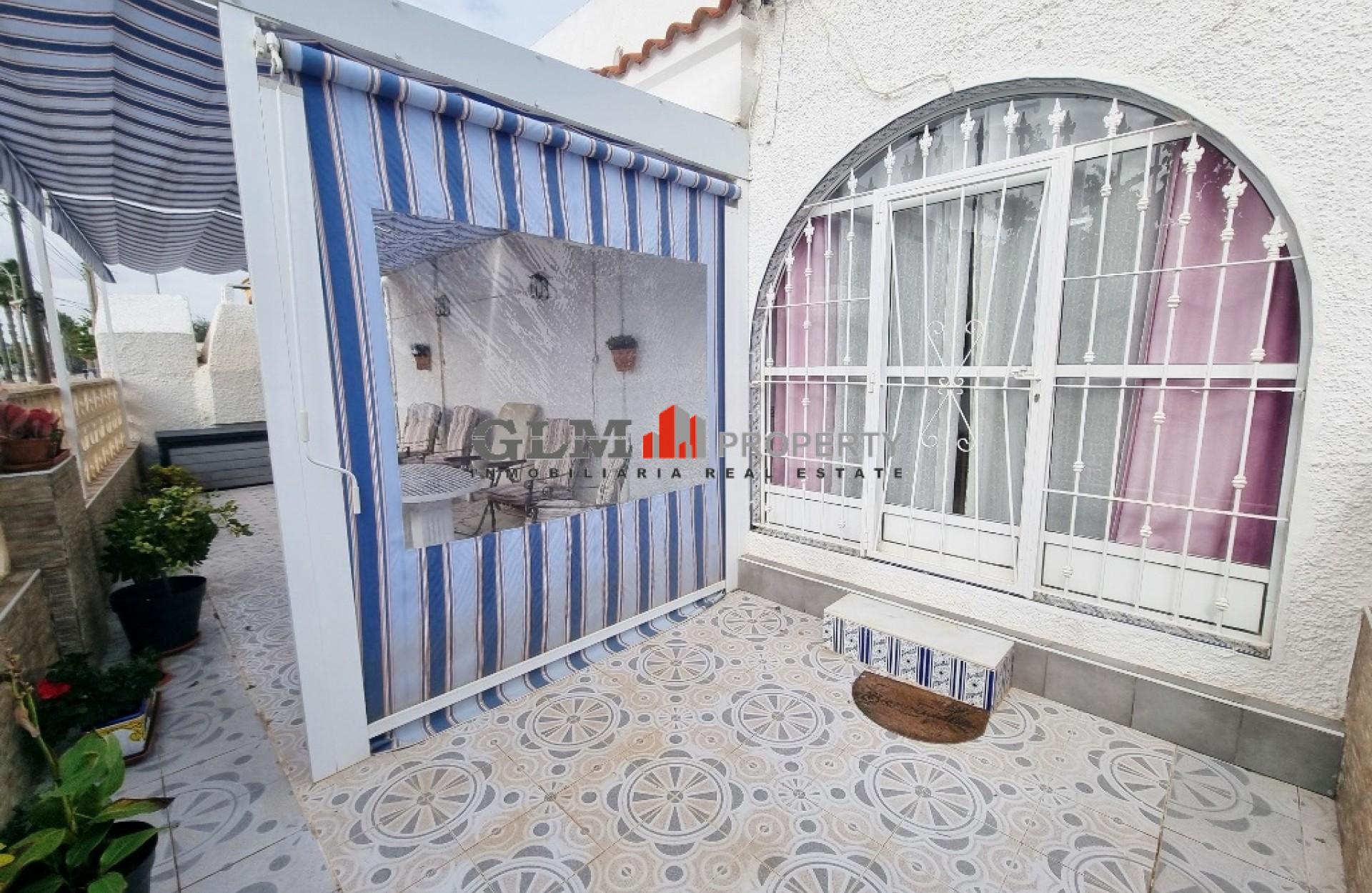 Take a look at this corner bungalow in the urbanization of Oasis, Los Narejos! Part of the front porch has been enclosed and is used as an additional lounge area. It features two spacious double bedrooms with built-in wardrobes. The recently renovated bathroom boasts a relaxing tub. The open plan kitchen has access to a side passage that leads to the side patio and to the stairs that lead to the rooftop solarium. At the side patio you find a dedicated barbecue area, perfect for al fresco dining with family and friends. For sun lovers, the rooftop solarium is a true highlight, offering a private retreat to soak up the sun. Situated just a short stroll from the Mar Menor promenade, this property is also conveniently close to essential amenities like supermarkets, banks, schools, and restaurants.