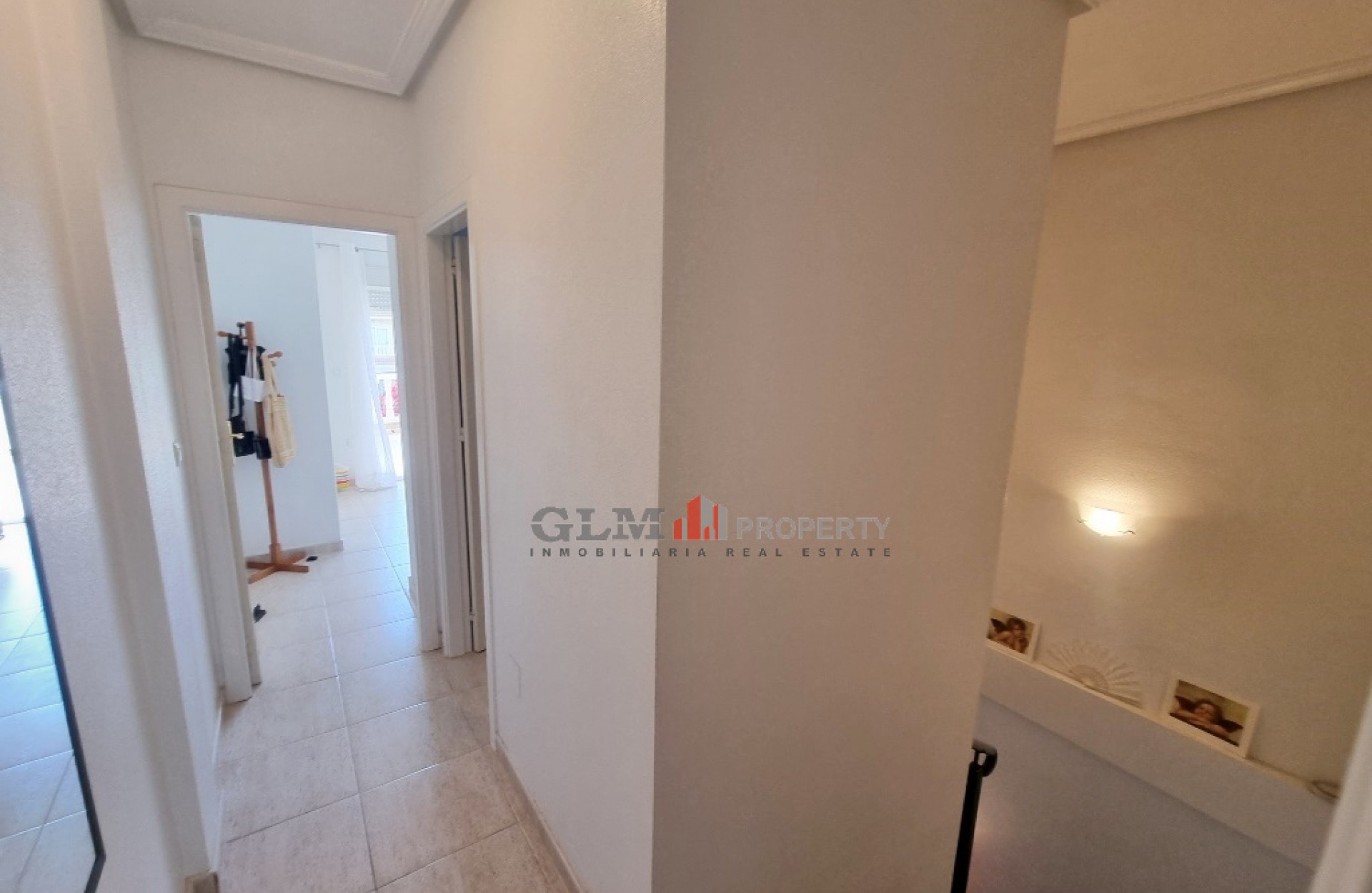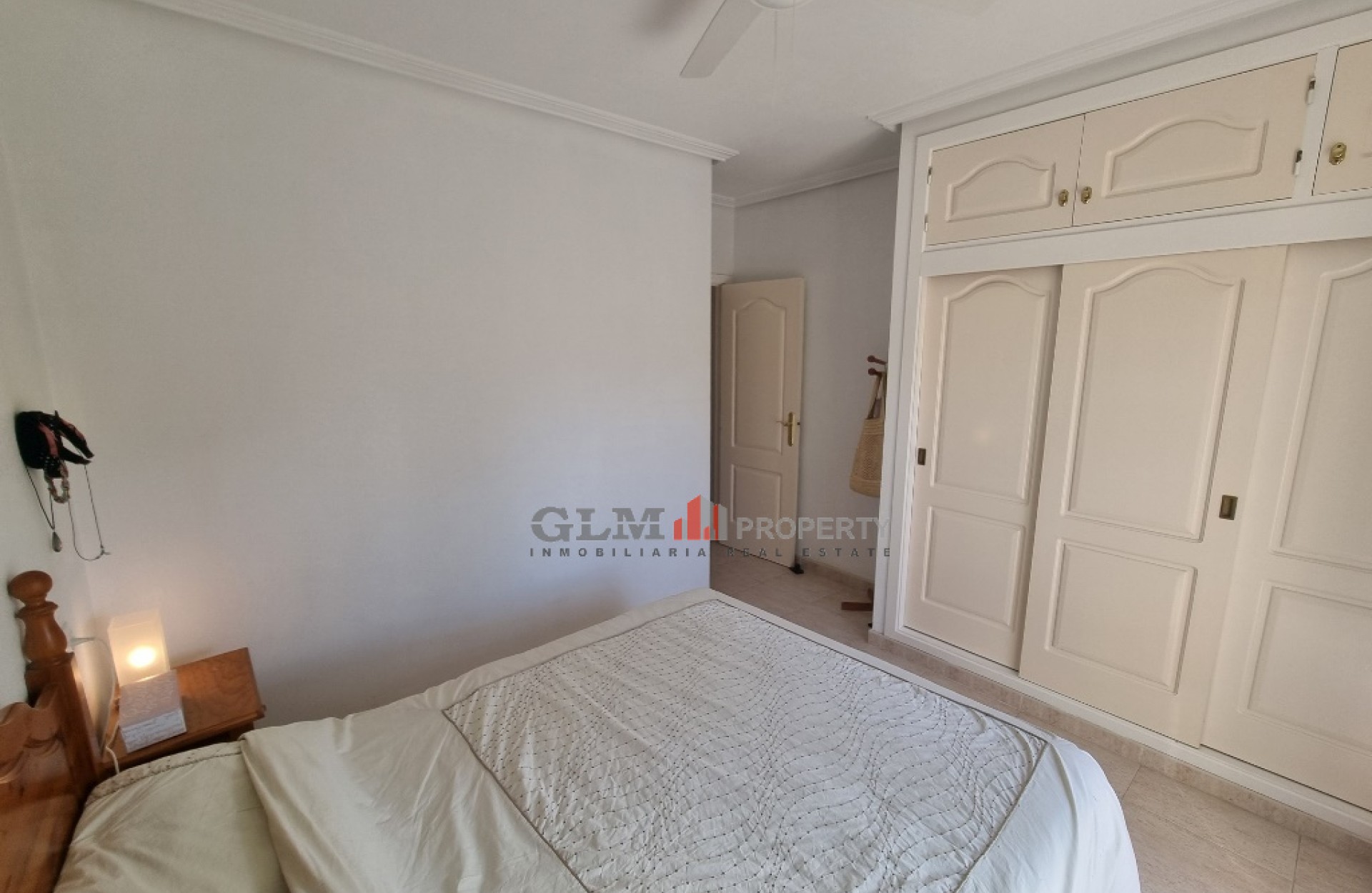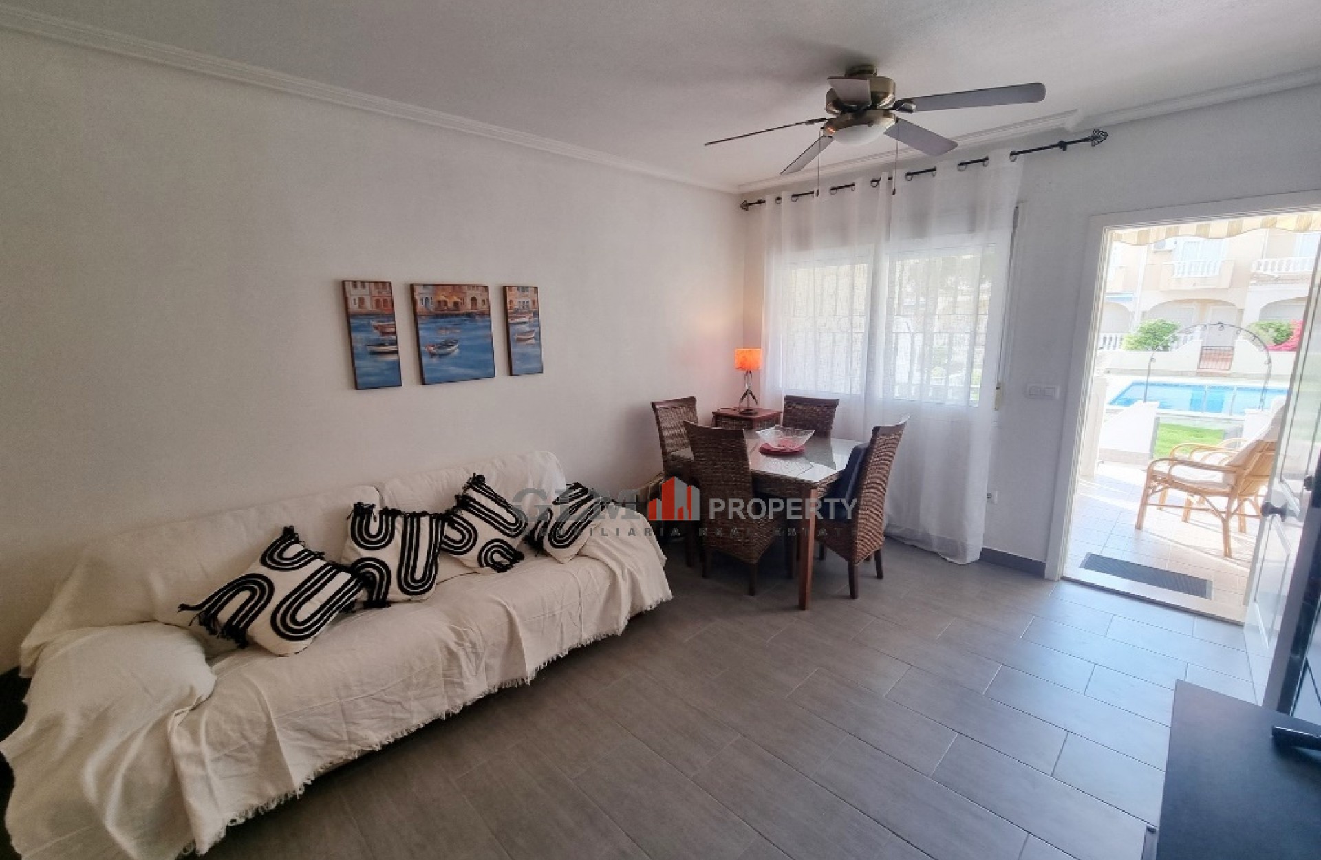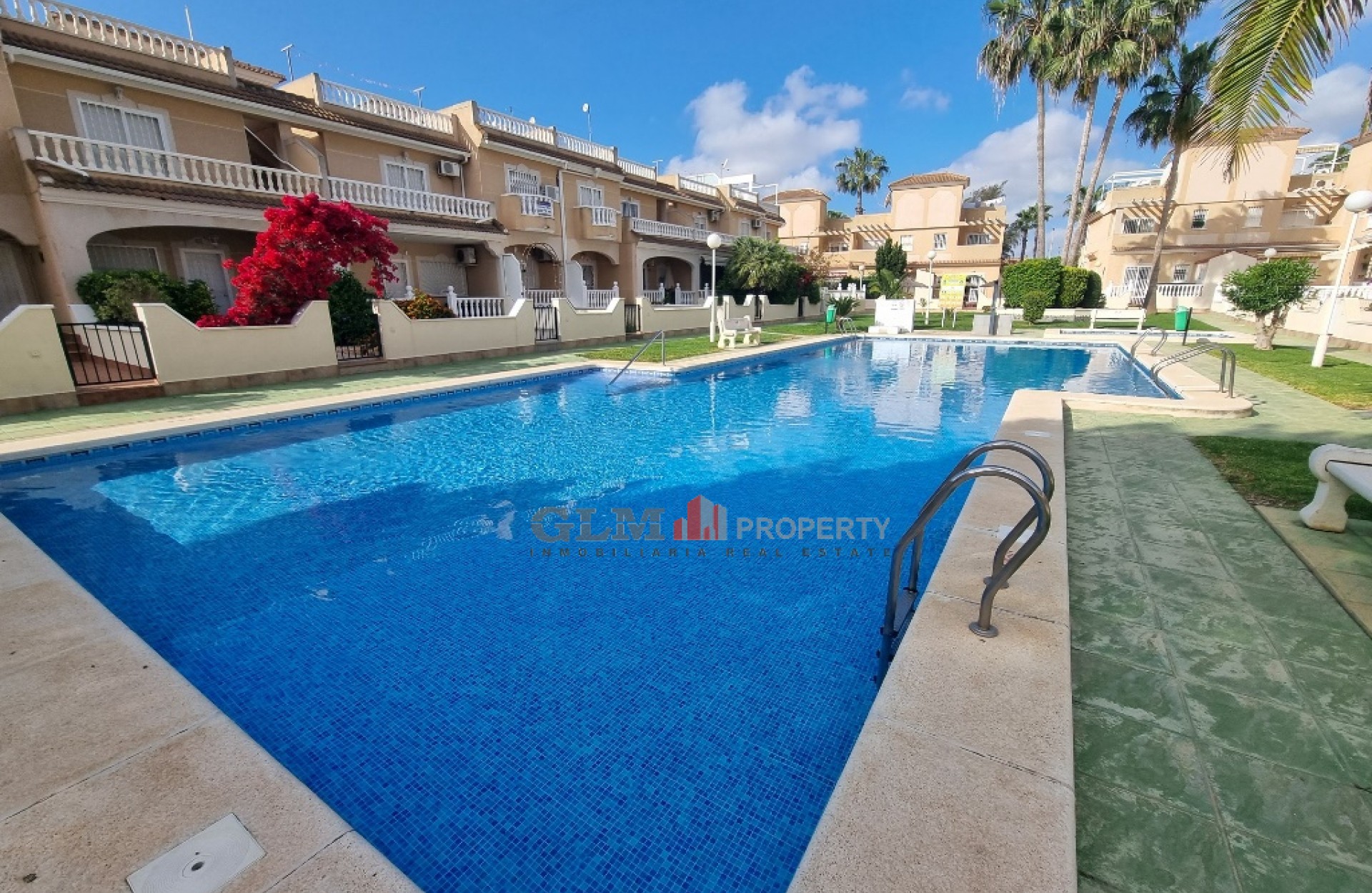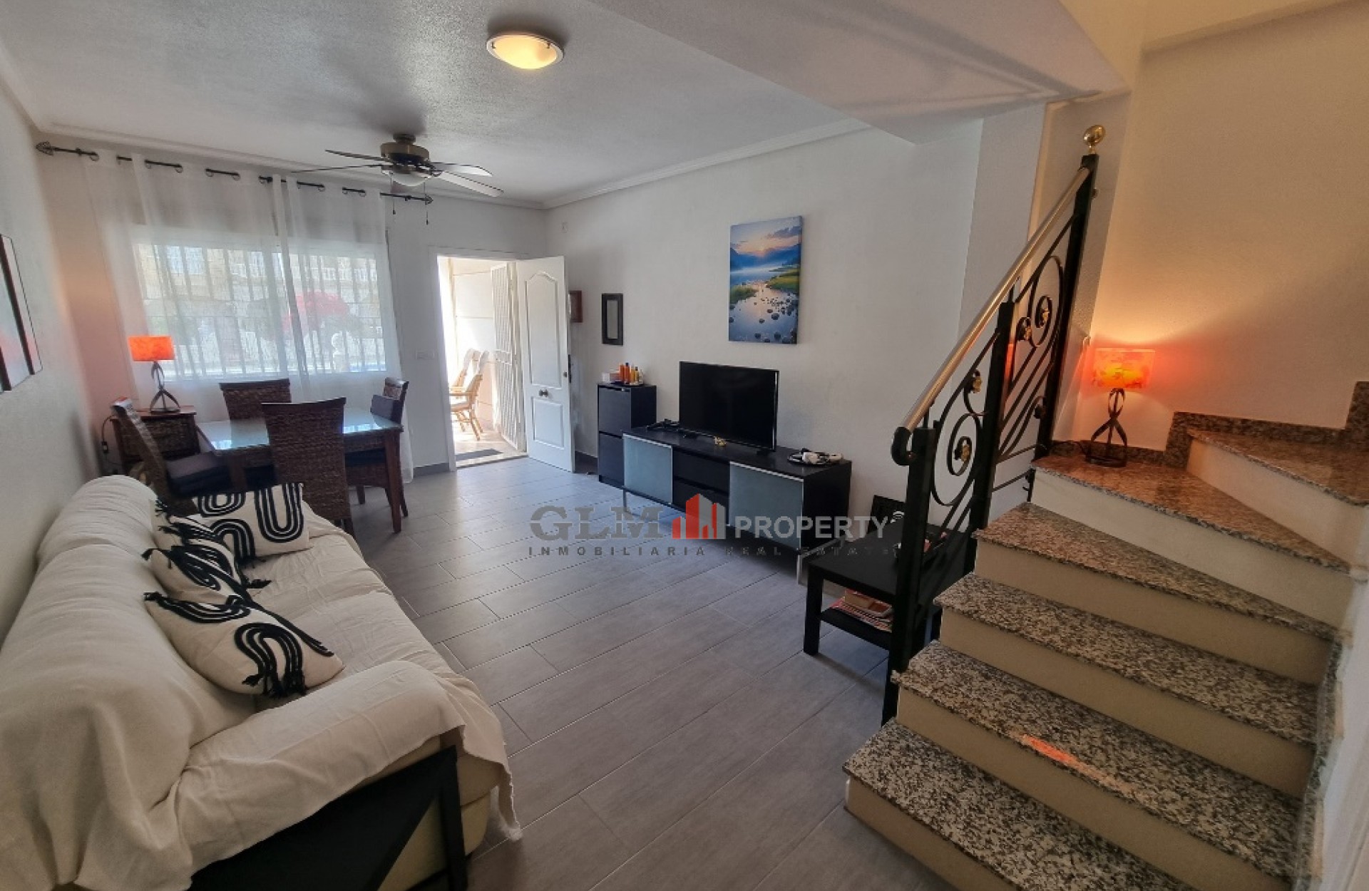 Discover this delightful south-facing townhouse in the sought-after Playa II Residential area, with stunning views overlooking the pool. Entering through front terrace you come into the lounge /diner are, 1 toilet and fully fitted independent kitchen with access to the front terrace. Step outside through the exit door to the back terrace, which features a handy storage room, ideal for keeping your outdoor essentials organised. Upstairs, find two well-proportioned bedrooms complete with fitted wardrobes and private balcony and bathroom. Just a few minutes' walk from the central square, this townhouse is ideally situated close to supermarkets, shops, cafes, restaurants, and banks. Plus, the beautiful beach is only about a 10-minute stroll away, offering endless opportunities for sun and sea. With both front and back terraces, there’s plenty of outdoor space to enjoy.