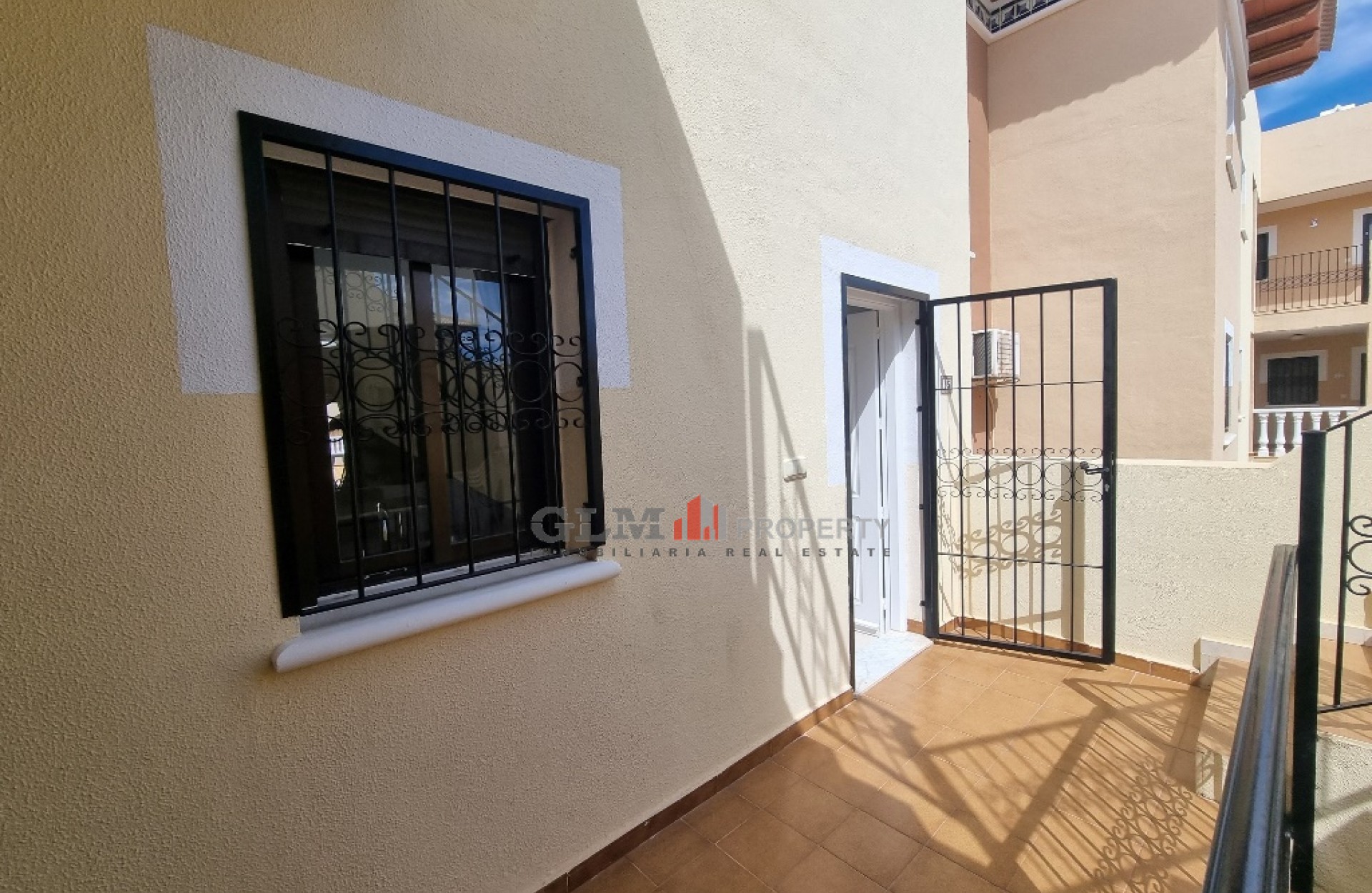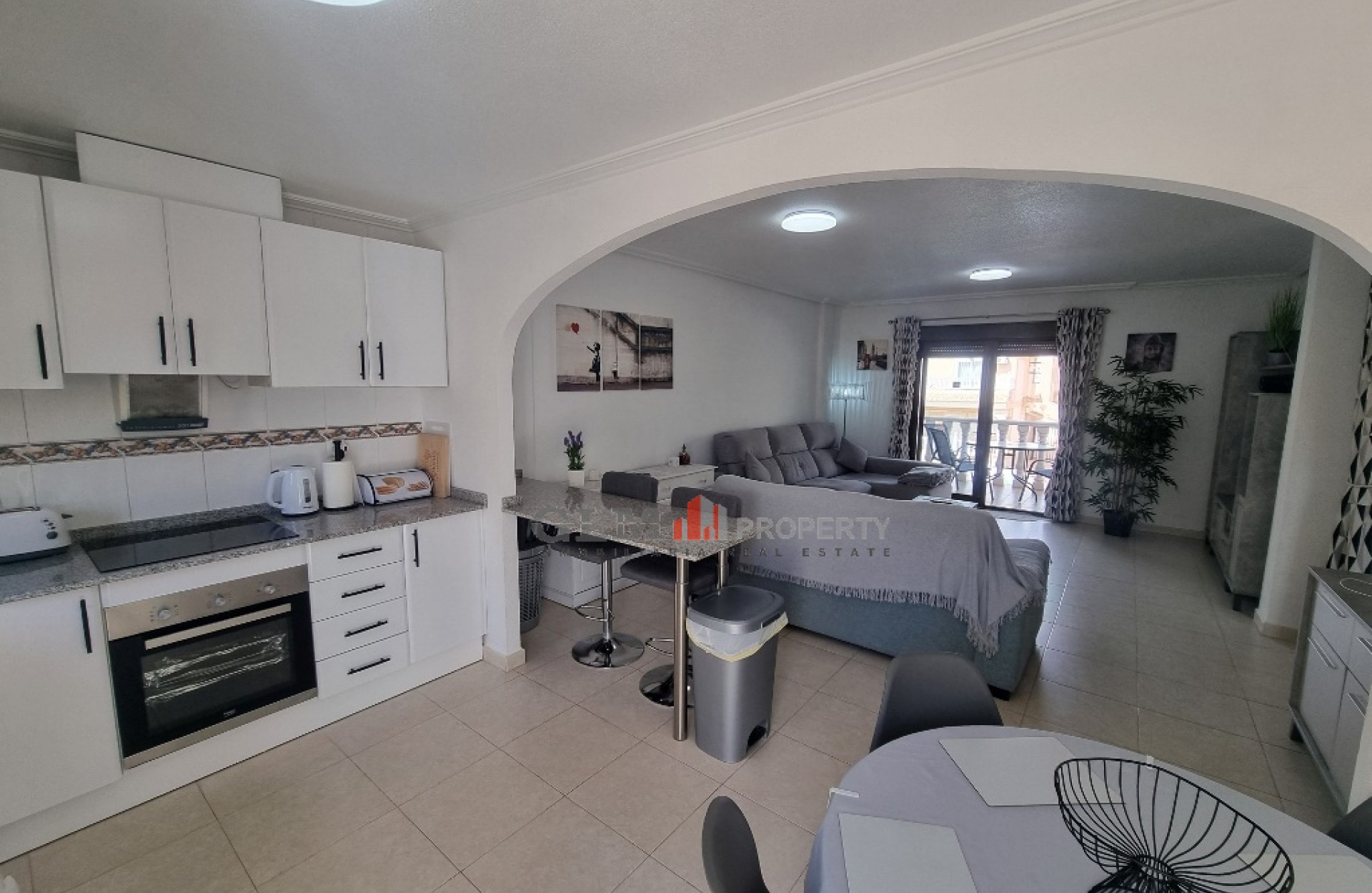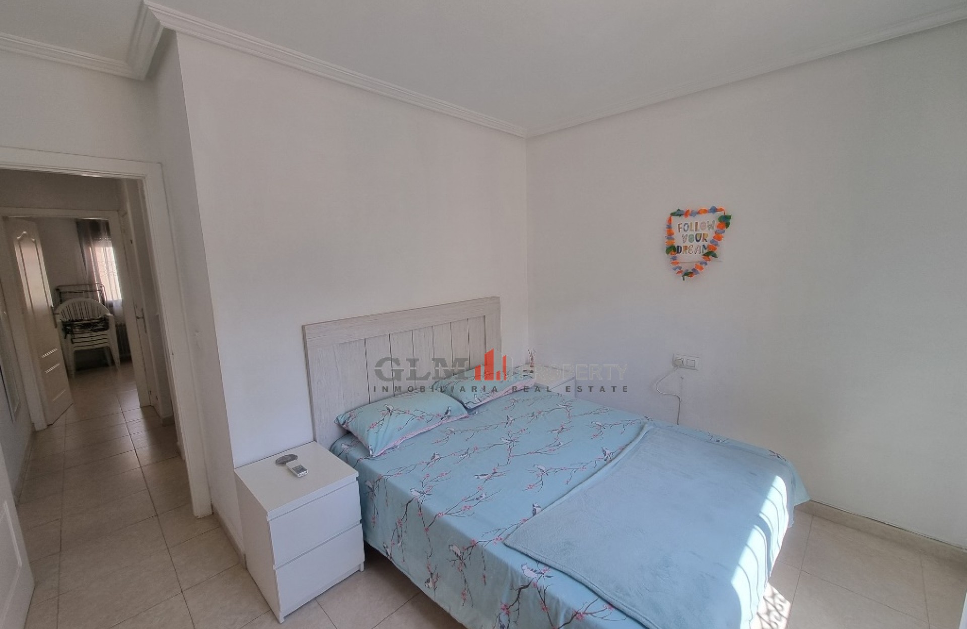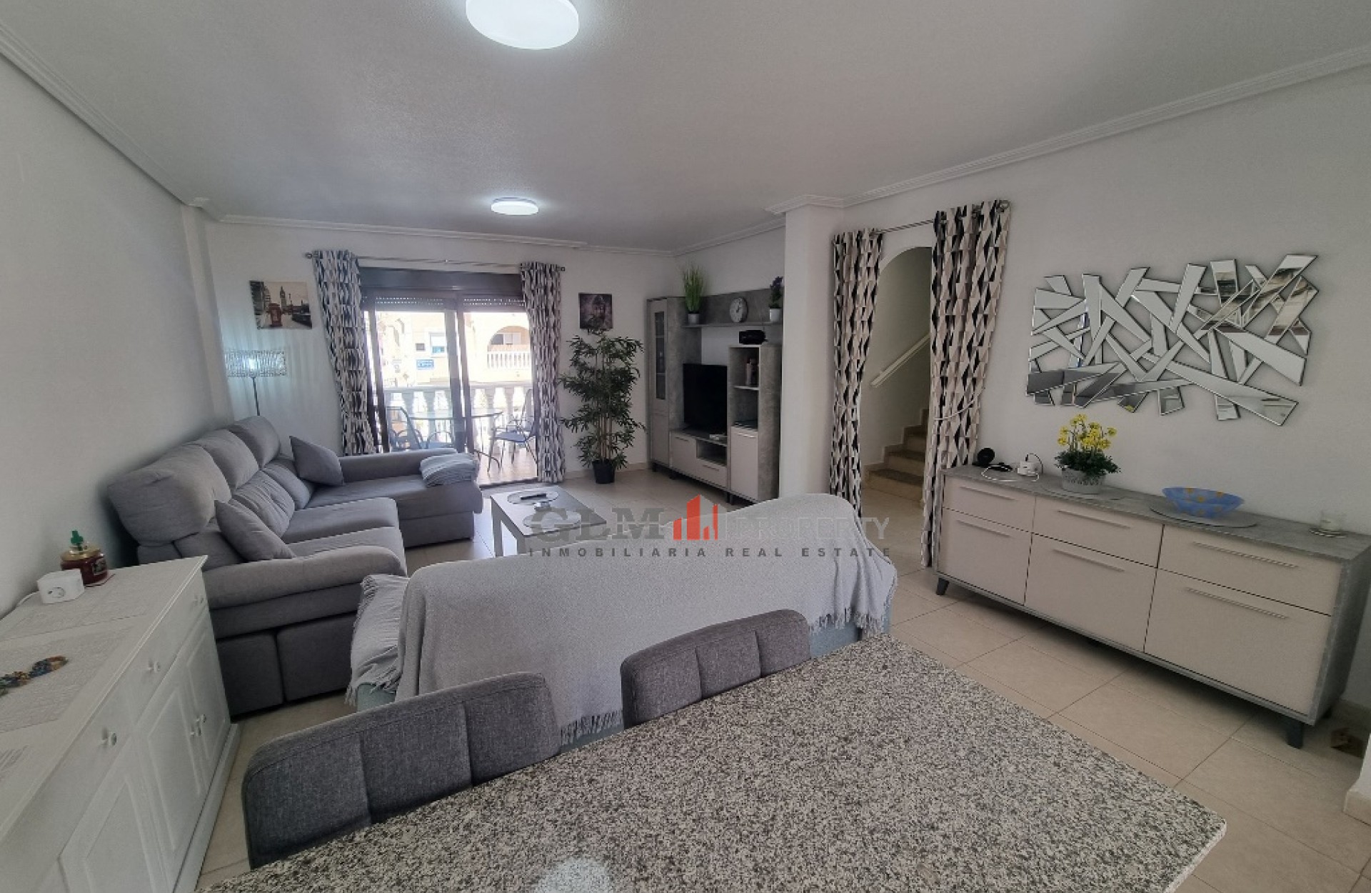 This spacious penthouse apartment, set over two floors, is located in the popular residential complex Playa III in Los Alcázares. Offering a generous built area of 110 m², communal swimming pool .On the first floor, the property features a bright lounge with an American-style open kitchen and access to a balcony, ideal for enjoying the Mediterranean climate. This level also includes two comfortable bedrooms with fitted wardrobes and a family bathroom. An internal staircase leads to the second floor, where you will find a third bedroom, an additional bathroom, and a large private solarium. The property is offered partly furnished and was built in the year 2000.