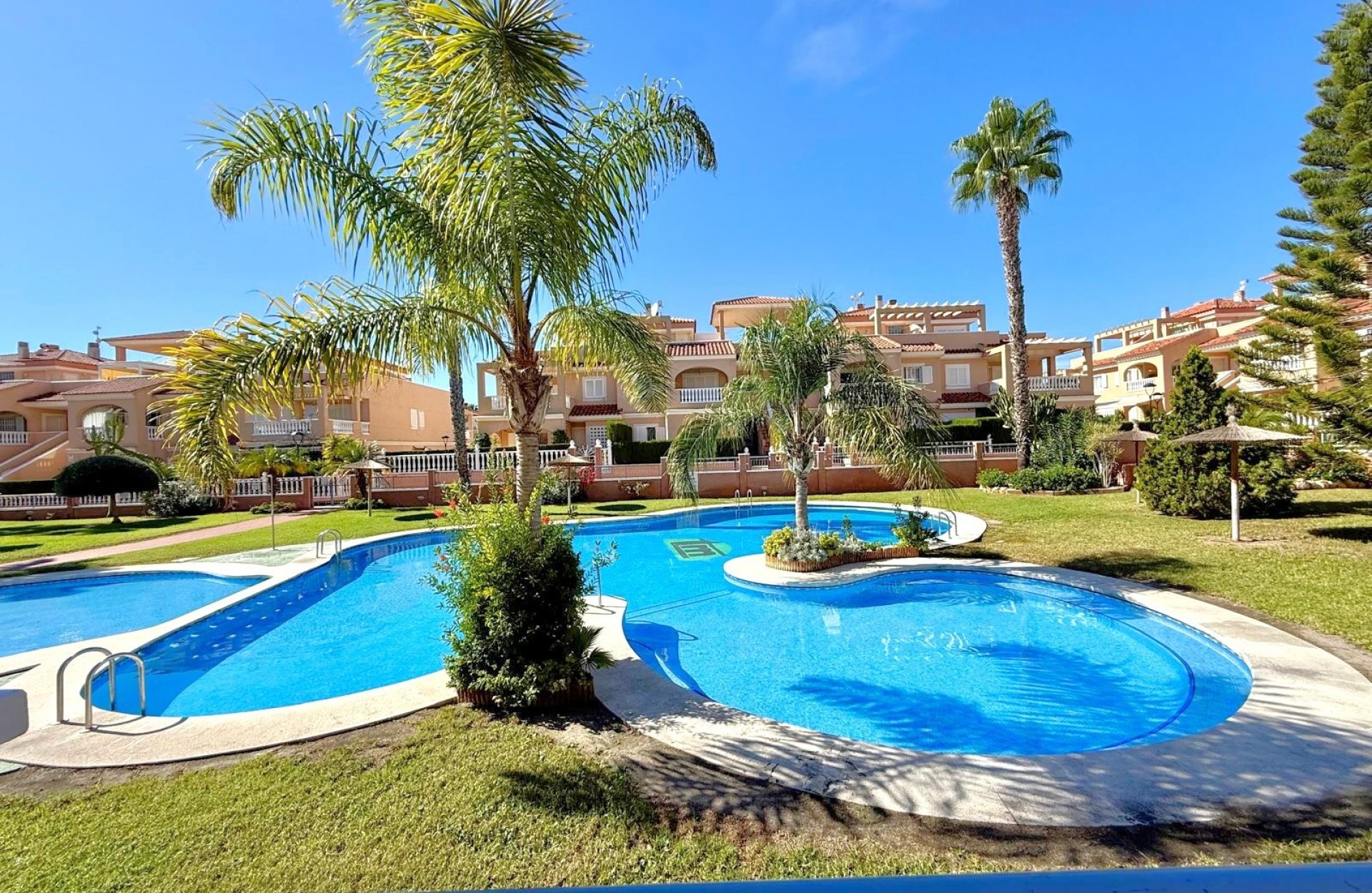 Bright and south-west facing top floor apartment in the popular residential area Zeniamar. The apartment overlooks the superbly maintained and large communal pool- and recreational area. The apartment distributes over an open plan sitting-, American bar kitchen area onto a large balcony, a laundry, 2 bedrooms and a family b bath. The upper floor consists of large enough landing area to give room for a double bed as well as a 2nd bathroom. The solarium which gives almost total privacy from neighbours offers both sun and shade. The property comes fully furnished, equipped and with AC. Price: 245.000 €Yearly community fee: 500€ (approx.)Yearly council tax: 300€ (approx)