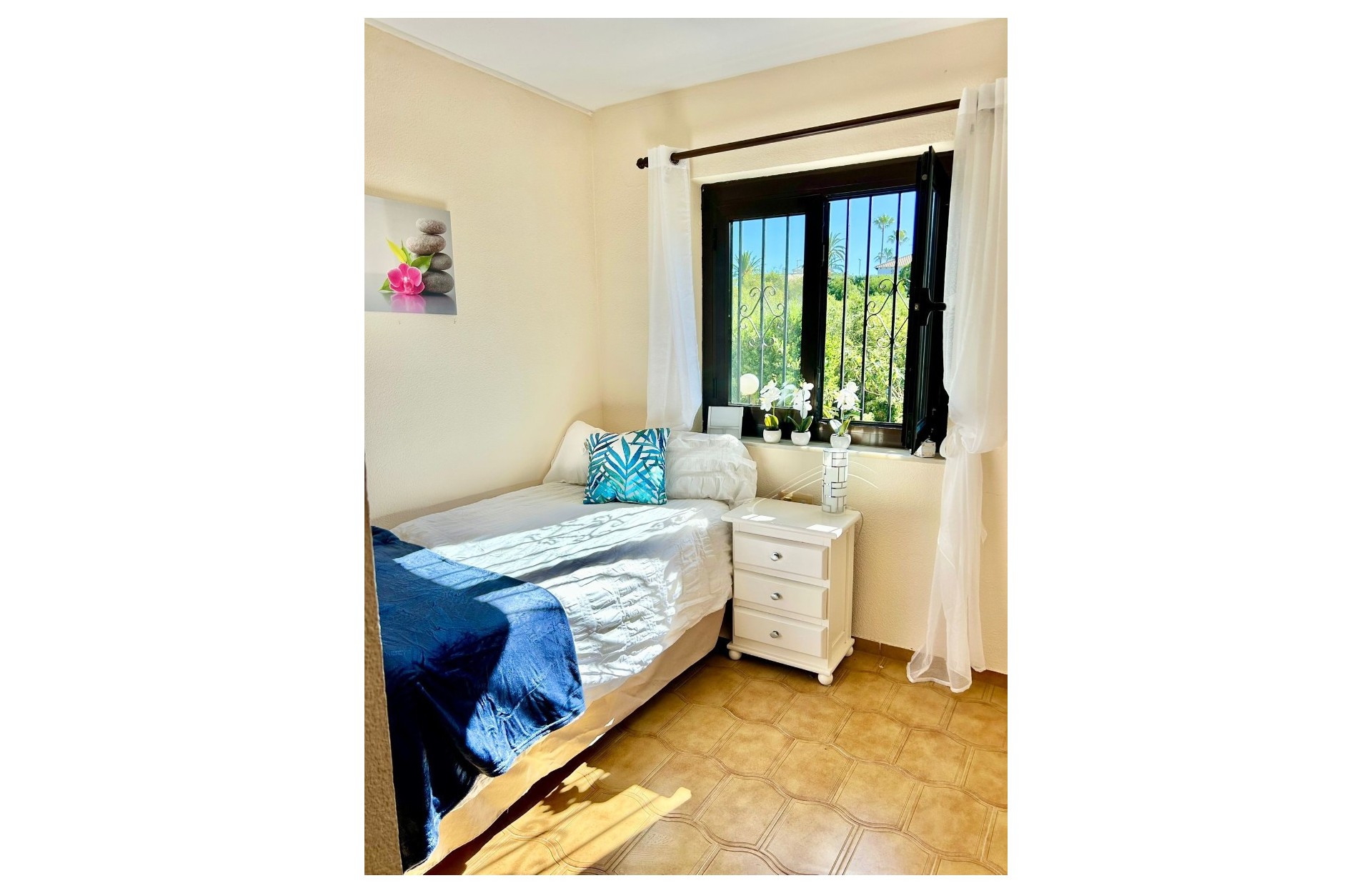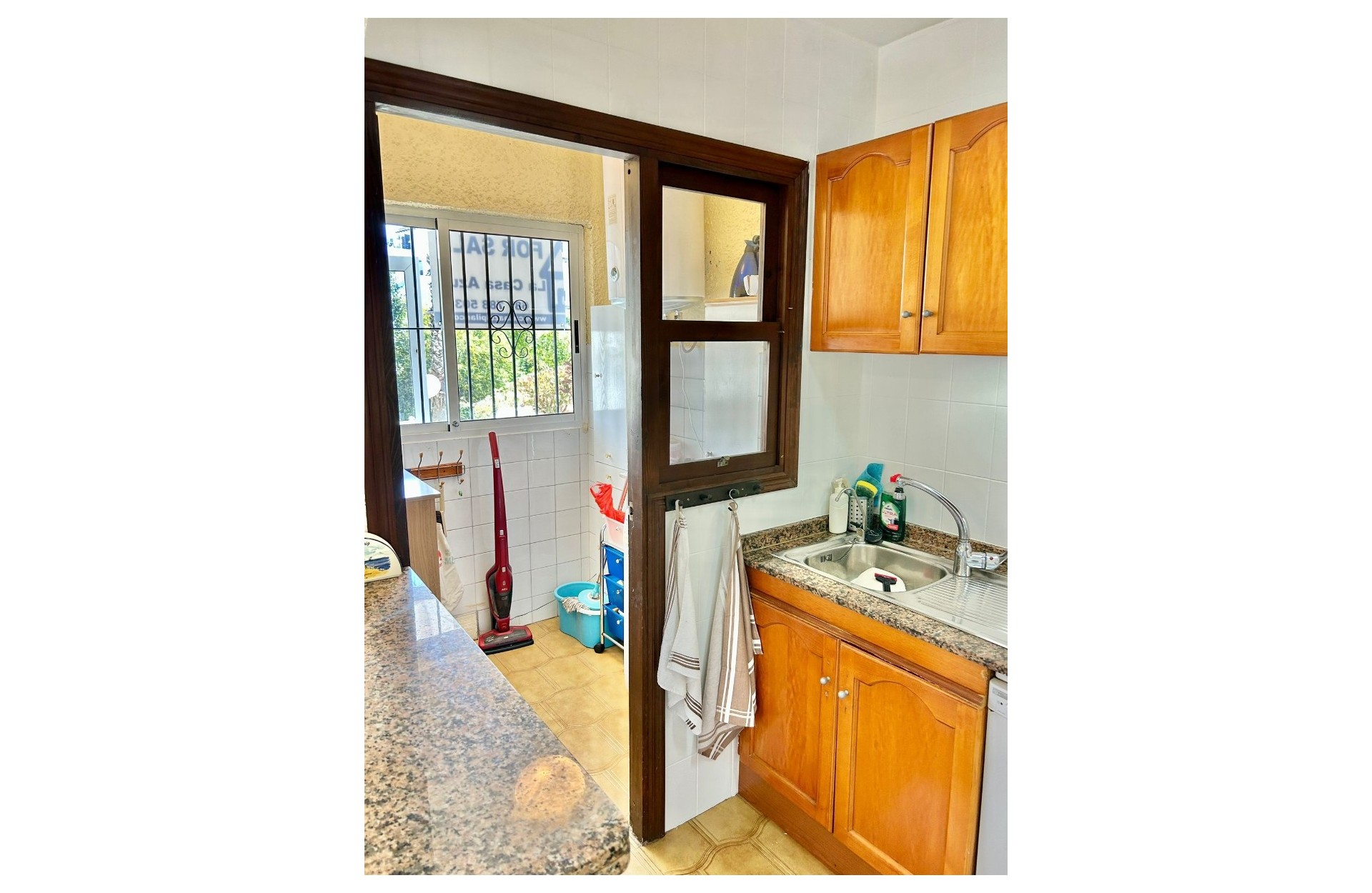 Current owners has loved and made many memories during the last 37 years and it’s time to pass it over to a new family. Southfacing so sun all day. Communal pool is just a few steps from your garden. A glazed in conservatory with open views over the greenery, open plan kitchen with a big and bright utility room. Lounge area has sliding glass doors to the sunroom and also have a fireplace. The bathroom is original but with a brand new shower. Double glassed windows, alarm, A/C and sold furnished. 2 bedrooms with built in wardrobes. Sol y verde (sun and green) is a very suitable name for this gated urbanization with its lovely gardens and with locked parking. And it’s a short stroll to the beach, convenient store and Cabo Roig strip with all the bars and restaurants.