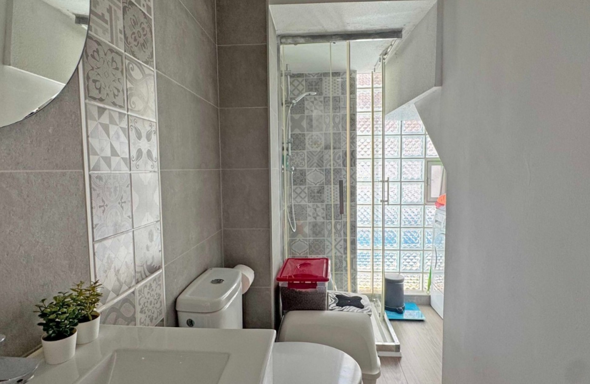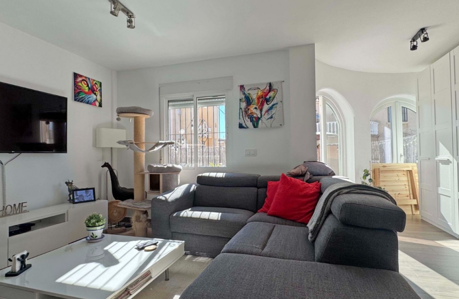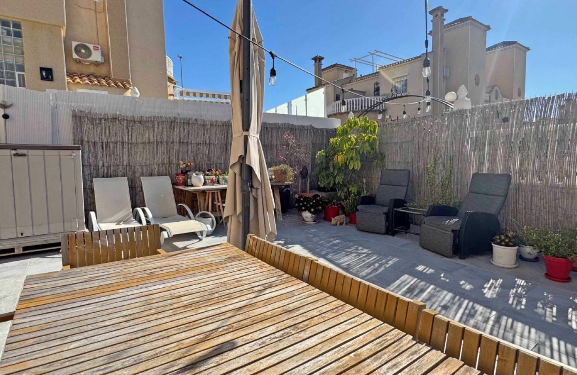 Located in the sought-after Zodiaco V community, this beautifully renovated Zodiaco-style quad villa is an excellent property for sale in Villamartín Orihuela Costa, offering modern living, generous outdoor space, and a fantastic Mediterranean lifestyle close to all amenities. The property has been completely refurbished throughout, including new flooring, modern kitchen, updated bathrooms, electrics, plastering, and contemporary lighting, creating a stylish and move-in-ready home. Set on a spacious private plot, the villa features a large tiled terrace and a private swimming pool with heated Jacuzzi section, perfect for enjoying the Costa Blanca climate all year round. The outdoor space provides plenty of room for sunbathing, outdoor dining, and entertaining guests. Residents also benefit from access to a communal swimming pool within the urbanisation. Inside, the ground floor offers a bright lounge-dining area, a modern fitted kitchen, and a contemporary bathroom with walk-in shower and utility area. Upstairs you will find two double bedrooms with fitted wardrobes and a fully renovated family bathroom. The master bedroom enjoys access to a private balcony. From the landing, stairs lead to the private roof solarium, finished with artificial grass and offering an ideal space for relaxing or entertaining. On this level there is also an additional air-conditioned room, perfect as a third bedroom, home office, or storage space. The villa is located just 500 metres from shops, bars, restaurants, and public transport, while La Fuente commercial centre, Villamartín Plaza, Zenia Boulevard, and several championship golf courses are all within easy reach. Thanks to its excellent location and full renovation, this property is ideal as a home near golf courses and the beaches of Orihuela Costa, and represents an excellent holiday home or investment property in Costa Blanca South.